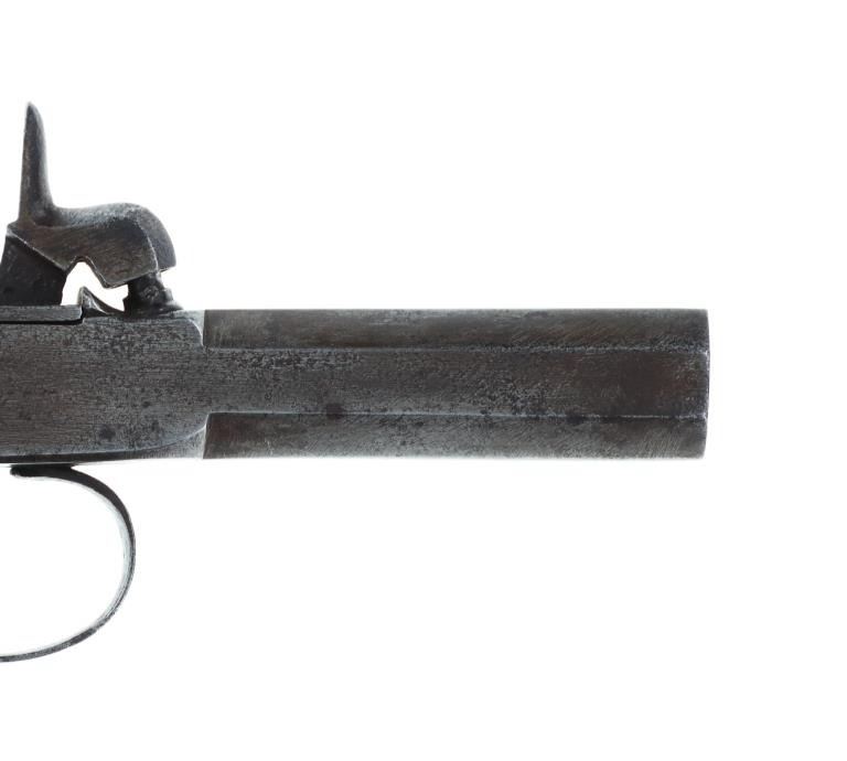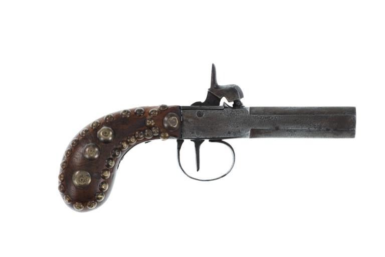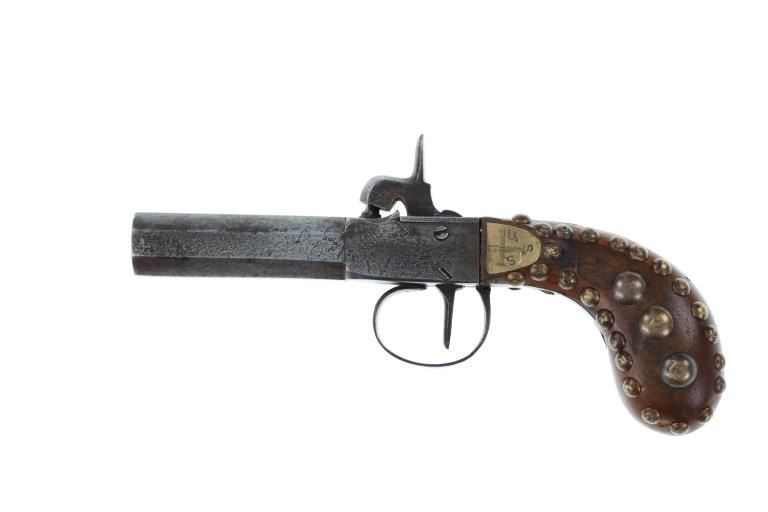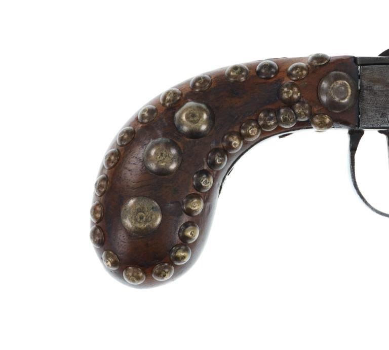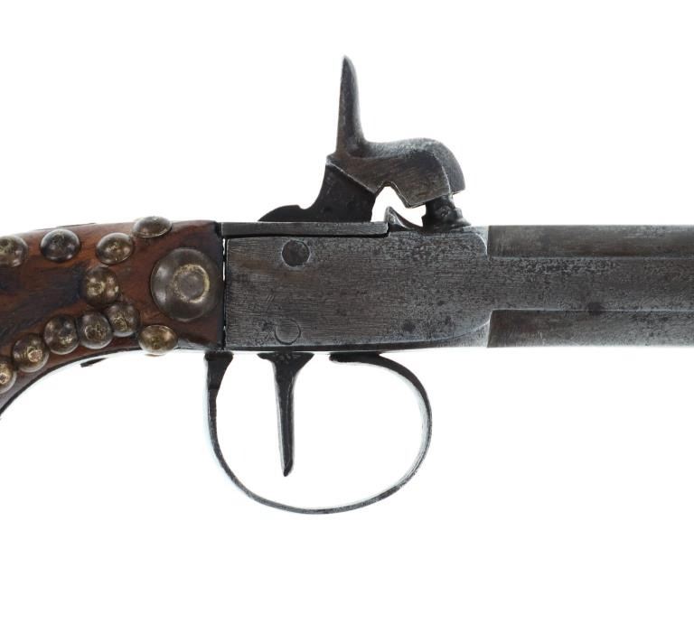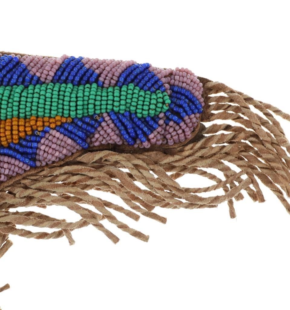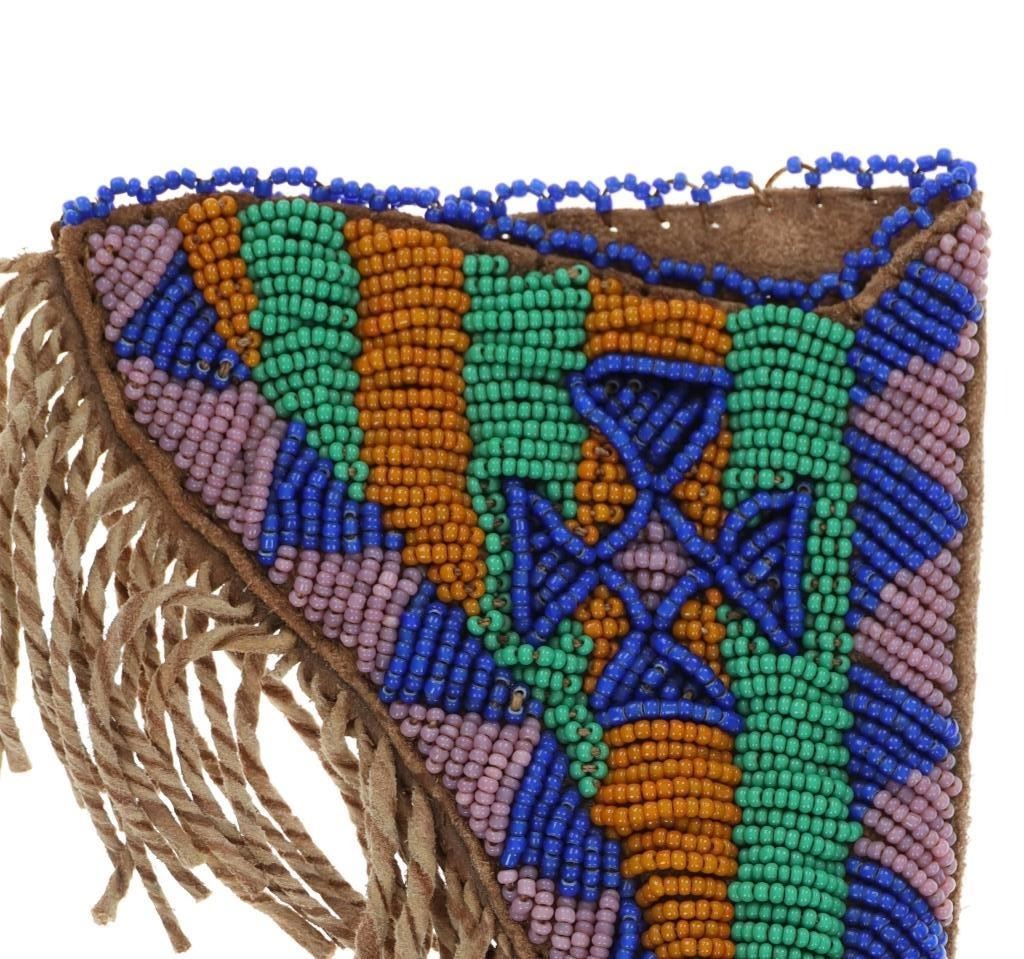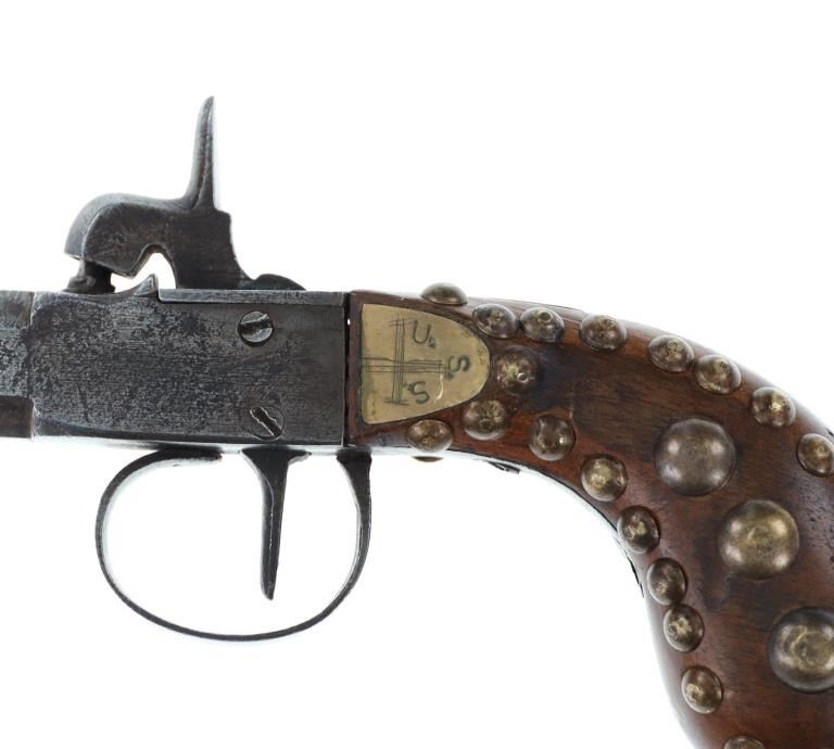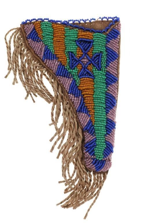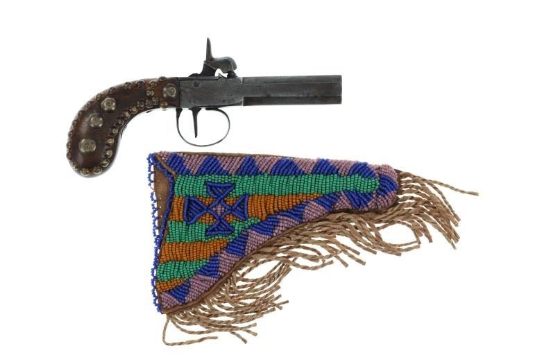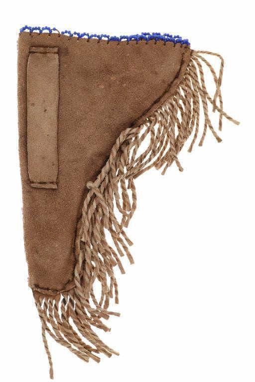The lot features a beaded Buffalo hide pistol holster from the Plains Indians paired with a wonderful 19th Century Indian tacked percussion cap dueling pistol. The gun is said to be from the mid-19th Century chambered in .54 caliber with a percussion cap and ball exposed top hammer, unmarked. The walnut handle is decorated with various sizes of brass trade tacks. There is a brass plate on the left side which is stamped U.S.S. along with a cross etched showing three bars each direction as well as three bars on each end. The U.S.S. is said to stand for the United State Scout of the Unite States Indian Service. It is said that all Indian scouts employed by the Indian Service had to have their weapons, knives, outfits and other accouterments stamped for proper identification of gov’t property. The pistol exhibits an octagonal barrel which bevels into a squared off receiver with percussion hammer on top, trigger guard loop below with a single flat blade trigger and broomstick downward turned pistol grip handle behind. The hammer pulls back and trigger releases it, appearing to function. Nice original patina with amazing original Indian brass trade tacking. The pistol is paired with a nice Indian tanned Buffalo Bison hide holster with twisted hide fringes and wonderful geometric beadwork. The beadwork shows a Maltese like cross at the center with triangle geometric border and banded center. The beads are all old glass trade seed beads in colors of greasy Cheyenne pink, medium green, butterscotch yellow, and blue white heart. The back side of the sheath has a belt loop. The sheath is likely from the Sioux of the Northern Plains. Provenance: From the Gary Henderson collection of Ohio. Pistol has a total length of 7 inches in length. Sheath is 6 inches in length not including the fringe.