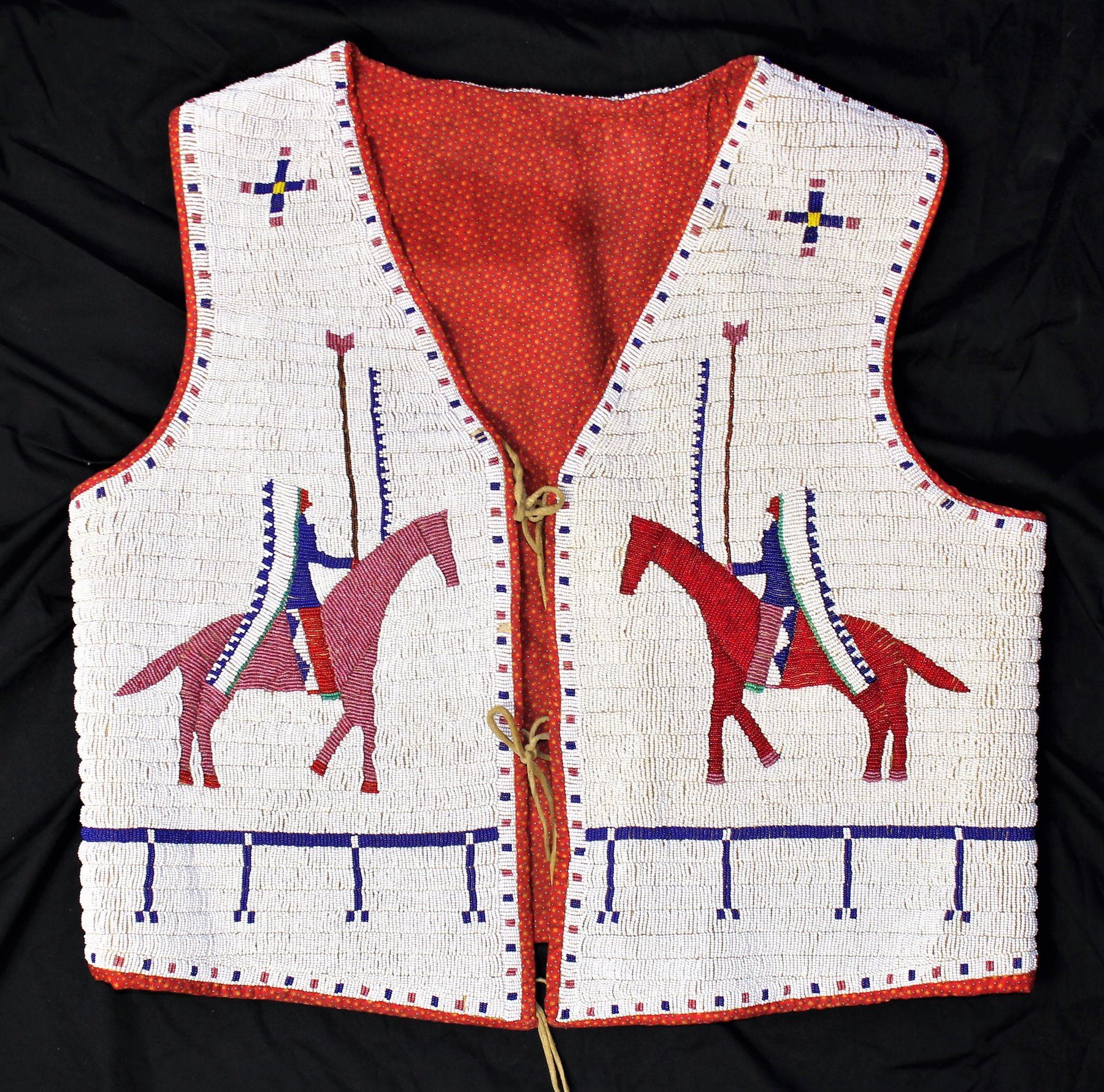 Circa 1930's pictorial men's vest, lined, lazy stitched and beaded with figural high neck horses. Approx. size 42. With great eye appeal and condition.
