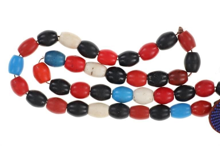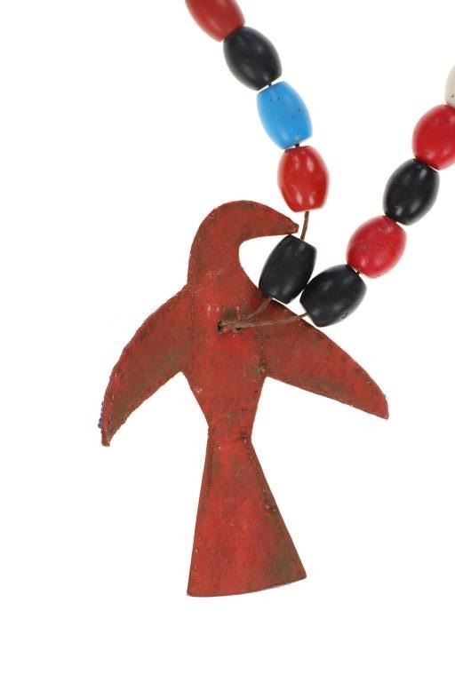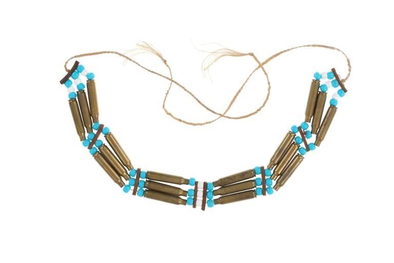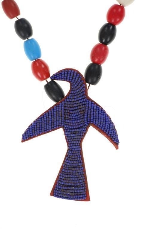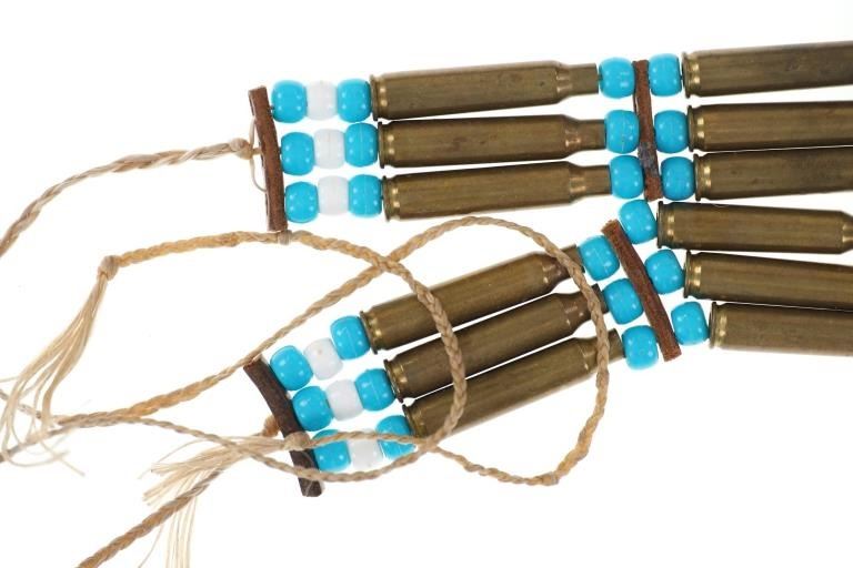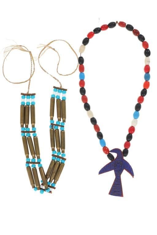 The lot features two Plains Indian beaded necklaces, one a Ghost Dance revival style beaded waterbird and the other a choker style necklace with brass rifle casings. The first example shows the Ghost Dance style waterbird symbol beaded bird that is about 4-inches and has a circumference of 27-inches. The other shows 18 brass rifle casings with leather gaskets and beads that is about 16-inches.