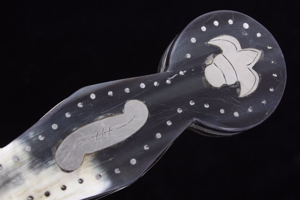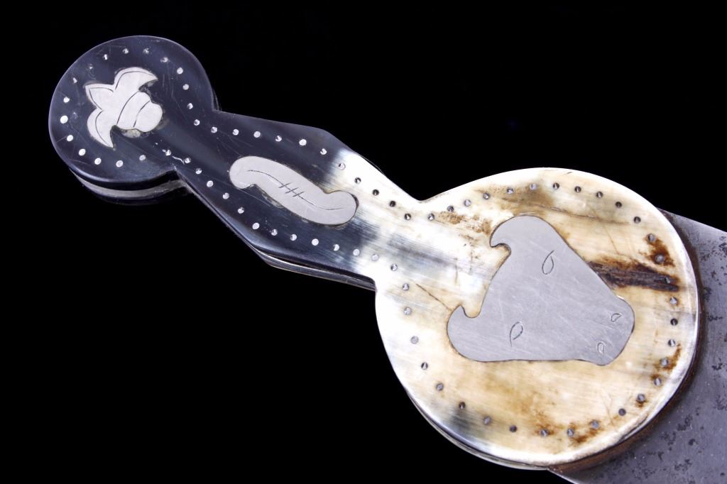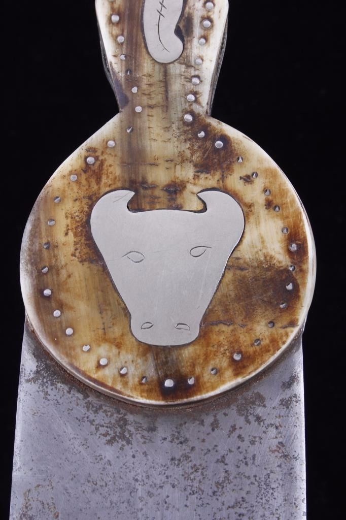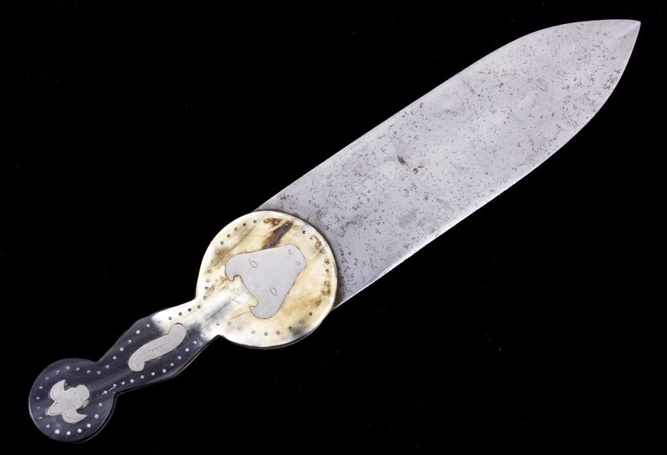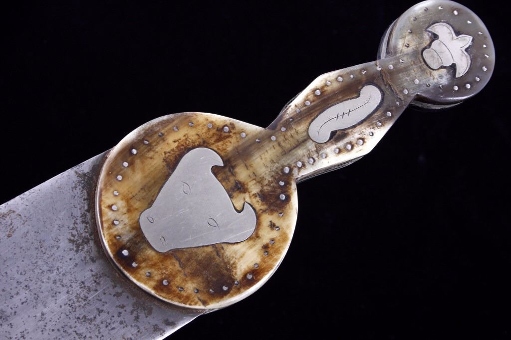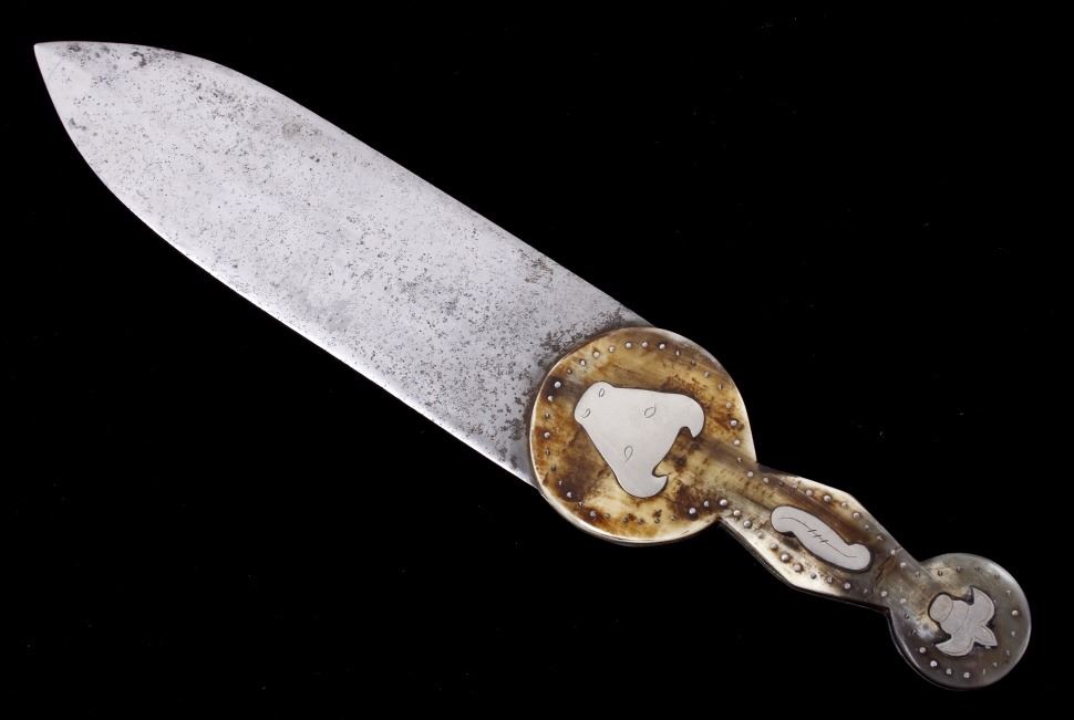 This is an exceptional example of an original authentic Beaver Tail or Beaver Back Dag Knife from the Plains Native American Indians. The piece dates to the early to mid 19th century and is attributed to manufacturer Jukes Coulson & Co. The knife is not marked, but shows the correct craftsmanship and styling to be by the London Arms company, Jukes Coulson & Co. Provenance: From the extensive Native American & Tribal Arts collection of Harada Fumihiko and Alin Avila. It was purchased from the 6/6/2014 Binoche Auction (represented as such). The immensely unique knife shows the typical wide tapering rounded dagger-shaped blade with double edge with an incredible Steer/Cow horn grips having silver spot inlay framing the edge, a silver Steer head, accent, and fleur de lis along both sides. One of the finest examples of an early period dag knife available for sale. Overall length 13.5”L x 2.5”W and ½” to 9/16” thick. Silver has been modernly polished. Excellent original early piece.