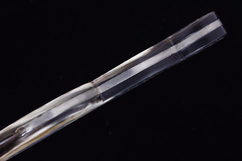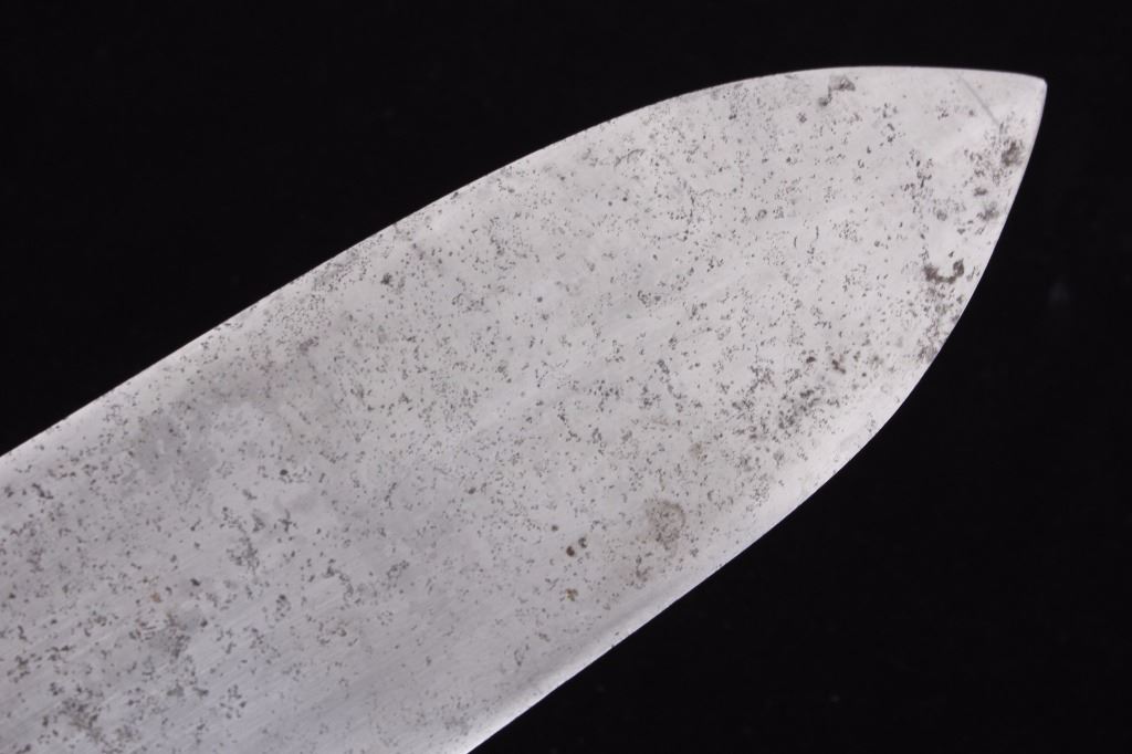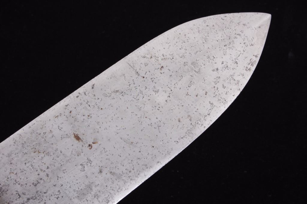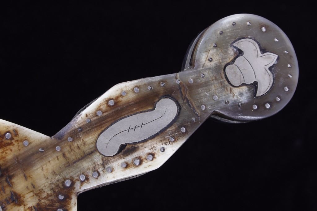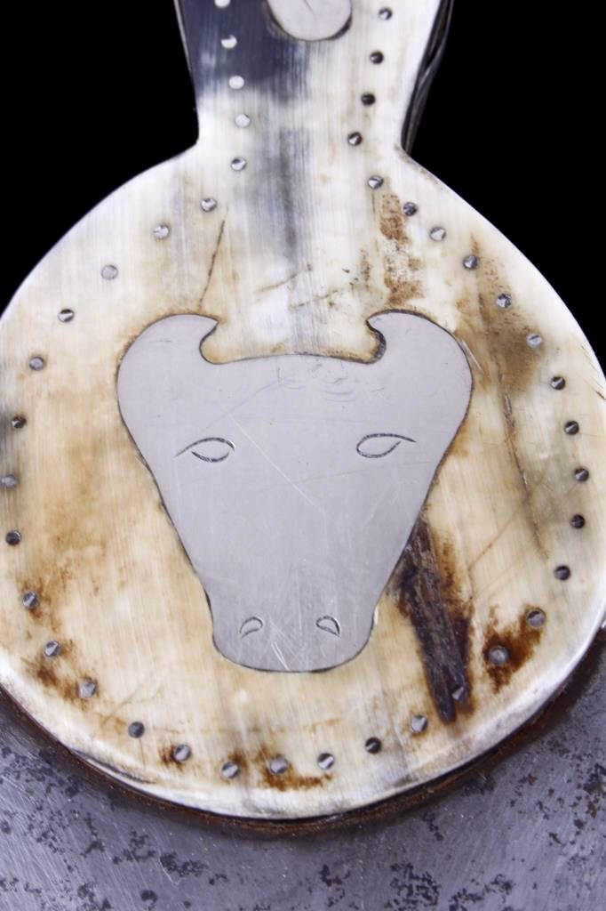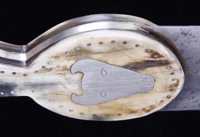 This is an exceptional example of an original authentic Beaver Tail or Beaver Back Dag Knife from the Plains Native American Indians. The piece dates to the early to mid 19th century and is attributed to manufacturer Jukes Coulson & Co. The knife is not marked, but shows the correct craftsmanship and styling to be by the London Arms company, Jukes Coulson & Co. Provenance: From the extensive Native American & Tribal Arts collection of Harada Fumihiko and Alin Avila. It was purchased from the 6/6/2014 Binoche Auction (represented as such). The immensely unique knife shows the typical wide tapering rounded dagger-shaped blade with double edge with an incredible Steer/Cow horn grips having silver spot inlay framing the edge, a silver Steer head, accent, and fleur de lis along both sides. One of the finest examples of an early period dag knife available for sale. Overall length 13.5”L x 2.5”W and ½” to 9/16” thick. Silver has been modernly polished. Excellent original early piece.