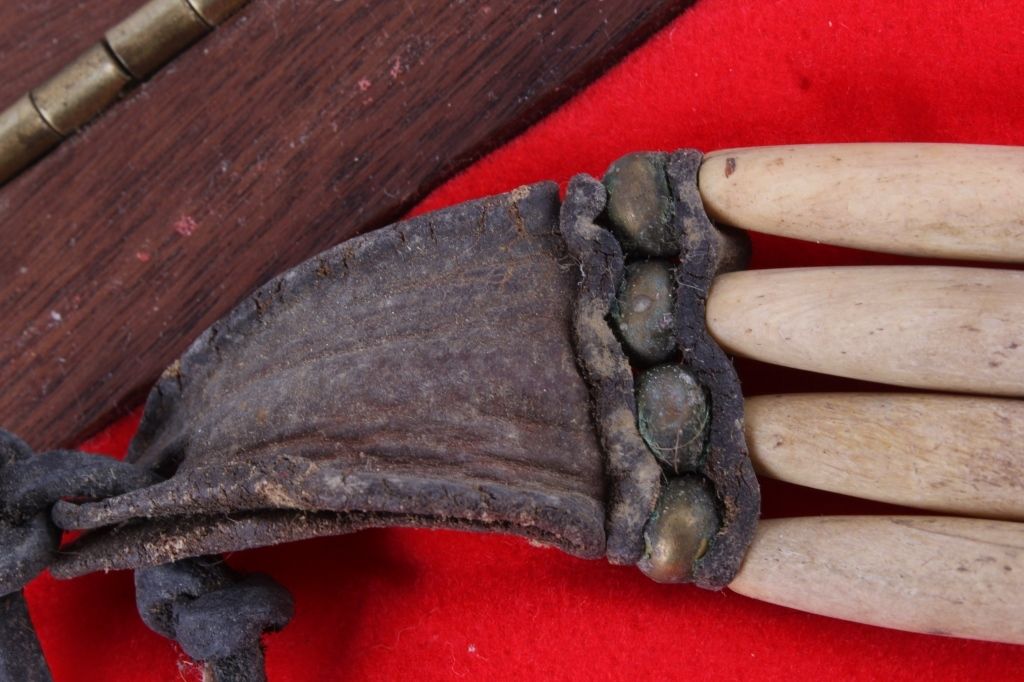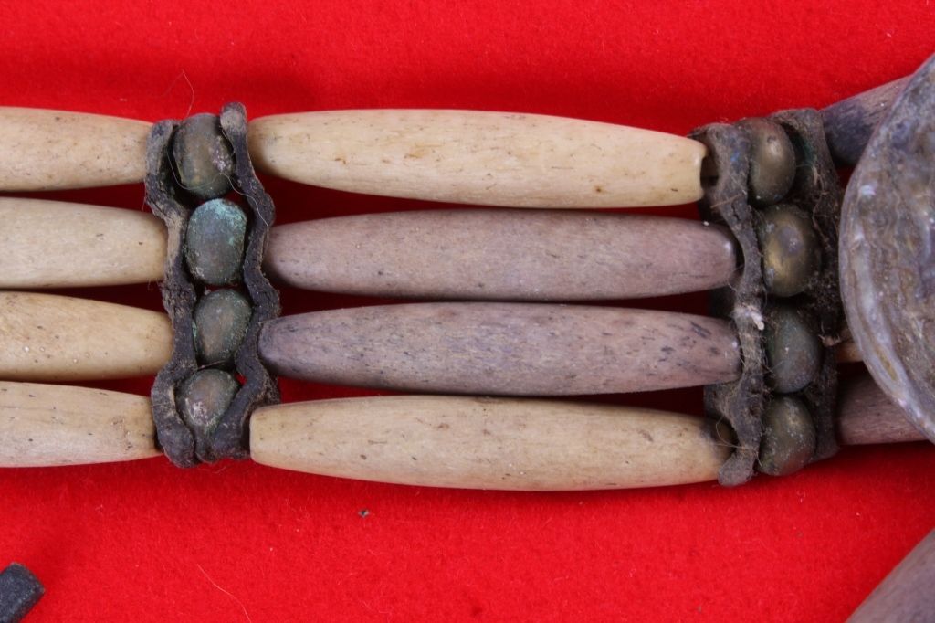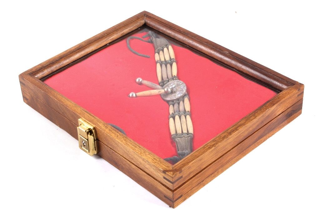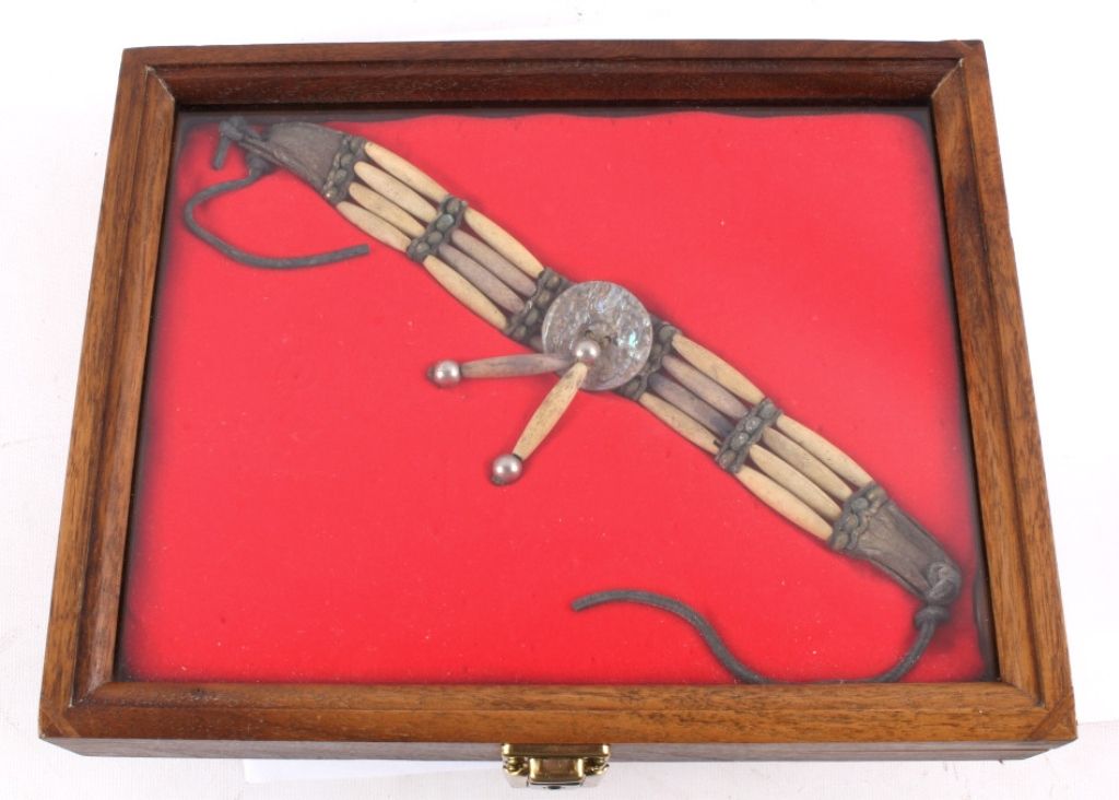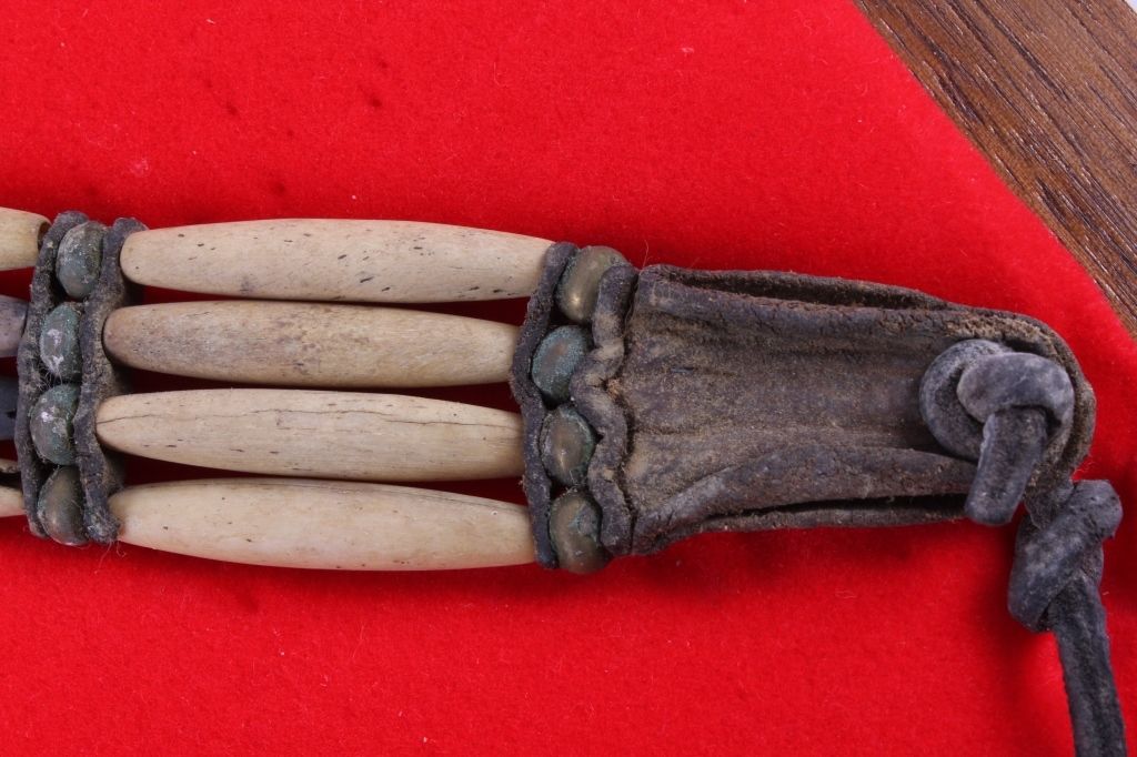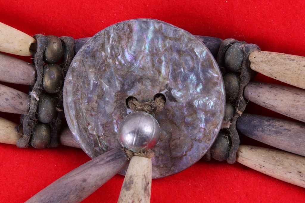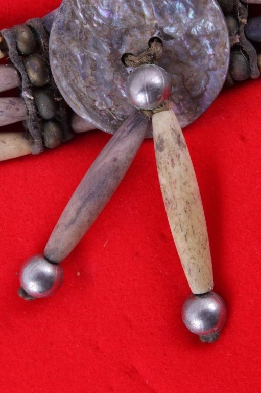 This is a very rare and early Plains Native American Indian Bone Hair Bead "Choker" Necklace from circa 1880. The piece shows 24 brass trade balls, 20 hair bone beads, and 3 pure silver balls, along with a abalone center medallion. This is a museum quality piece and comes in a solid wood and glass display case. Chocker measures 22" long. Box measures 9.5"x11.75"x2"