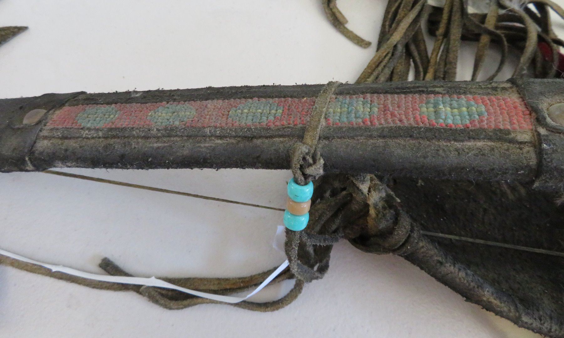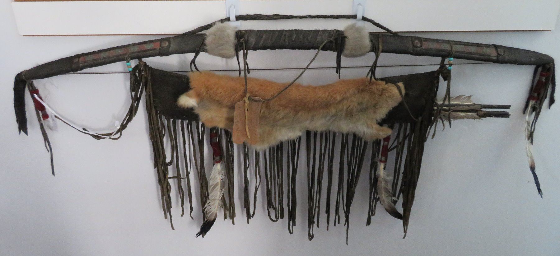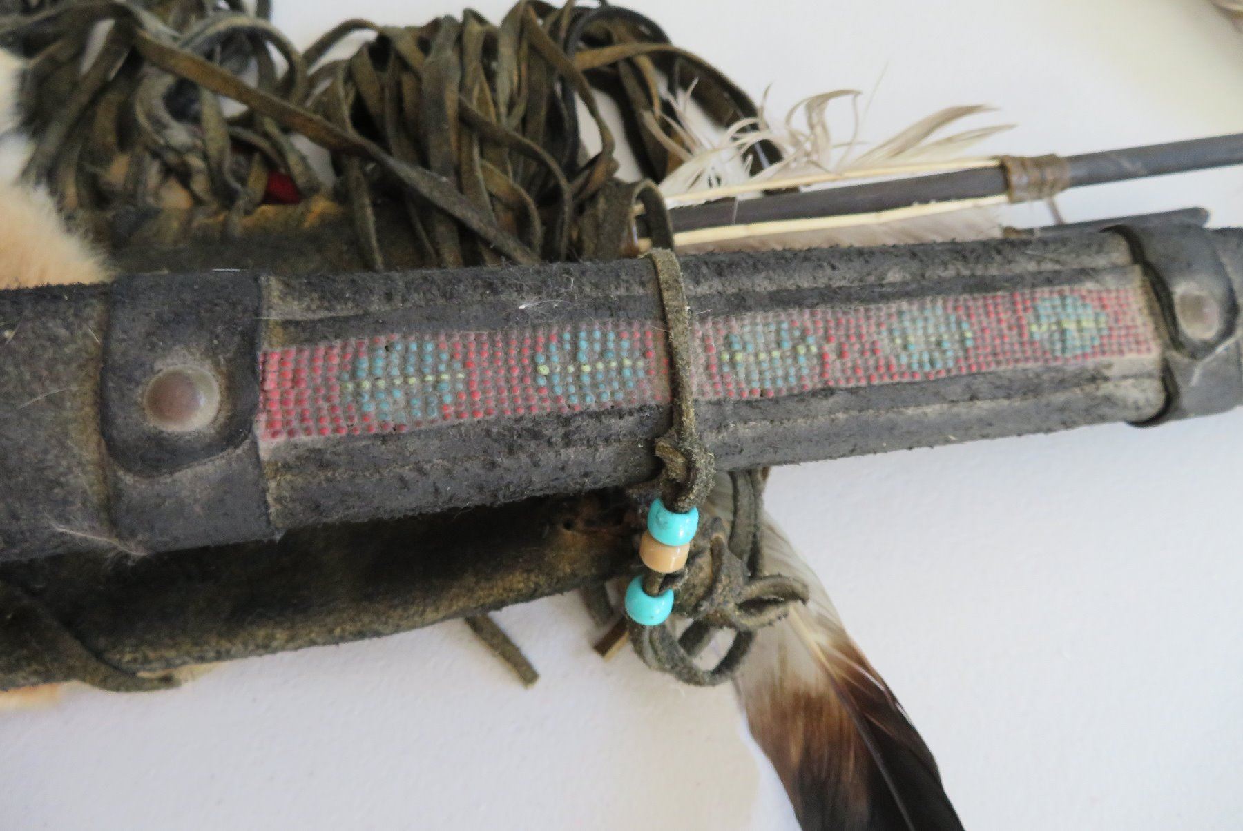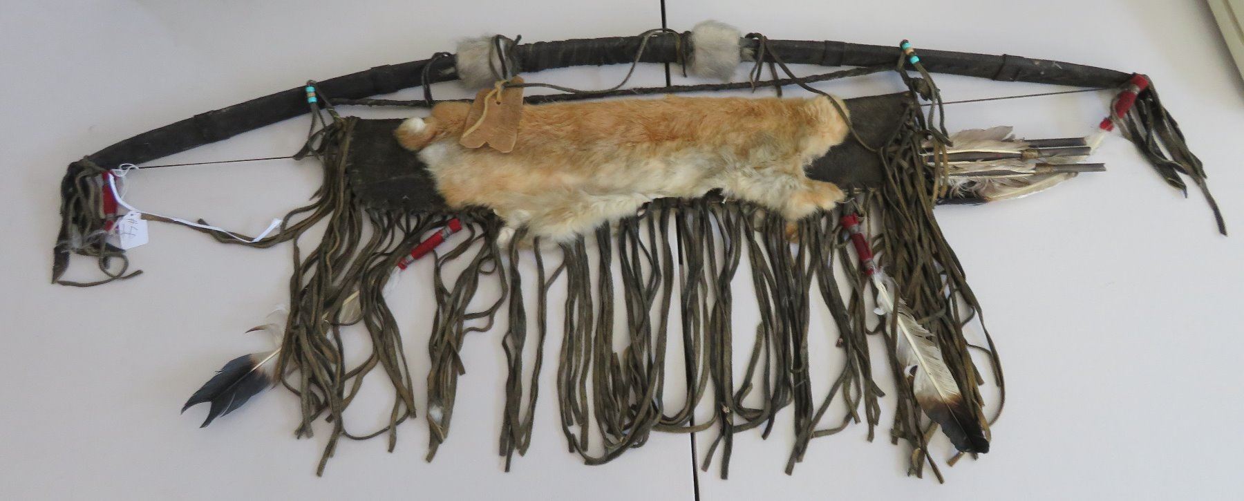 Plains Bow & Arrow Set, 20th century items. Made of wood, arrows with feathers, buckskin quiver, the overall length is 47" x 1 1/2". Plains, Sioux. Condition: Good, some signs of wear, see images. Shipping: $60.00 USA estimate only, due to size and weight, w/insurance and signature.
