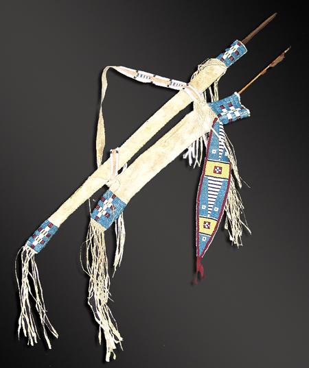 Circa Late 1900s, Very nice traditional style elk hide cases with lazy stitch beaded designs and long beaded tails, includes a hardwood bow and arrow. Excellent condition. 21" x 3" quiver, 38" bow