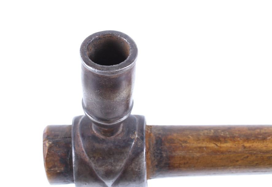 The lot features a wonderful engraved pipe tomahawk with diamond cutout from the Western Plains Native American Indians with quilled hide drop, all dating from circa 1850. The tomahawk head is forged iron in the typical Plains large type showing a diamond cutout at the center of the blade, rear facing small spur, forge molded steps, smooth curved eyelet with tear drop eye, forge molded filed chevrons with tall thing bowl with single molded band at the top and bottom with beveled body. The blade is wonderful rocker-engraved on both sides; the right side shows a Buffalo head with arrow coming out of the mouth above the diamond and walking Buffalo below walking towards right (front facing), the left side shows horse head turned to the left (front facing) again with an arrow coming from the mouth above the diamond and below full horse walking facing left (front facing). The arrow shows a typical triangular end on a shaft, possibly representative a lance or spear, a truly unique and scarce addition. The head is secured to the wood haft handle with a hide gasket which is still present. The clean out plug hole is present, but the plug is not. The haft itself is plain showing a tear drop shape with smooth back and median edge running down the entire bottom edge of the piece all tapering gradually in size towards the gripping area. The gripping area is covered in Buffalo Indian tanned hide which is sinew sewn and held into place with hide glue and a small iron nail. The front and back edge of the gripping area wrapping shows a wide hide fringe. At the base of the wrap is attached the Buffalo hide drop showing a typical triangular shape which is completely covered along the front with porcupine quillwork in natural cream with an orange border and two blue figures which appear to be human effigy figures, a scarce addition as well. The base of the drop shows a row of hand cut Buffalo hide fringe all having a double fringe wrapped in Porcupine quills in natural cream. The drop is original to the piece and is a fantastic 1850’s piece. The entire piece is attributed to the Sioux, possibly of the Teton Lakota. The piece is very similar to the Engraved Tomahawk from the Sioux brought to sale with a $25,000 value at Cowan’s 2010 sale. The piece is also very similar to several examples in the Harold L. Peterson 1965 book “American Indian Tomahawk” on page 118 figure 188; which is attributed to circa 1860 Oto Indian with engraving. Provenance: From a historic Eastern Montana American Indian Collection, where the piece was found to be an authentic original, one of the finest collections of American Indian weaponry and antiquities in Montana. The piece measure 19”L with a head that is 9 7/8”L by 3.5”W blade by 1 5/8” thick.