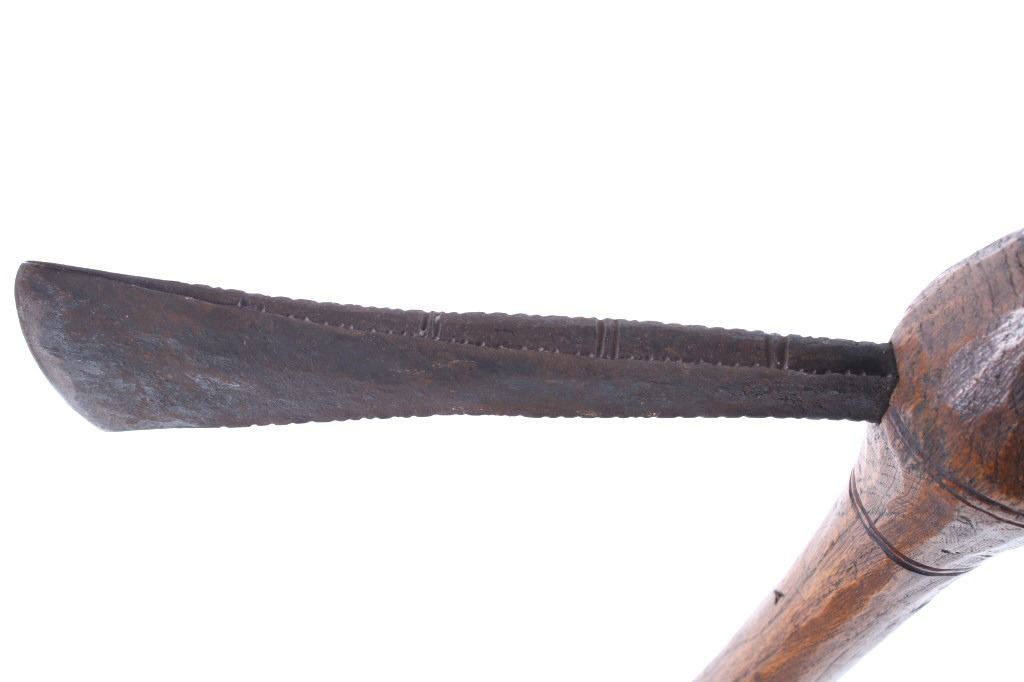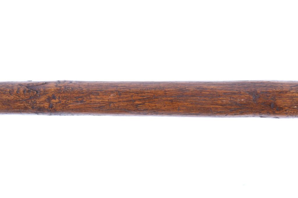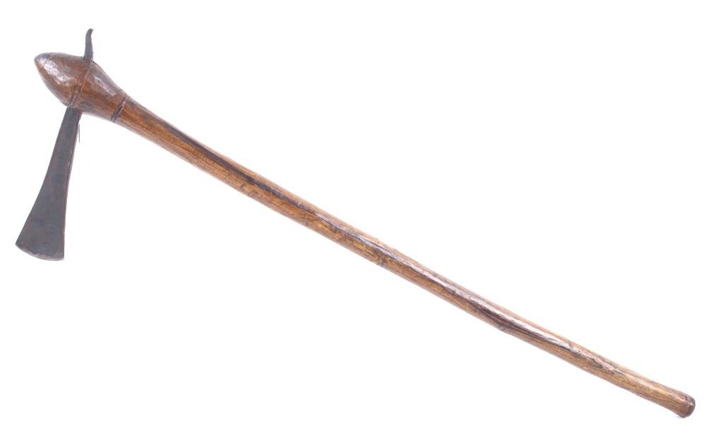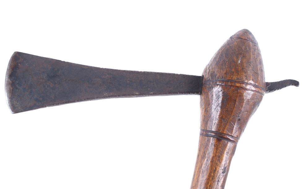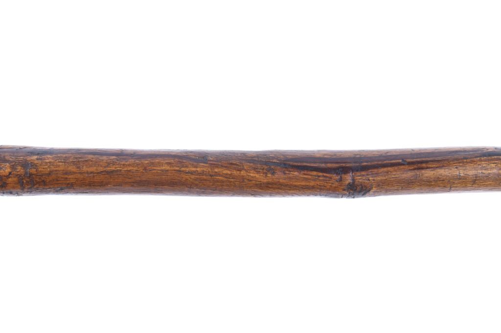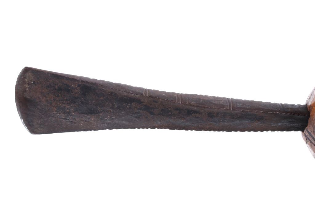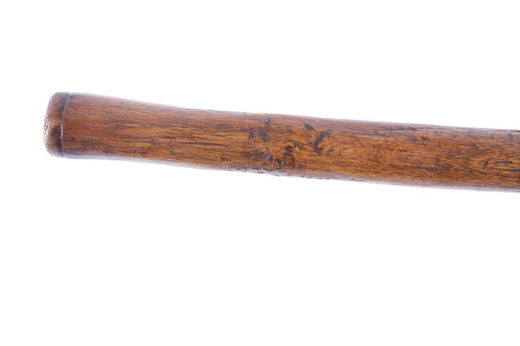 This is an exceptional early Celtiform ball head war club tomahawk dating to the 18th century from the Eastern Plains Native American Indians. The piece shows a root ball head war club with forge iron blade which is firmly secured in the head as if it had grown there. The use of iron for the blade indicates that the piece is a post-contact specimen and the workmanship suggests that the entire war club, including the blade, is of Indian manufacture. This places the piece at being from the 18th Century. Similar examples of Celtiform war clubs can be seen in Harold L. Peterson’s “American Indian Tomahawks” on page 101, pictured / figure 102, 103 and 104. These examples are attributed to the Indians of Oklahoma with this example very well originating from there as well. The blade has a tapering widening blade which then tapers at the back to a spike, making this Celtiform war club one of the earliest examples of a crude Pike Tomahawk or Spike Tomahawk. Various blacksmith folds, hammer marks and other techniques of blacksmith manufacture or working can be seen on the iron. The outer edge of on both sides has an engraved rolled edge which extends on both sides along with forged molded and filed lines on the flat outer and under edge. The haft handle has a rich patina from honest authentic age and use, with this being a very solid and heavy example. The entire wood surface has a shiny patina from much age and use and the metal has a deep chocolate brown patina from the same. This is truly a fantastic early example with amazing Celtiform design as it would have been a formidable weapon in its time. The haft also shows incised carved lines along the head and at the pommel end. Provenance: From a historic Eastern Montana American Indian Collection, where the piece was found to be an authentic original, one of the finest collections of American Indian weaponry and antiquities in Montana. Measures overall 26”L with a 8.25”L axe with a 1.75”L blade. The ball head is approximately 1 7/8”x1 7/8”x3”.
