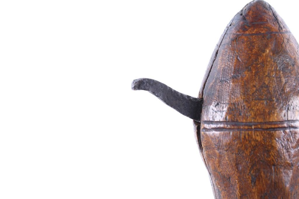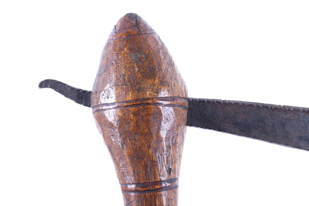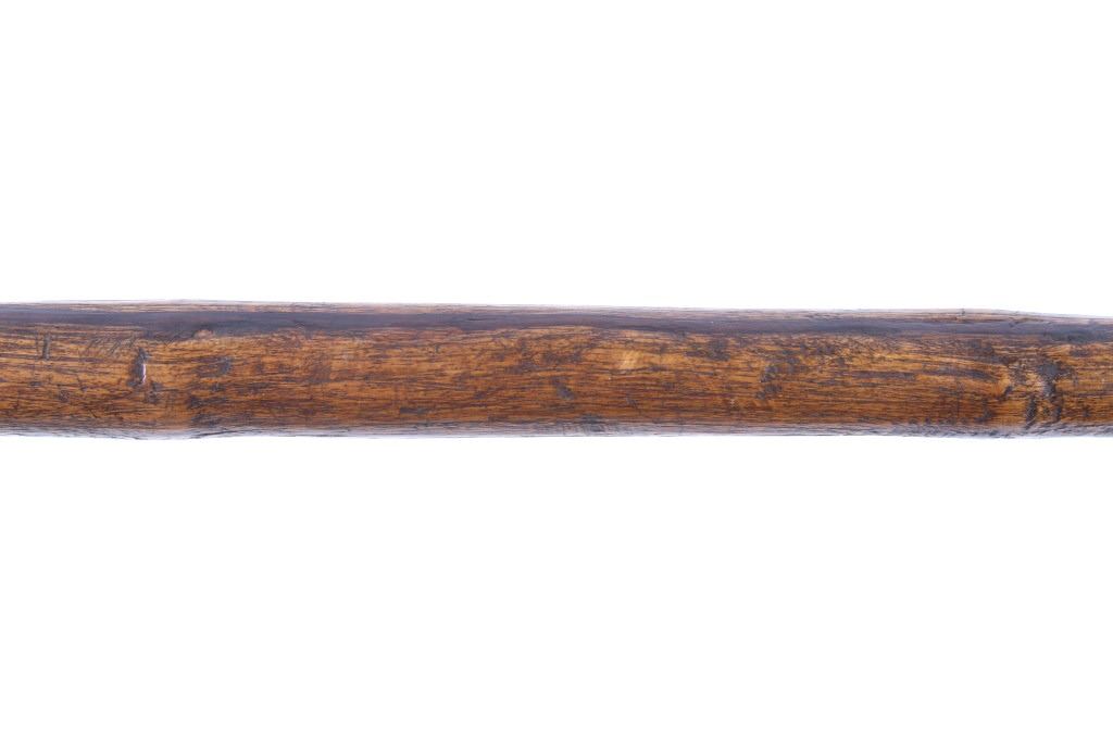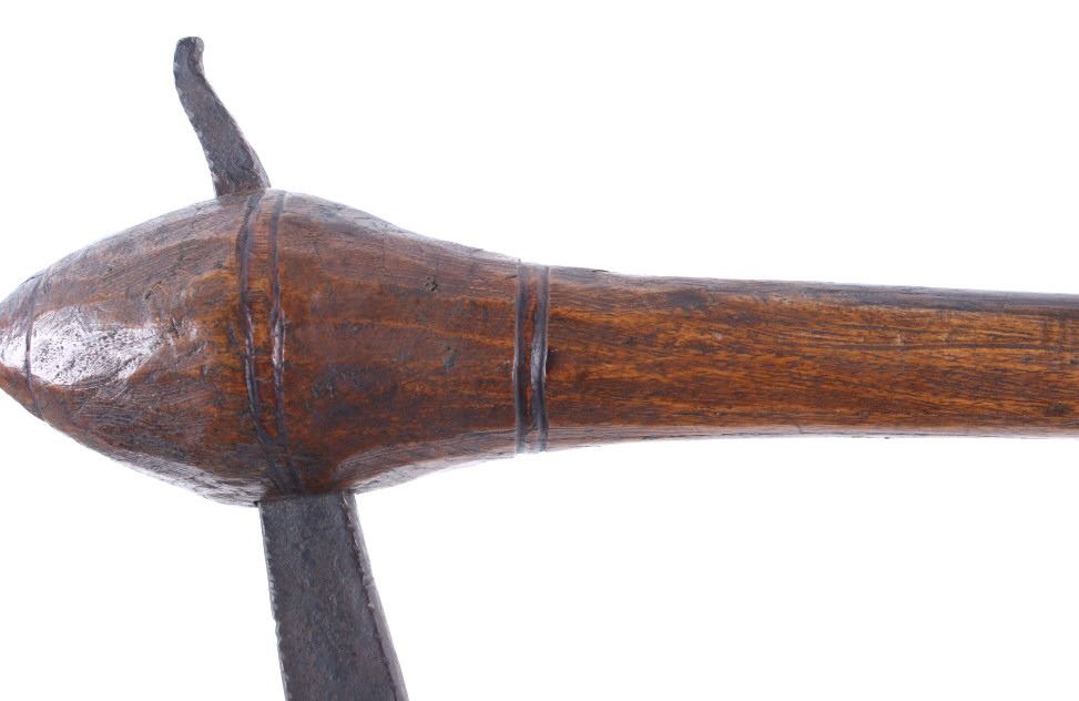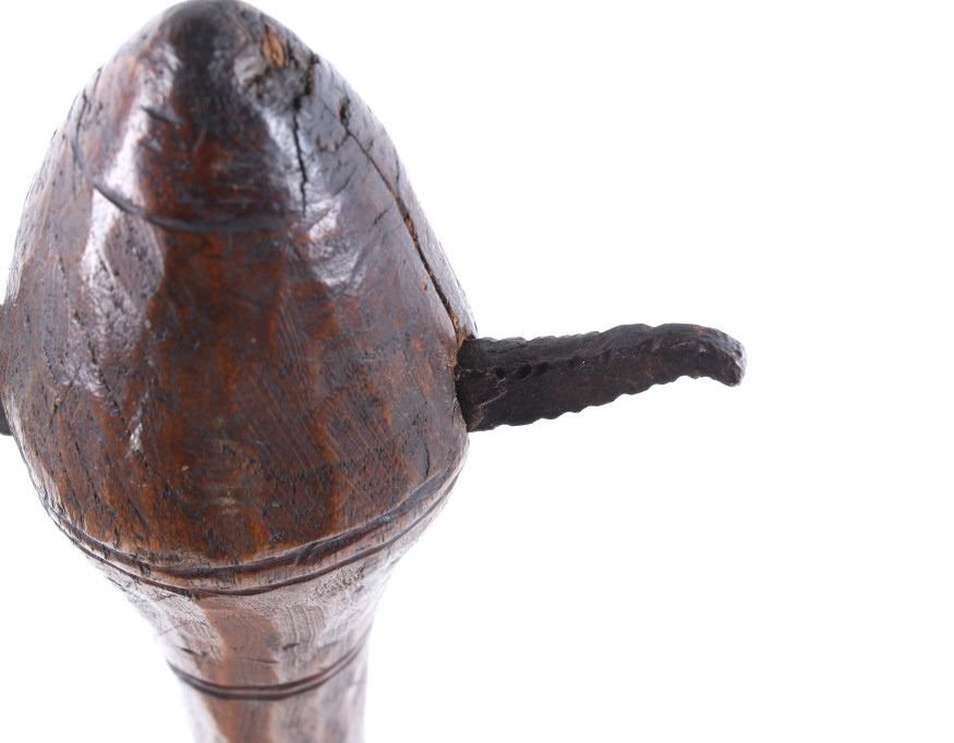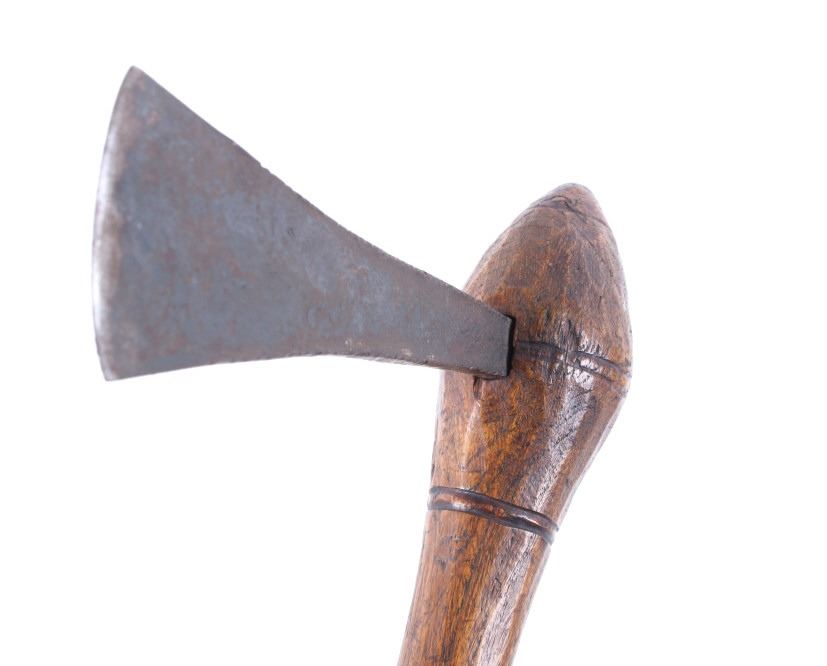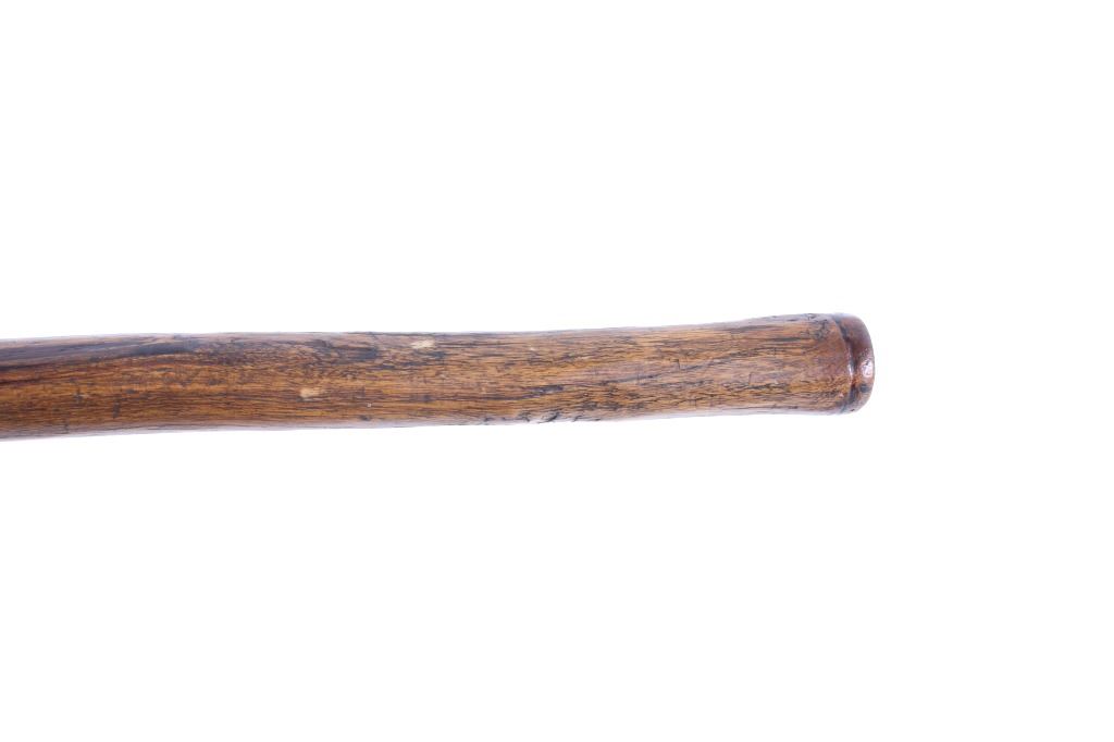 This is an exceptional early Celtiform ball head war club tomahawk dating to the 18th century from the Eastern Plains Native American Indians. The piece shows a root ball head war club with forge iron blade which is firmly secured in the head as if it had grown there. The use of iron for the blade indicates that the piece is a post-contact specimen and the workmanship suggests that the entire war club, including the blade, is of Indian manufacture. This places the piece at being from the 18th Century. Similar examples of Celtiform war clubs can be seen in Harold L. Peterson’s “American Indian Tomahawks” on page 101, pictured / figure 102, 103 and 104. These examples are attributed to the Indians of Oklahoma with this example very well originating from there as well. The blade has a tapering widening blade which then tapers at the back to a spike, making this Celtiform war club one of the earliest examples of a crude Pike Tomahawk or Spike Tomahawk. Various blacksmith folds, hammer marks and other techniques of blacksmith manufacture or working can be seen on the iron. The outer edge of on both sides has an engraved rolled edge which extends on both sides along with forged molded and filed lines on the flat outer and under edge. The haft handle has a rich patina from honest authentic age and use, with this being a very solid and heavy example. The entire wood surface has a shiny patina from much age and use and the metal has a deep chocolate brown patina from the same. This is truly a fantastic early example with amazing Celtiform design as it would have been a formidable weapon in its time. The haft also shows incised carved lines along the head and at the pommel end. Provenance: From a historic Eastern Montana American Indian Collection, where the piece was found to be an authentic original, one of the finest collections of American Indian weaponry and antiquities in Montana. Measures overall 26”L with a 8.25”L axe with a 1.75”L blade. The ball head is approximately 1 7/8”x1 7/8”x3”.
