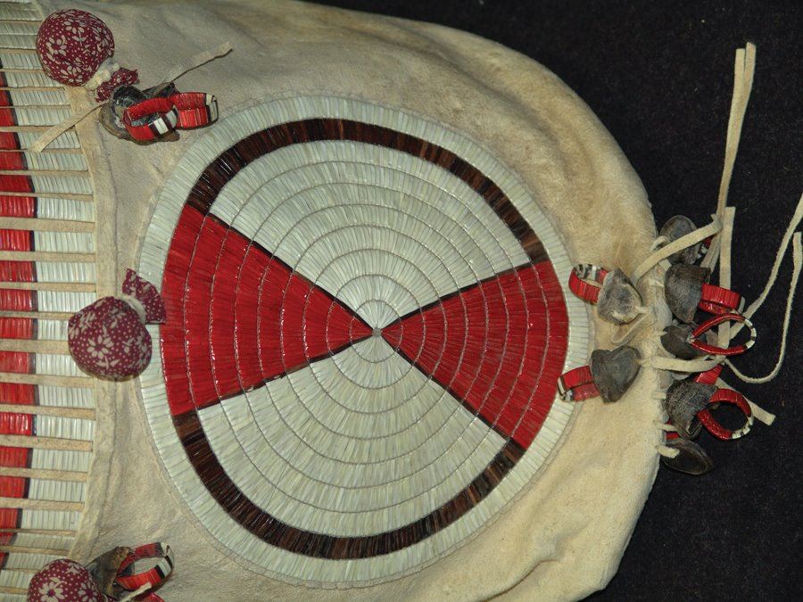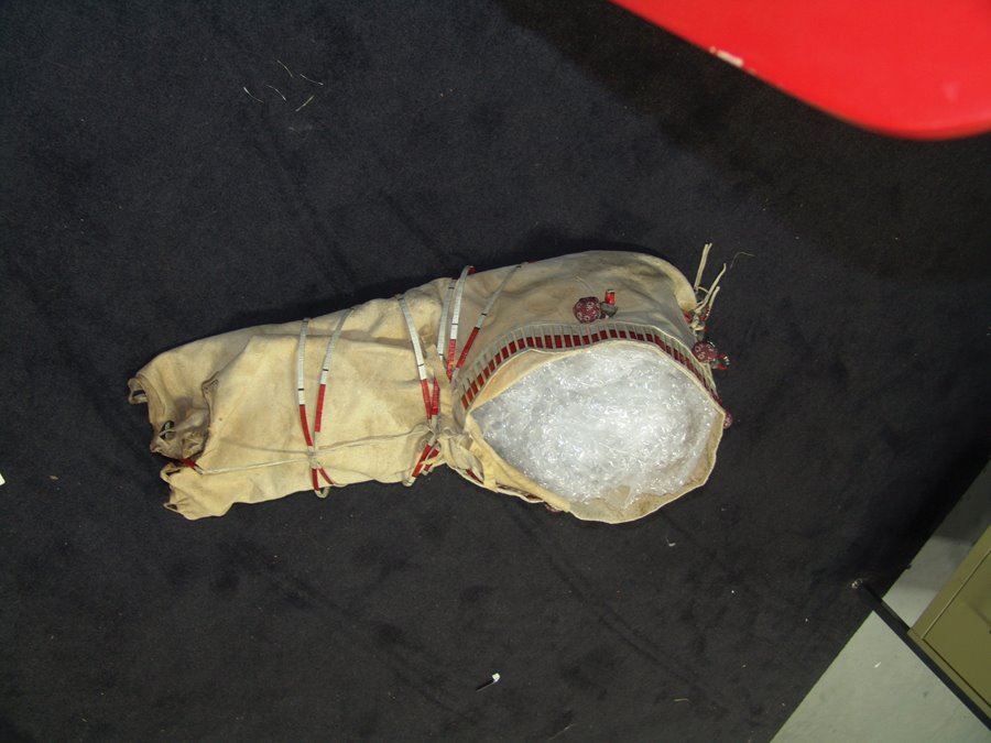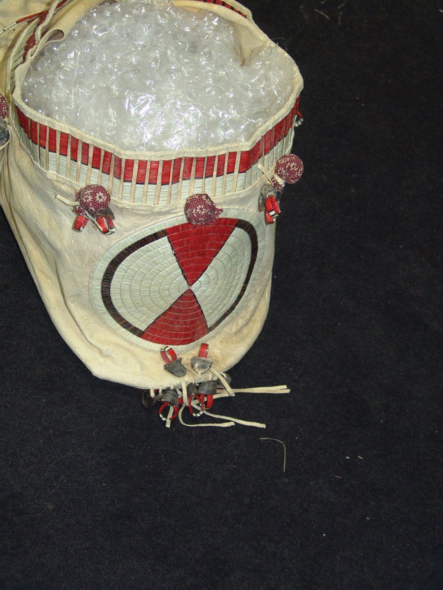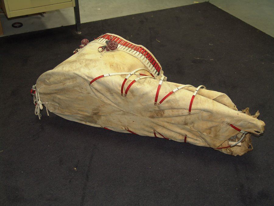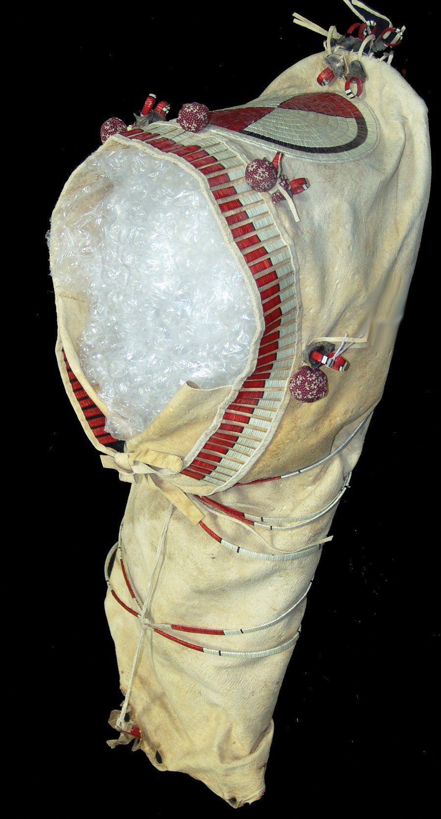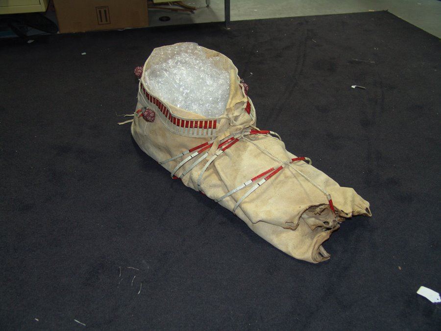 Wonderful full-size baby carrier with bentwood frame and buckskin body the large head top medallion, canopy trim band, and closures all done with fine red and white quillwork. Very good condition.,Ca. 1970s-1980s,29"