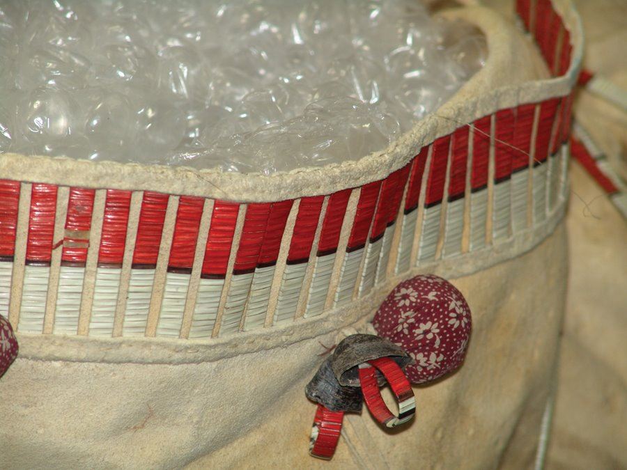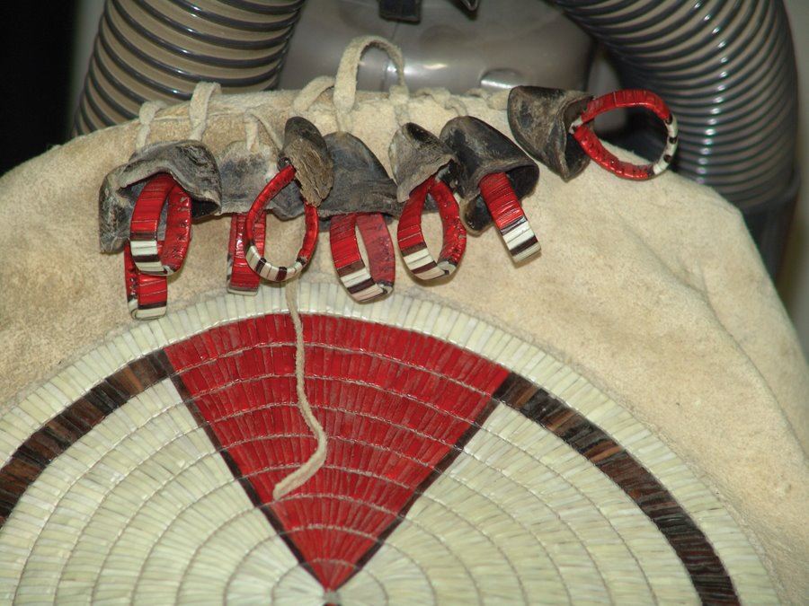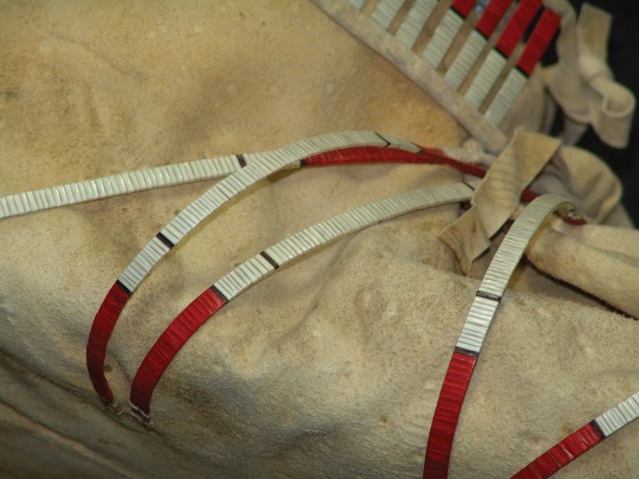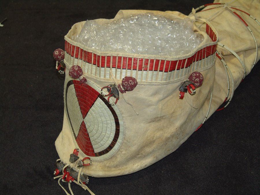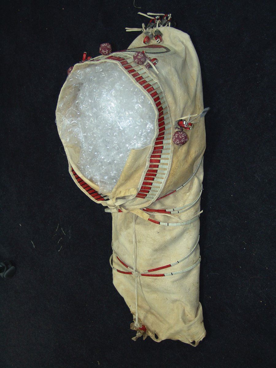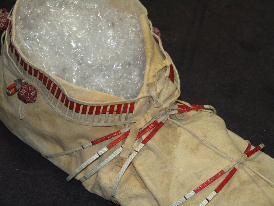 Wonderful full-size baby carrier with bentwood frame and buckskin body the large head top medallion, canopy trim band, and closures all done with fine red and white quillwork. Very good condition.,Ca. 1970s-1980s,29"