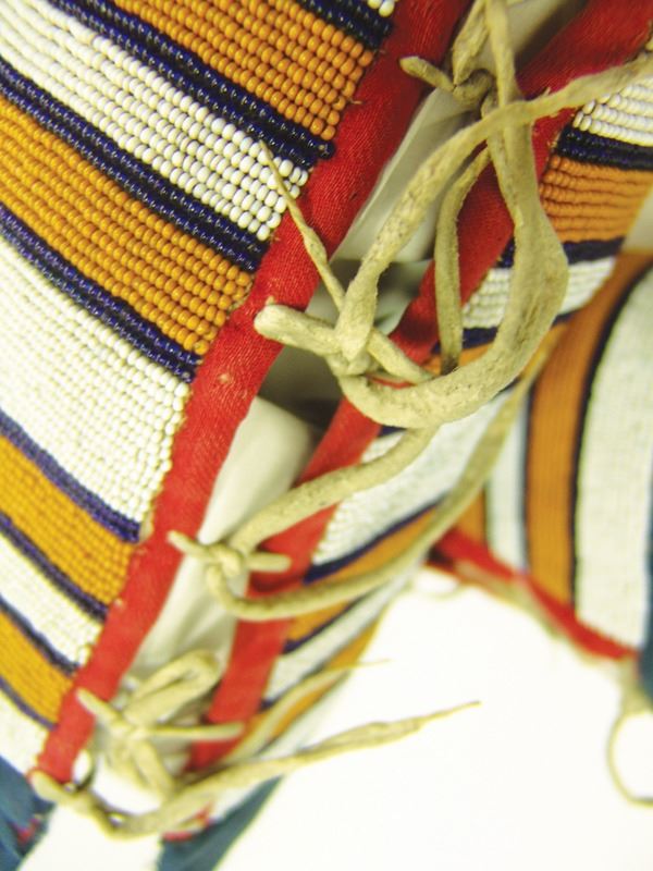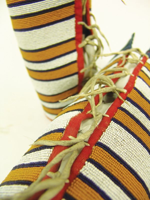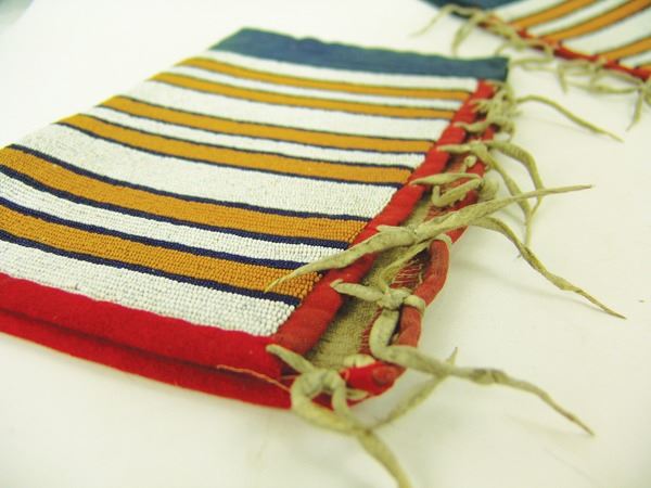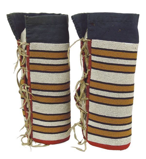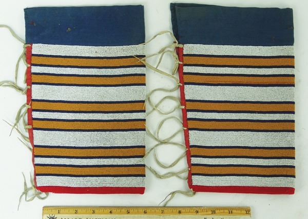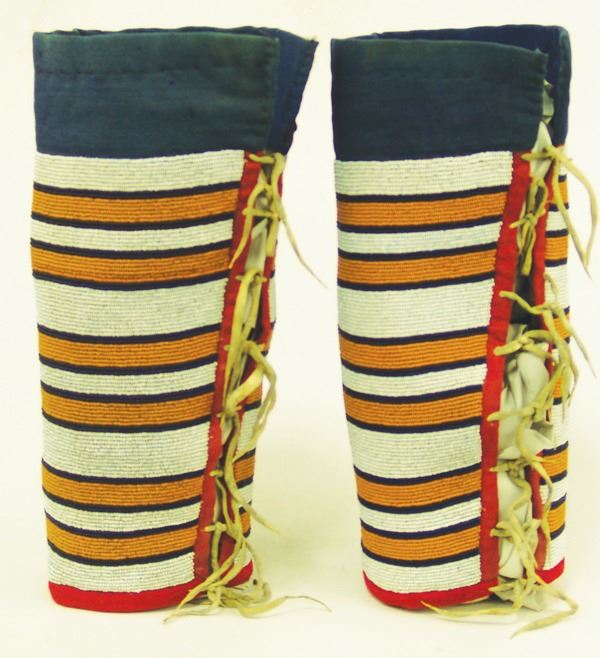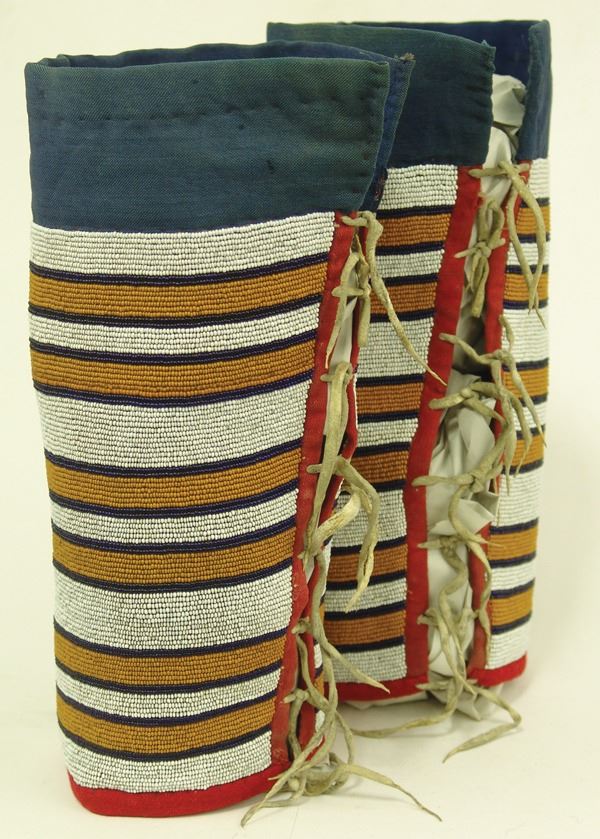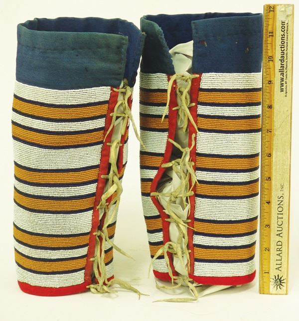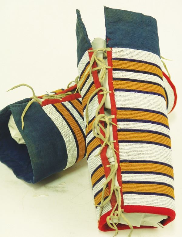 Beautiful pair of flat beaded leggings/uppers with traditional banded pattern and red cloth trim. Very good condition, with buckskin ties.Ca.1930s11" x 7"