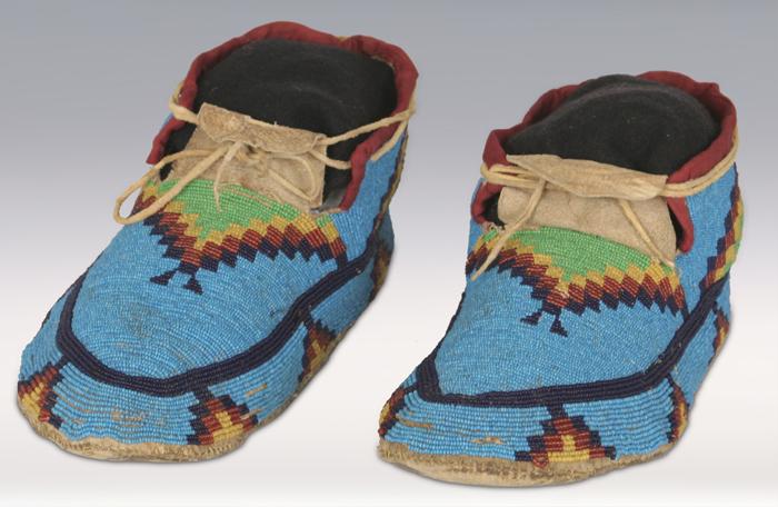 Plains Cree Moccasins. 11" long. Cowhide. Highly visual. C. 1910. Condition Report: Minor bead loss, otherwise in excellent condition.