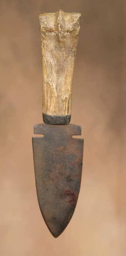 Plains Dag Knife. 12" long . Buffalo bone handle . Iron blade is hallmarked "H. B. Montreal". 19th Century. (est $1,000-1,500). For condition reports please visit: www.auctioninsantafe.com/cr2011.pdf