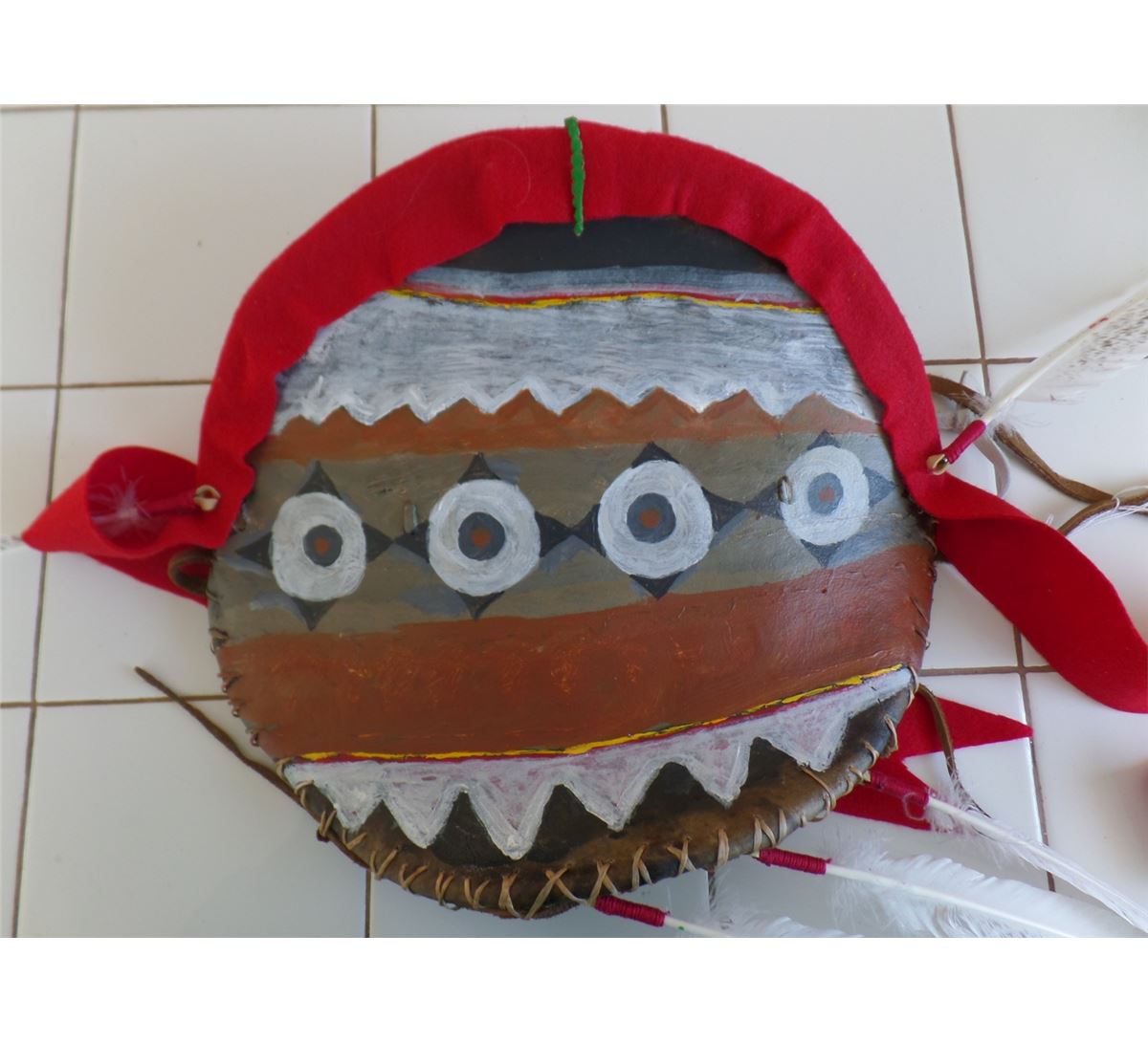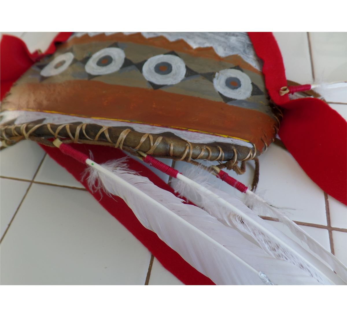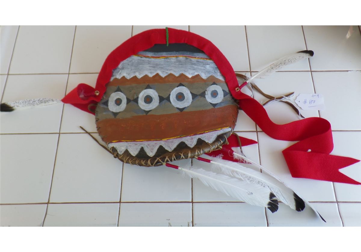 Plains Dance Shield from 1980's. This dance shield is made from rawhid, wool, paint, cloth and feathers. This Sioux measures 11x14 inches without drops. Shipping: $22.50