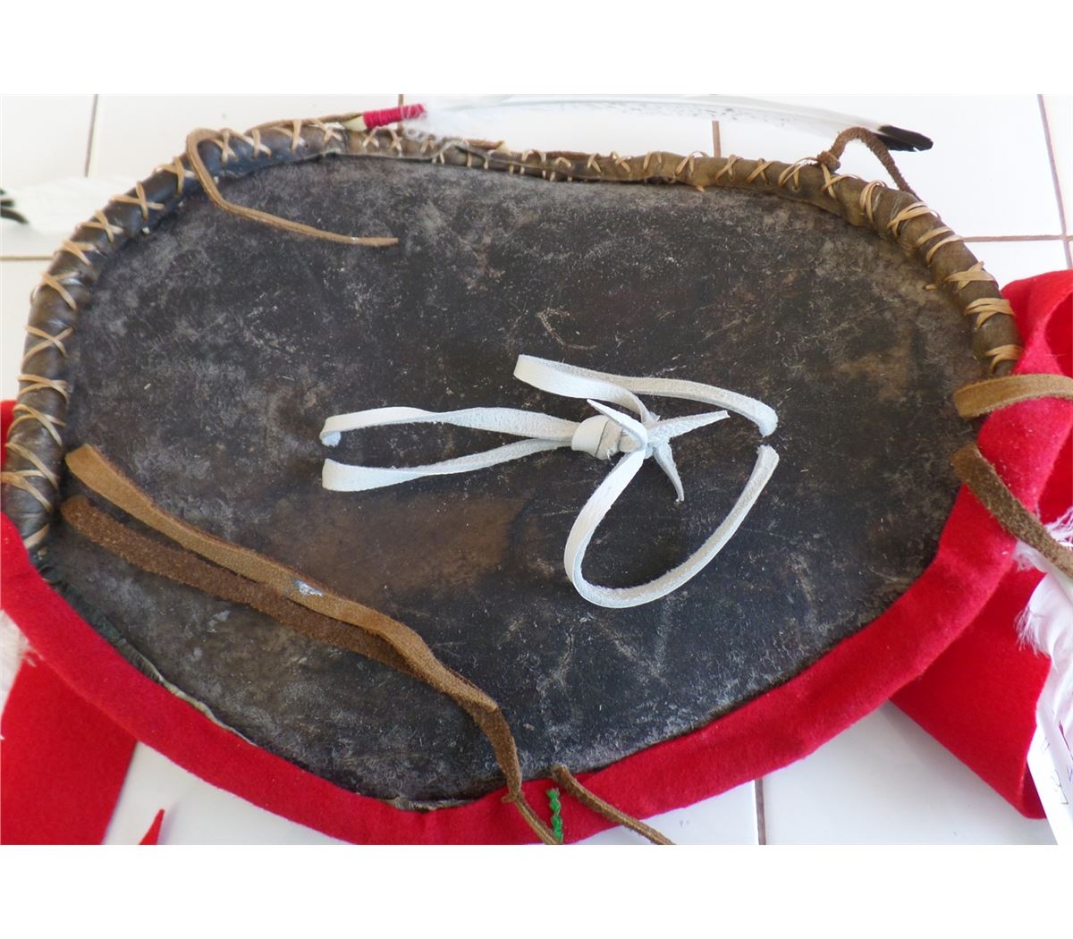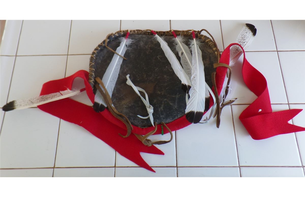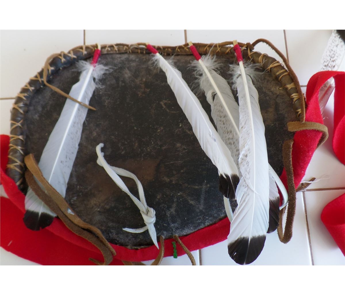 Plains Dance Shield from 1980's. This dance shield is made from rawhid, wool, paint, cloth and feathers. This Sioux measures 11x14 inches without drops. Shipping: $22.50