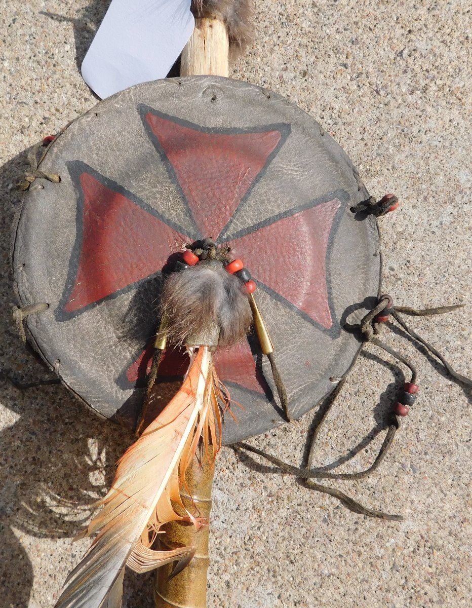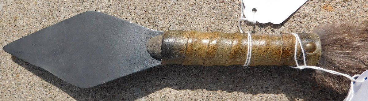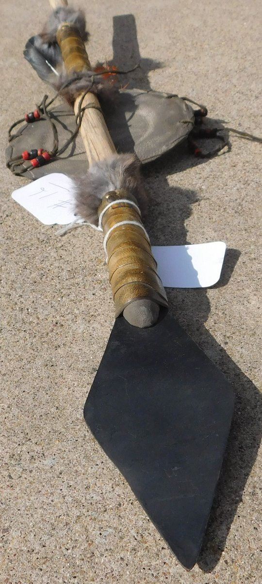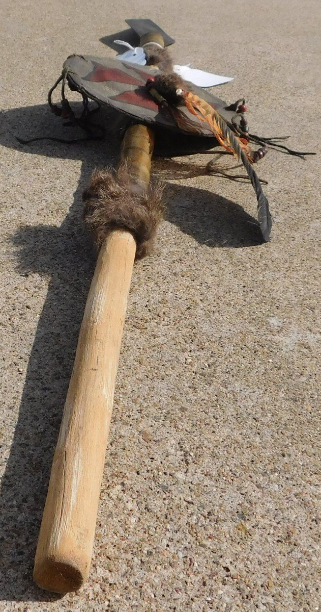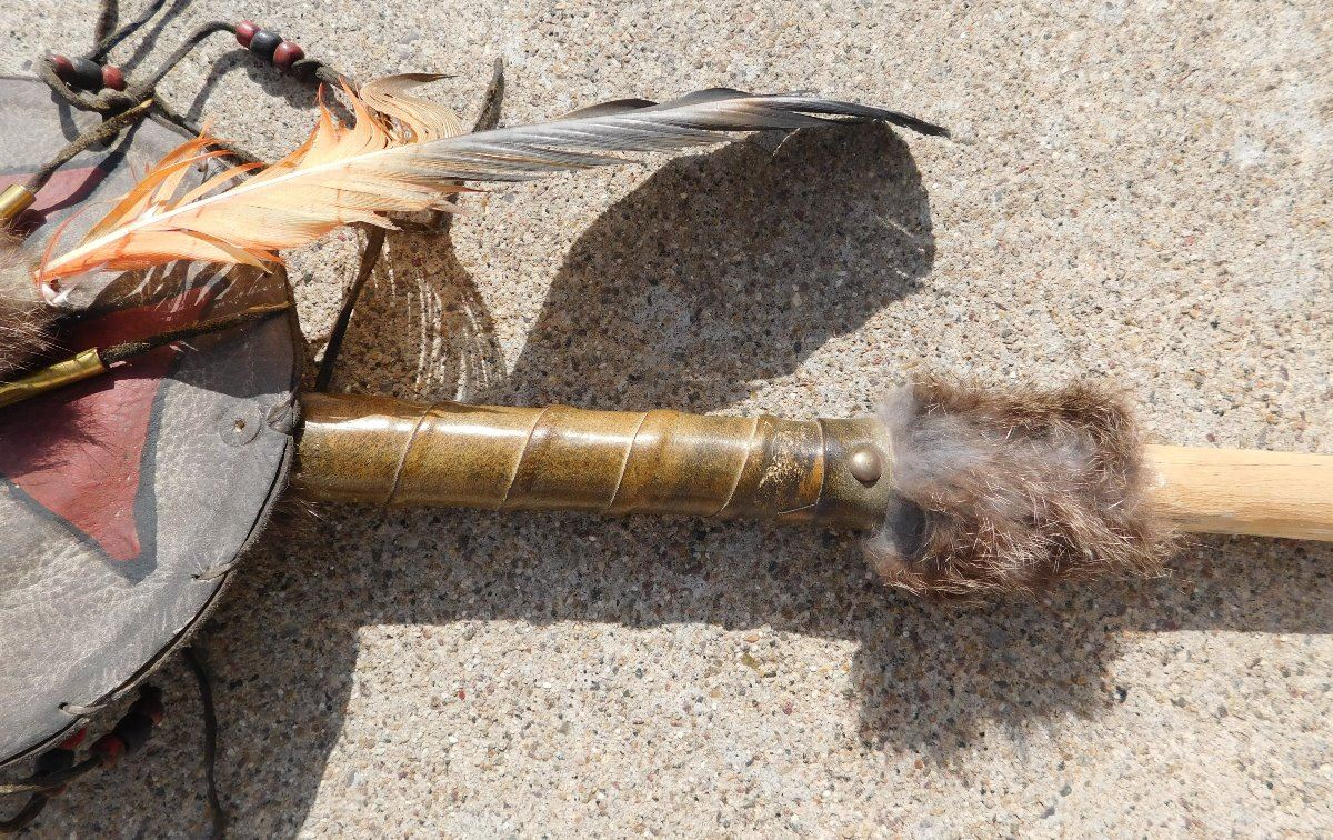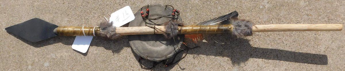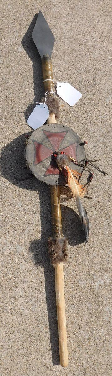Plains Dance Spear, circa mid-20th century item. Dance spear measures 35 x 6 x 3 inches. This item has wood, steel, brass, paint, feathers, fur and beads. Sioux, South Dakota. Condition: Some wear but good condition, note the mini painted shield on the shaft of the spear, see images. Shipping: $60.00 (USA estimate, long item).