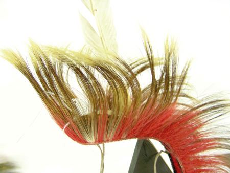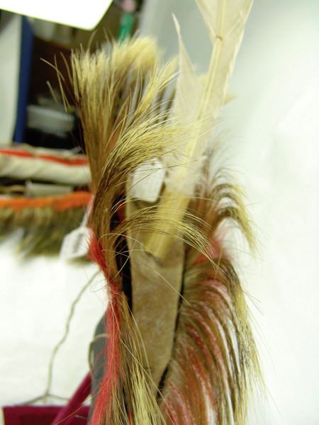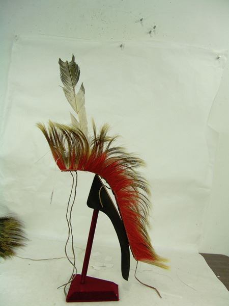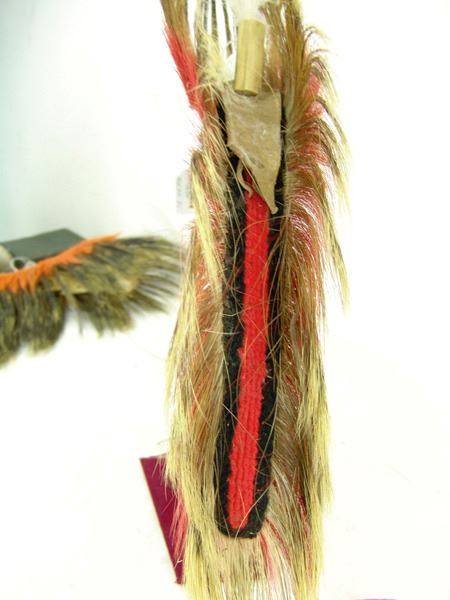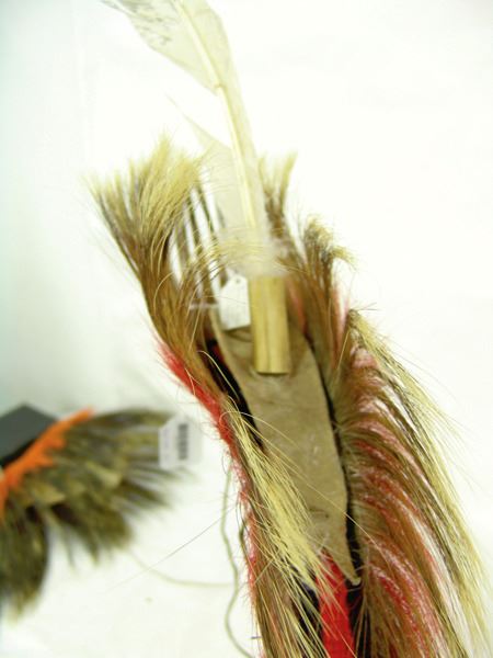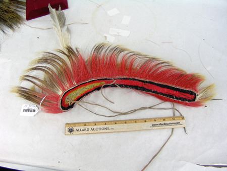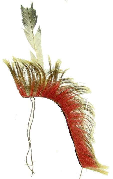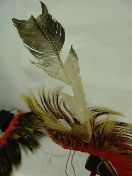 Early 1900s, Finely woven porcupine hair and deer tail head piece with rawhide spreader, boner feather toggle, and old painted feather. Very good condition. 15" x 3" x 6"