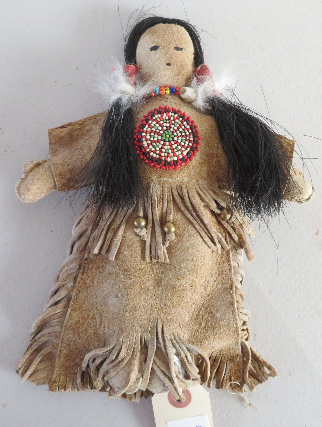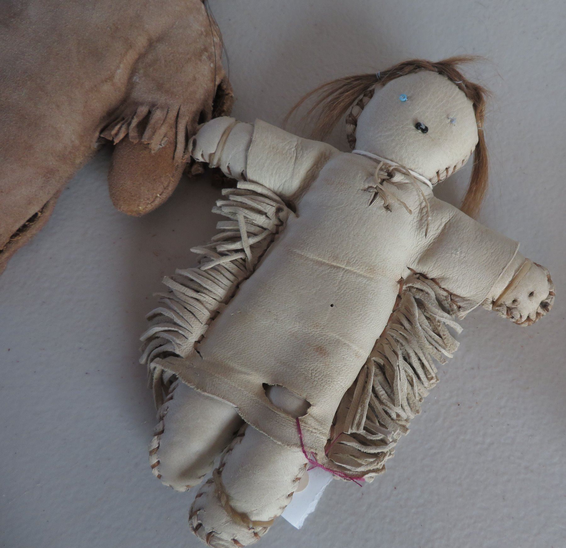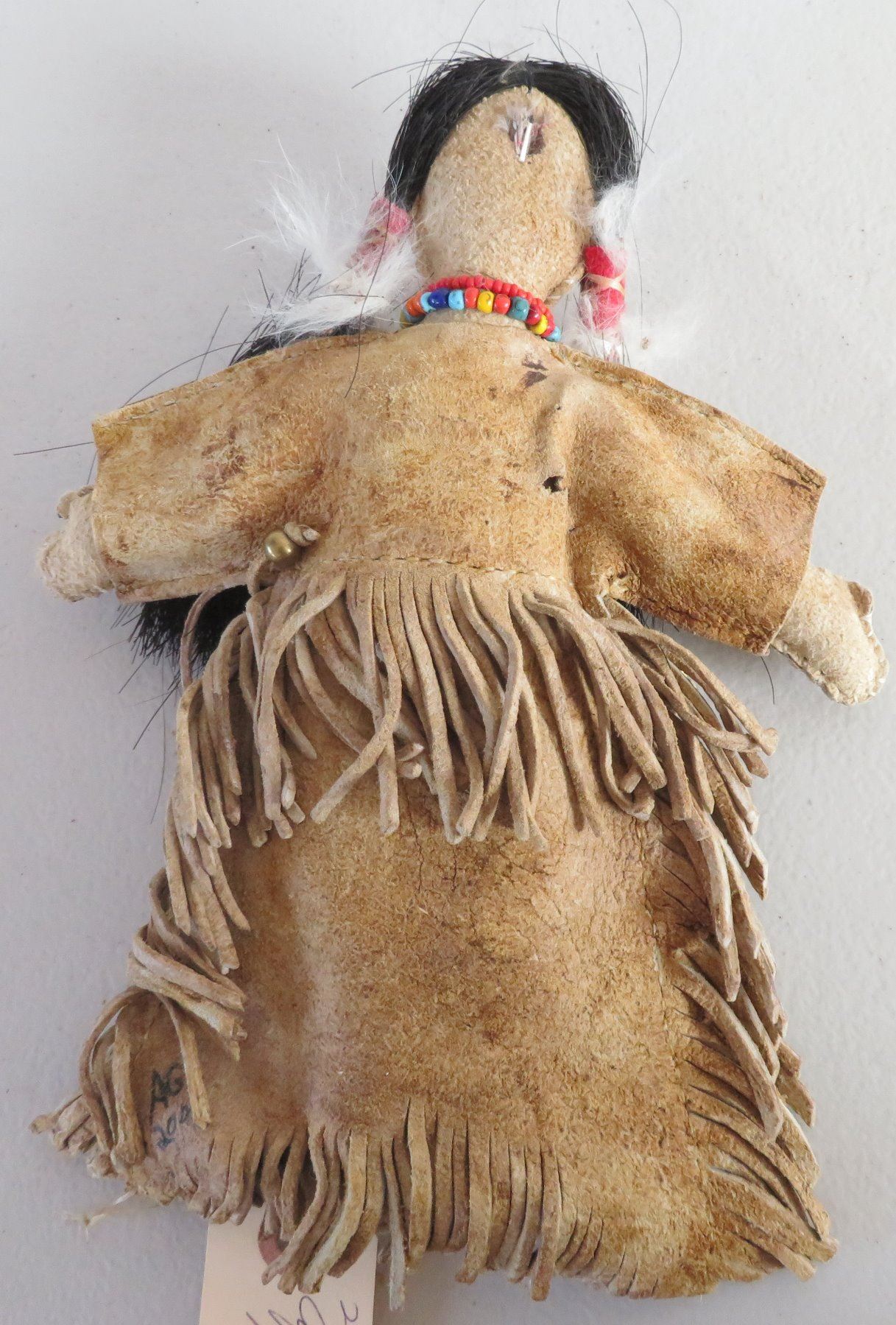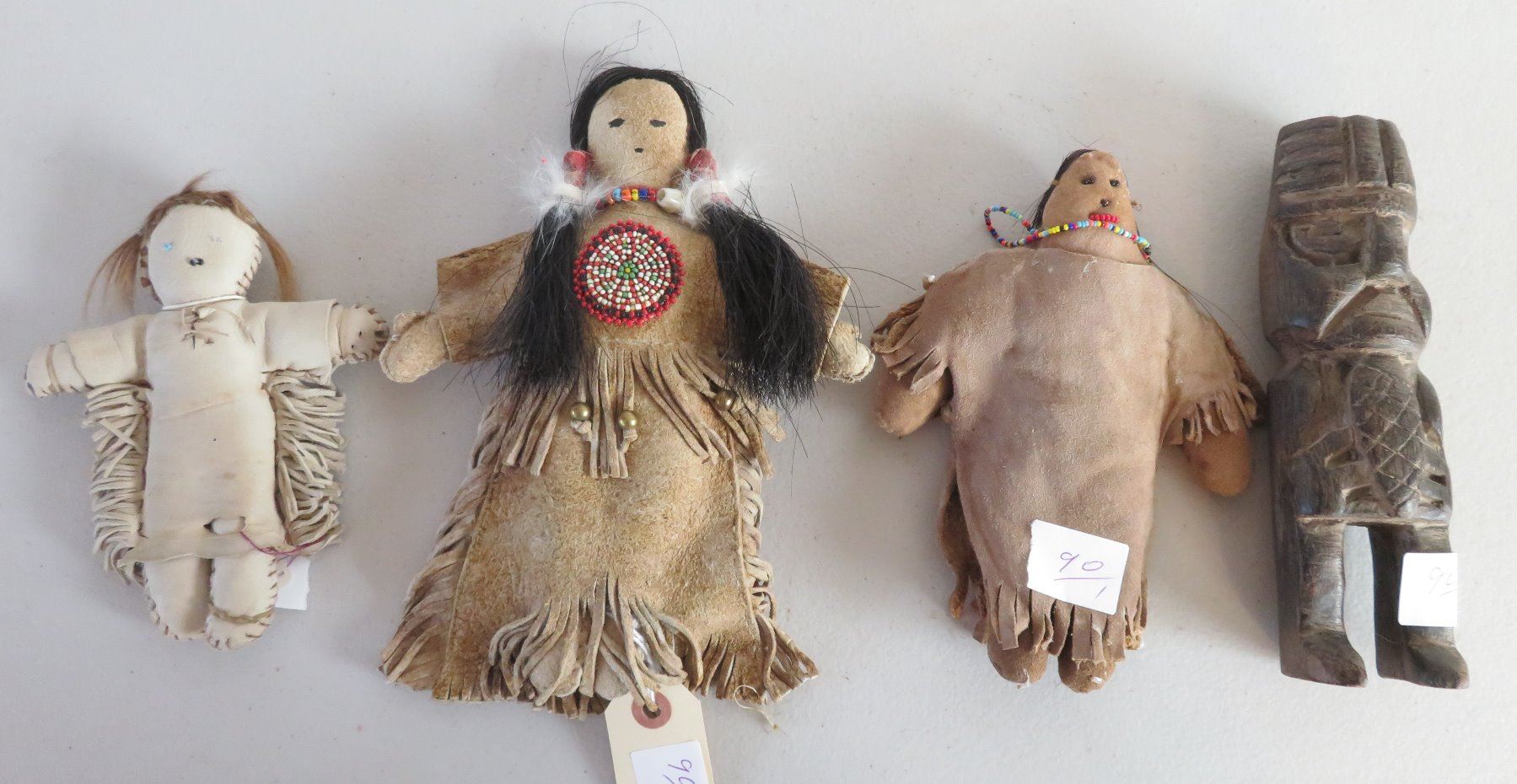 Plains Doll Collection, c. 1920s. Made of leather, glass and hair, the tallest doll measures 10" x 5". Plains Indian, USA. Wood doll included is probably pre-Columbian from South America. Condition: Some wear, see images. Shipping: $36.50 w/insurance and signature.