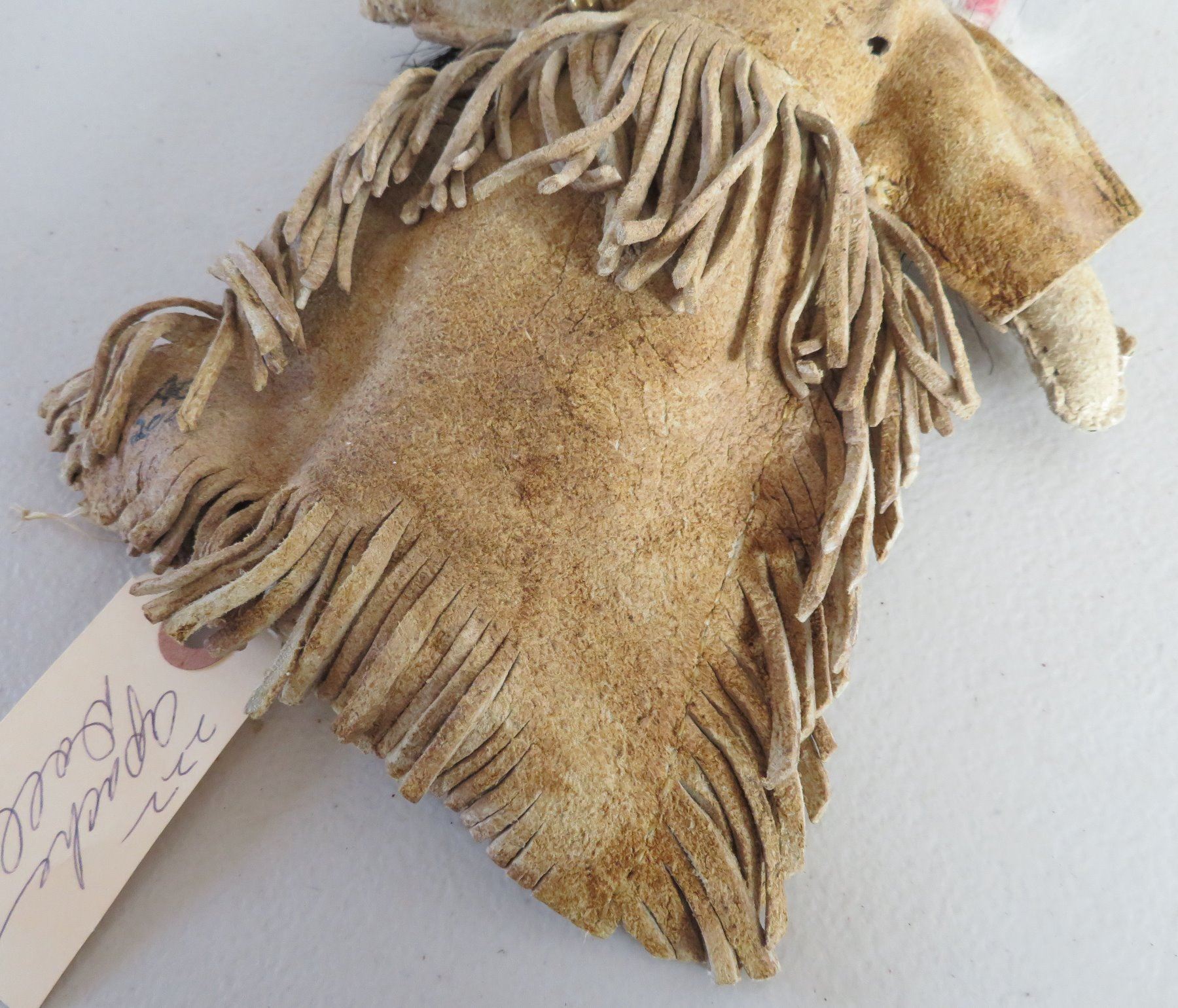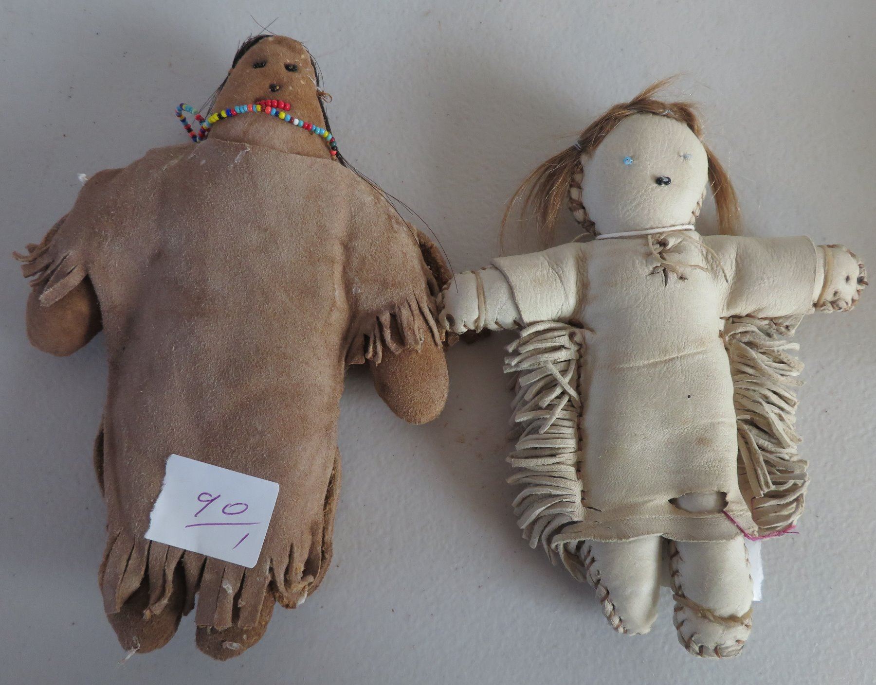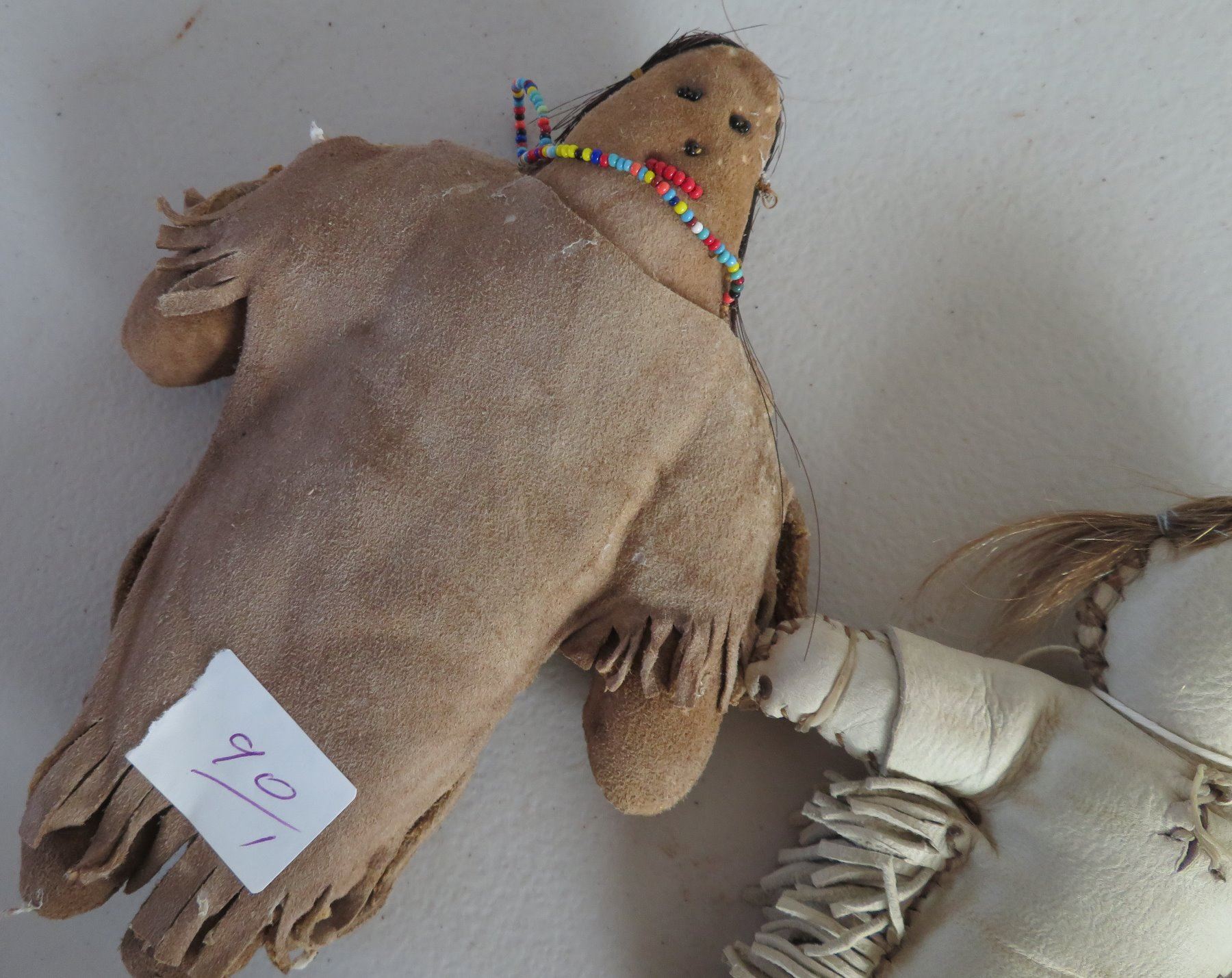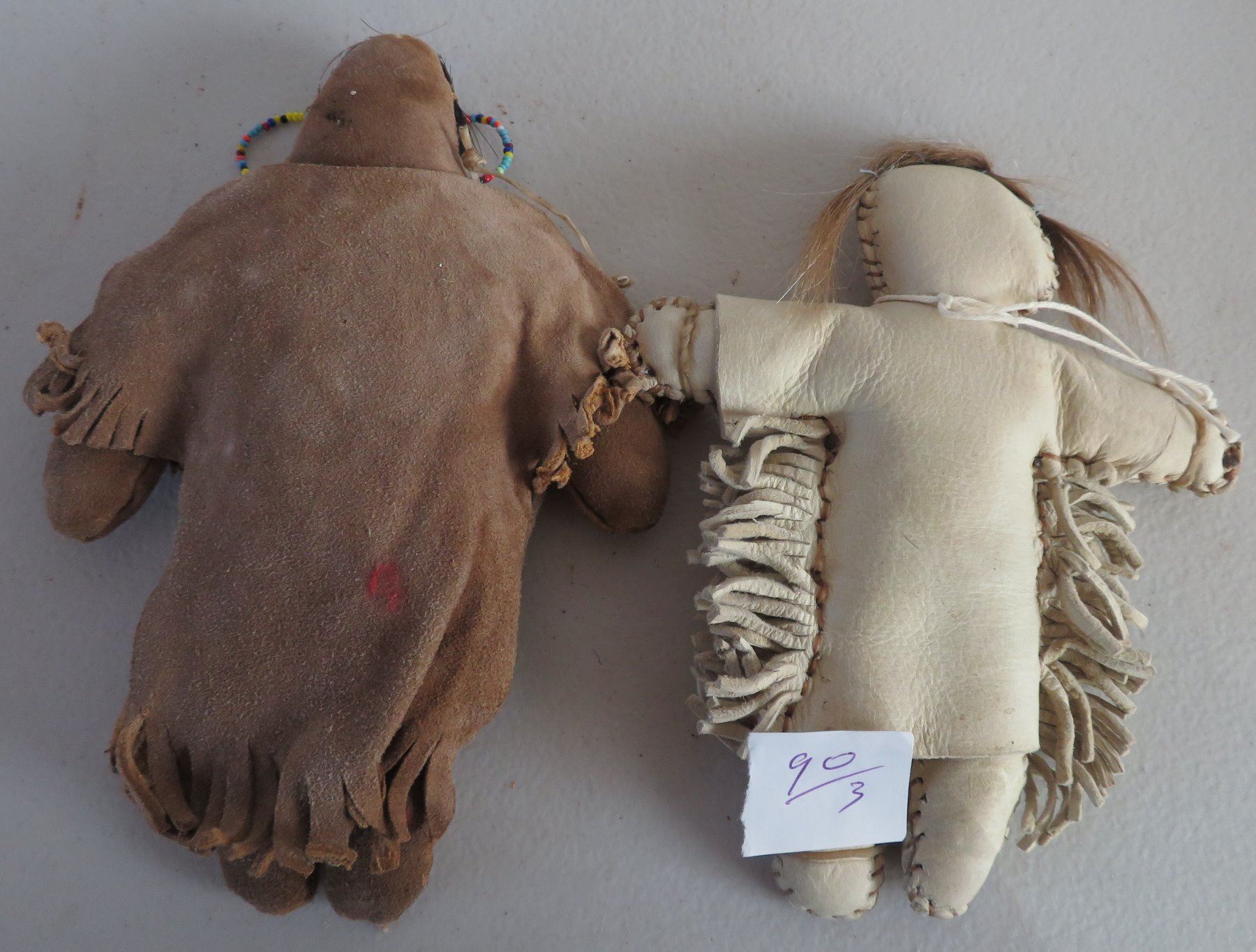 Plains Doll Collection, c. 1920s. Made of leather, glass and hair, the tallest doll measures 10" x 5". Plains Indian, USA. Wood doll included is probably pre-Columbian from South America. Condition: Some wear, see images. Shipping: $36.50 w/insurance and signature.