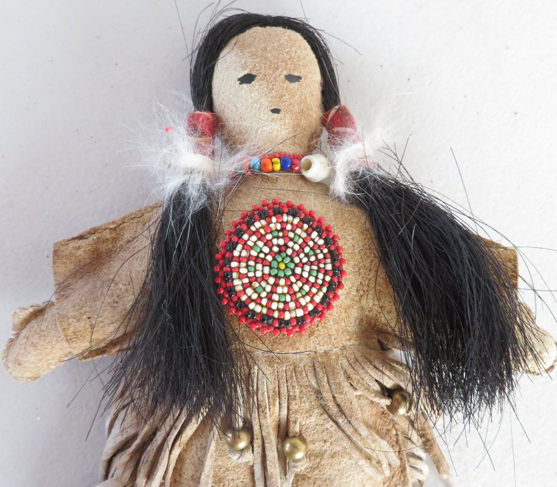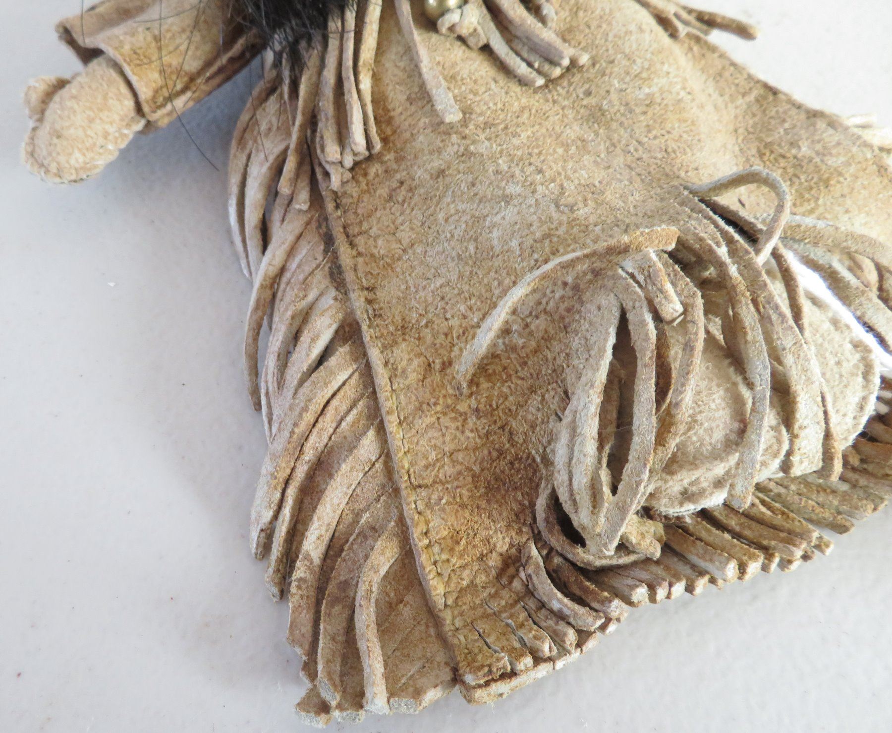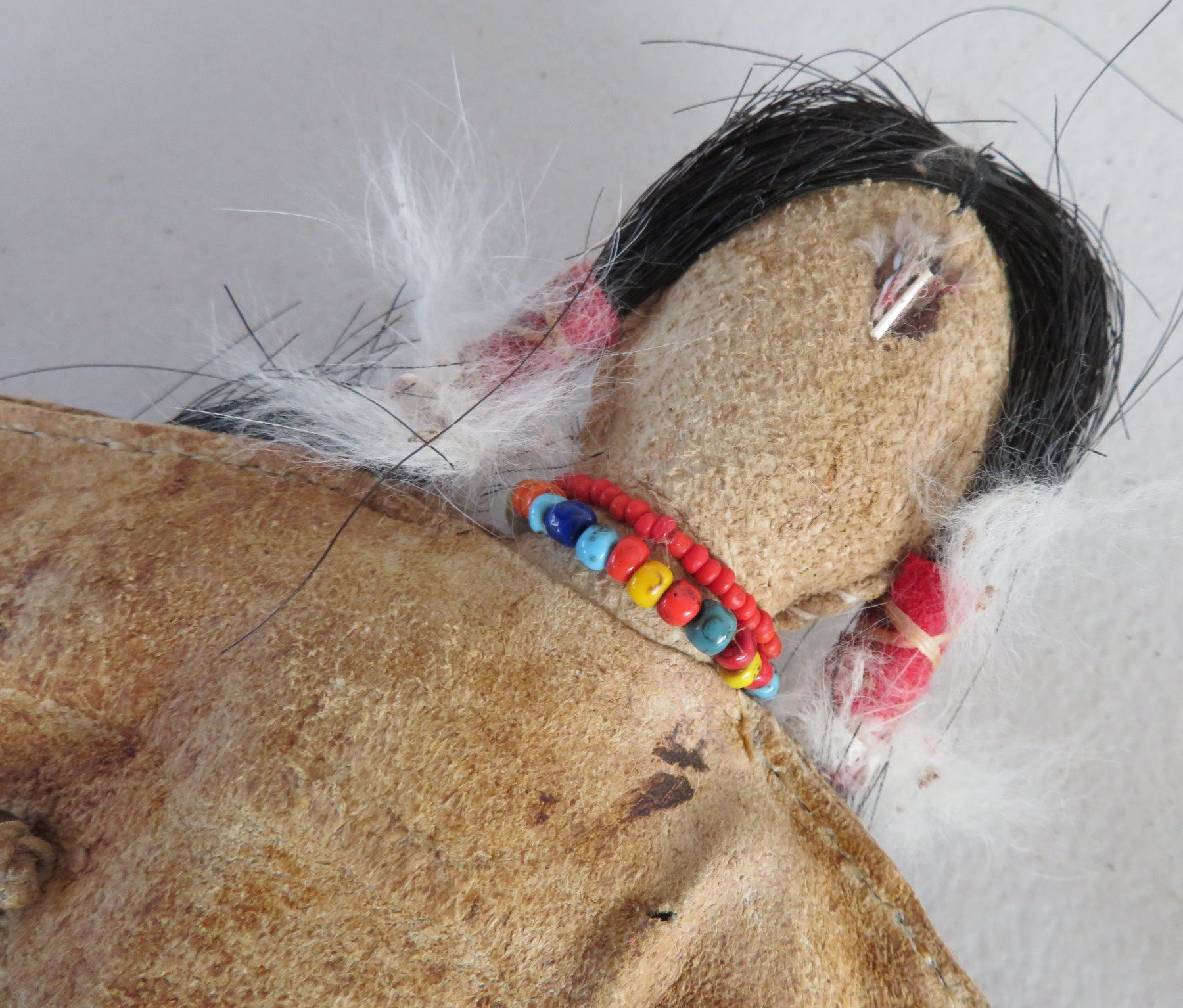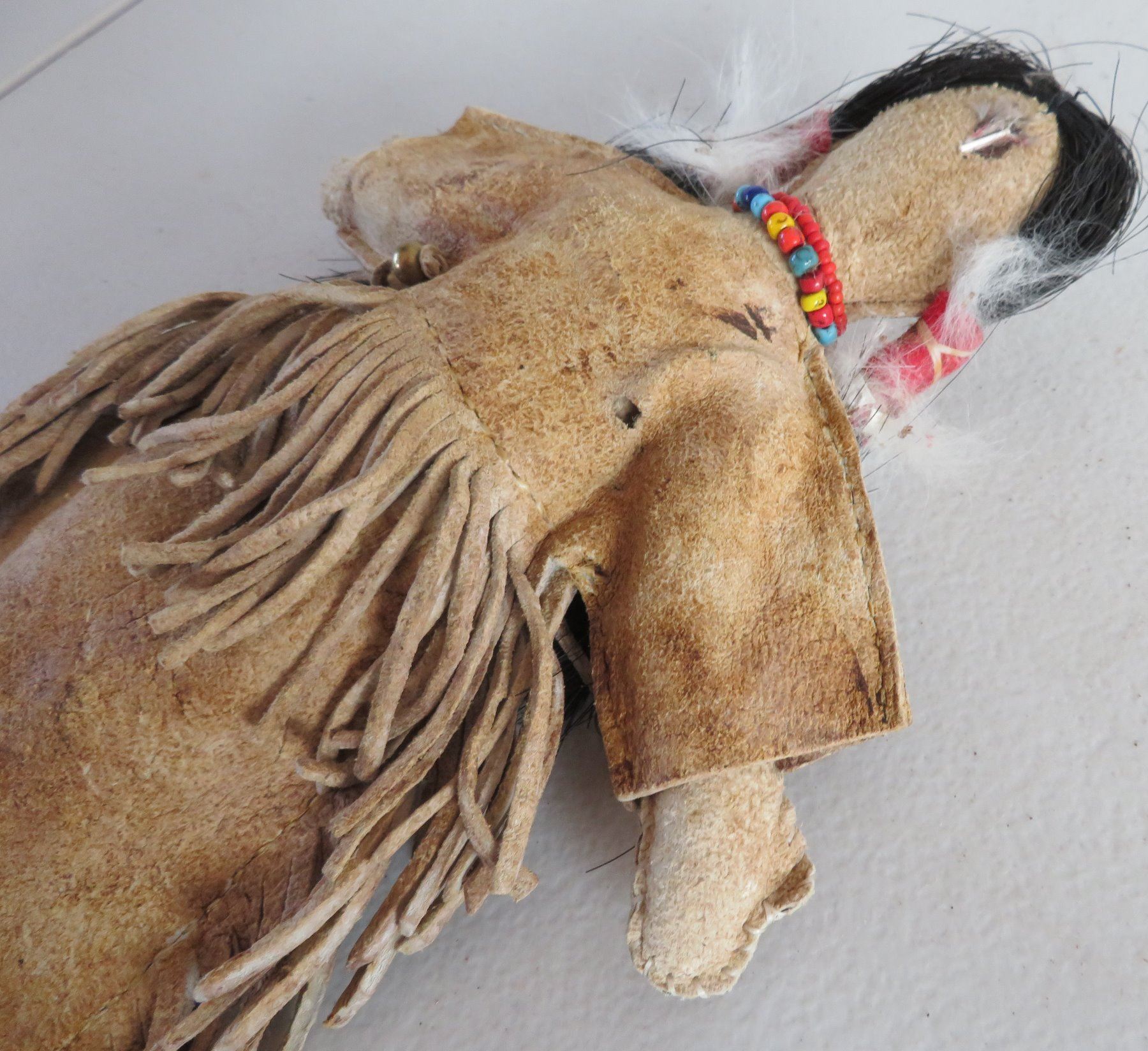 Plains Doll Collection, c. 1920s. Made of leather, glass and hair, the tallest doll measures 10" x 5". Plains Indian, USA. Wood doll included is probably pre-Columbian from South America. Condition: Some wear, see images. Shipping: $36.50 w/insurance and signature.