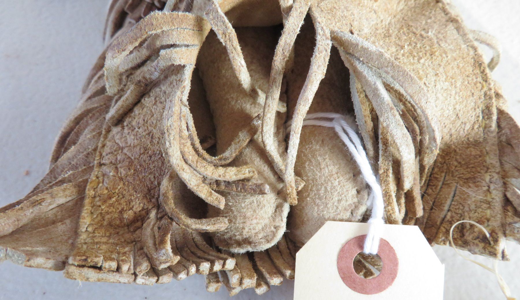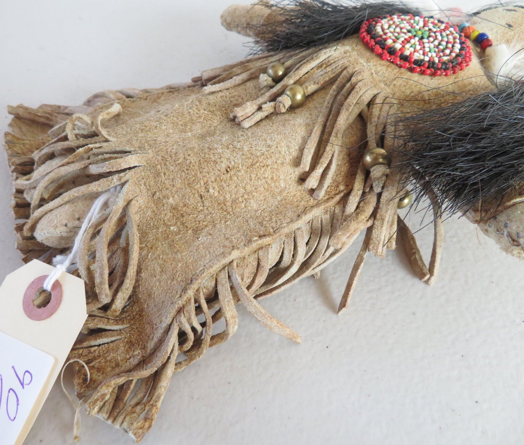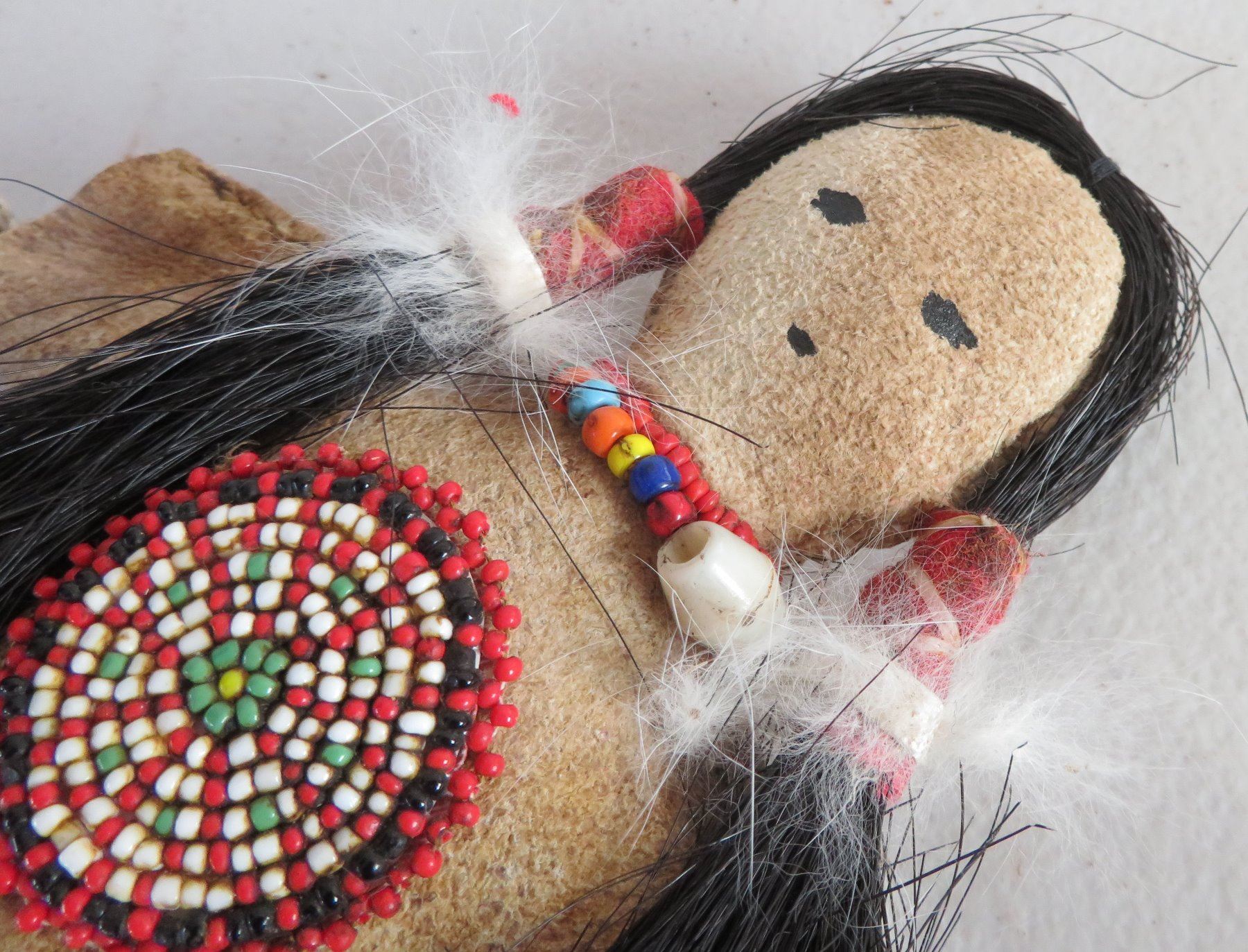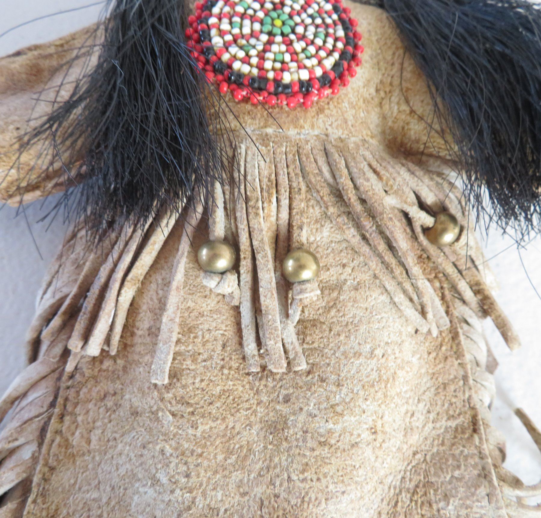 Plains Doll Collection, c. 1920s. Made of leather, glass and hair, the tallest doll measures 10" x 5". Plains Indian, USA. Wood doll included is probably pre-Columbian from South America. Condition: Some wear, see images. Shipping: $36.50 w/insurance and signature.
