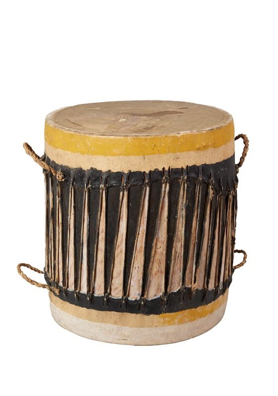 This drum is in good condition. The pigmentatioin and rawhide lacing on the sides of the drum are in very good condiition. Both drum heads have some scarring and discoloration from apparent use. The drum head with a figure on it has one notable abrassion in the center which is about 2 inches in length and does not penetrate the surface. This appears to be a naturally occurring inconsistency in the rawhide skinches