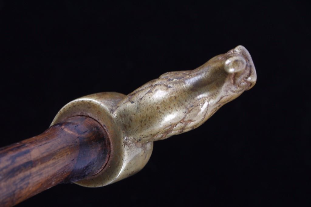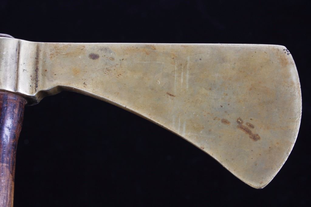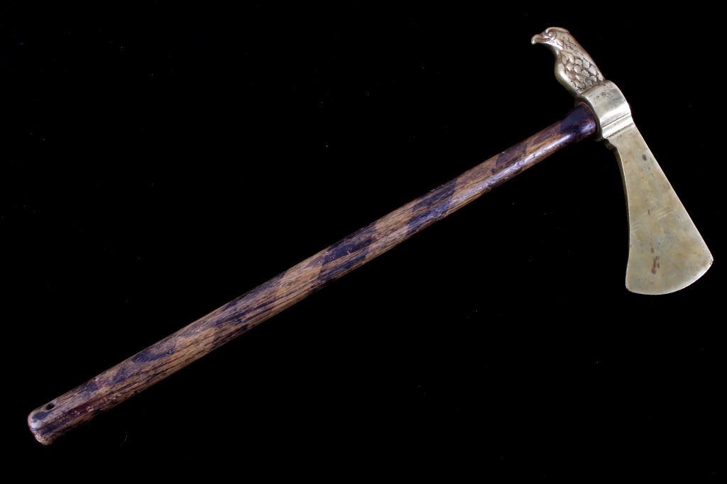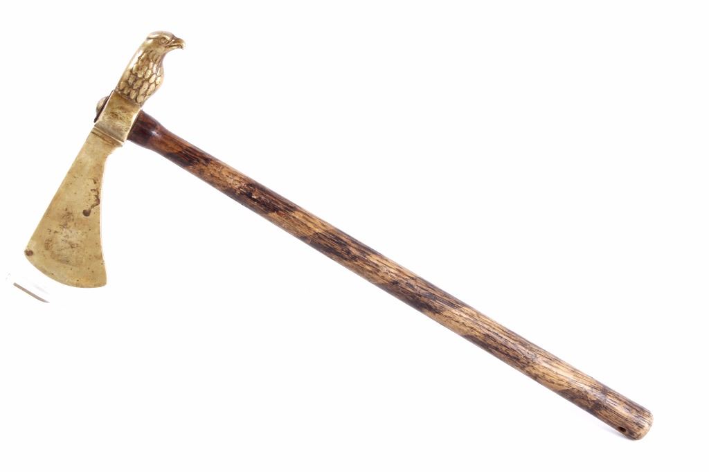 This is a Plains Native American Indian Hammer Poll Tomahawk with rare Eagle Head carved end. The weapon is believed to be from the late 19th century to early 20th century. This piece shows a hardwood haft having a brass plug and leather wrap securing it to the head with a red and black mineral ocher dyed spiral design. The tomahawk head is in an unusual and scarcely seen solid brass hammer poll pattern having the hammerpoll area being a carved Eagle effigy. The brass heads were highly desired by some tribes for their color even though they didn’t hold an edge as well as the iron head counterparts. The brass head has been moderately wiped with some of the early patina still showing. This comes with a a custom museum wrought iron display stand as shown. Measures overall 14.75”L with a 6 5/8”L x 2 1/8”W head that is 1.25”D. Display stand is 9”H x 11.5”W x 6.25”D. Review pictures for condition and description correctness.