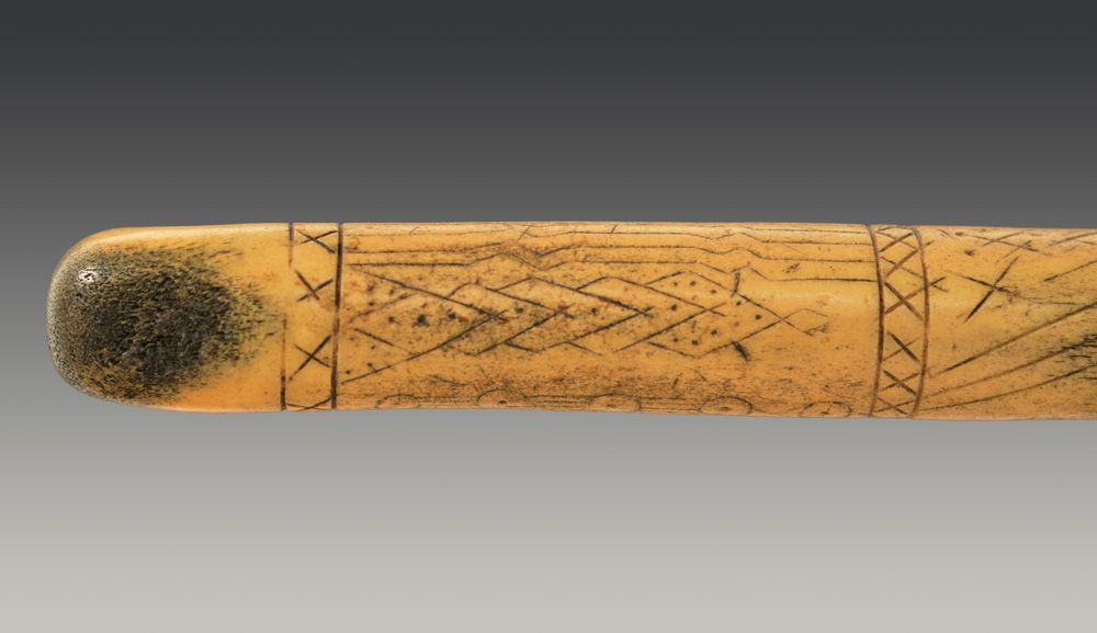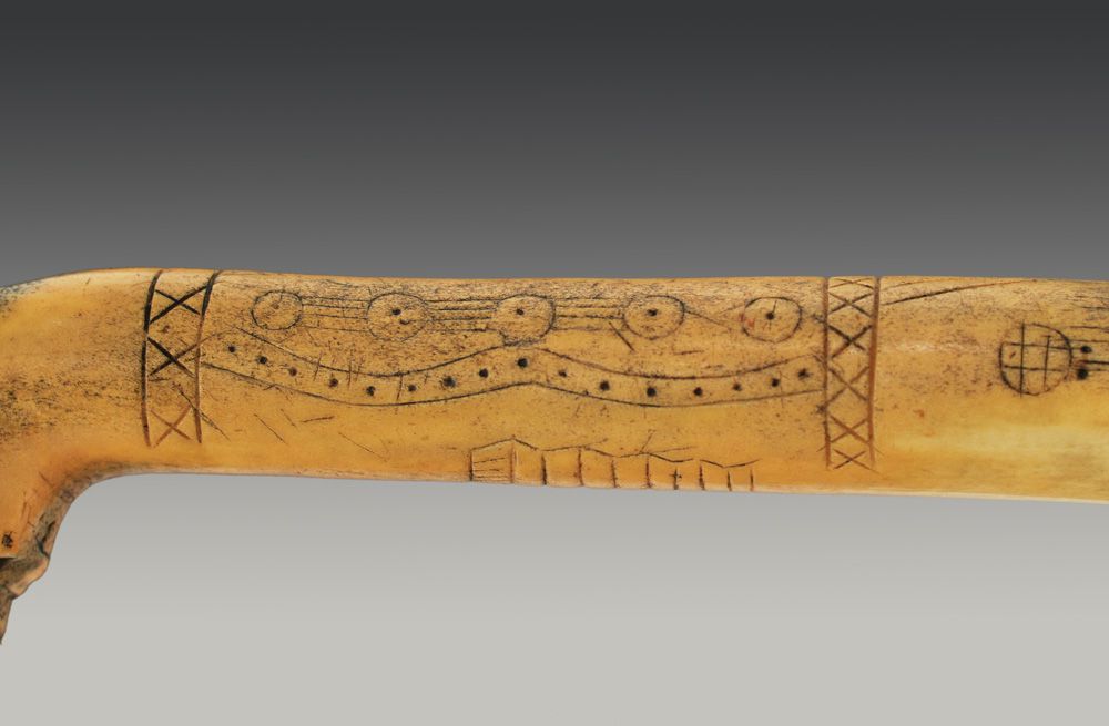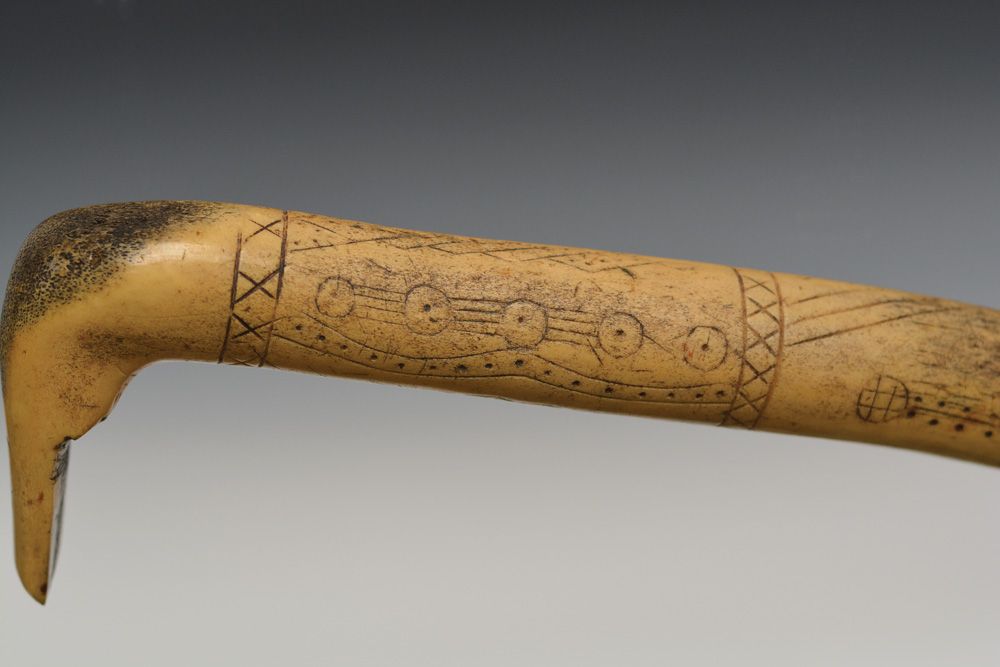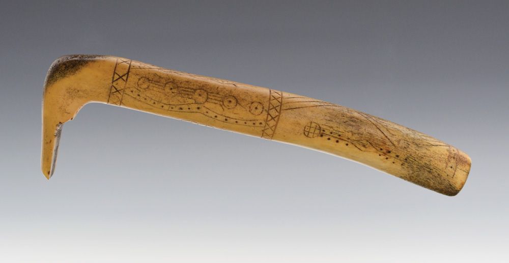 Plains Elk Antler Hide Scraper. Profusely incised decoration along the haft: power lines, dots, and cross motifs. The main design of circle and dots along a length of 4 lines. Classic hooked form for attachment of iron blade. This is a fine example of a scarce decorated handle. Smooth patina overall. Circa 19th century, 13 1/4" x 4".