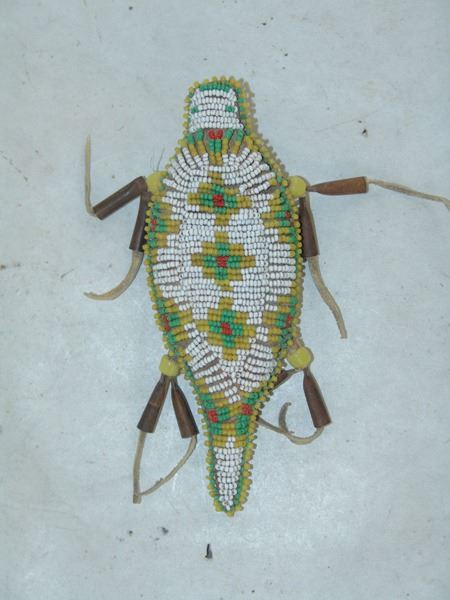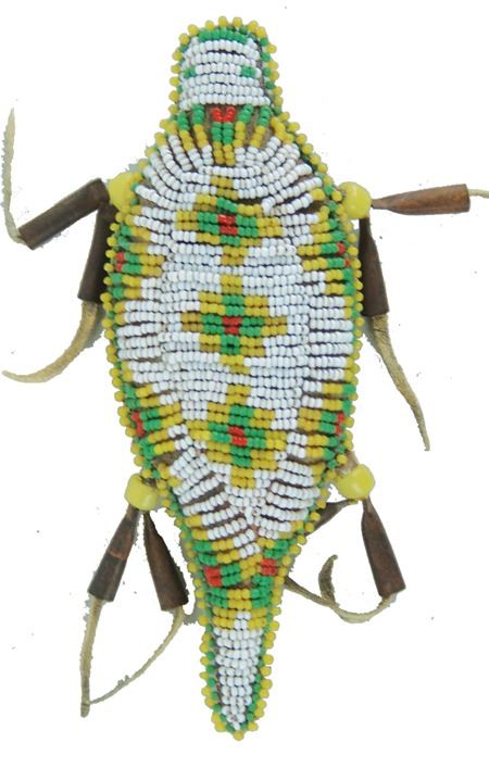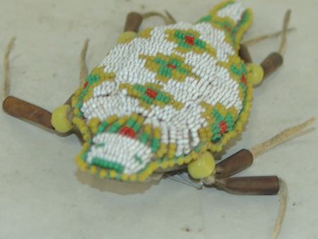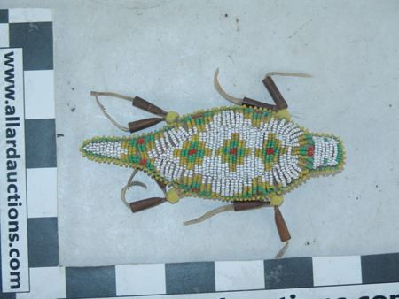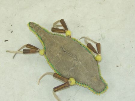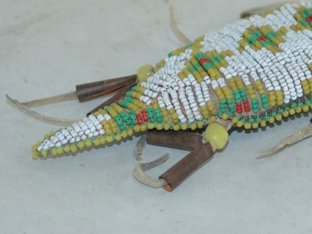 Mid 1900s, A traditional sinew sewn and lazy stitch beaded umbilical cord fetish made of buckskin and done in lizard form with tin cone and bead suspensions. Very good condition. 5-3/8"