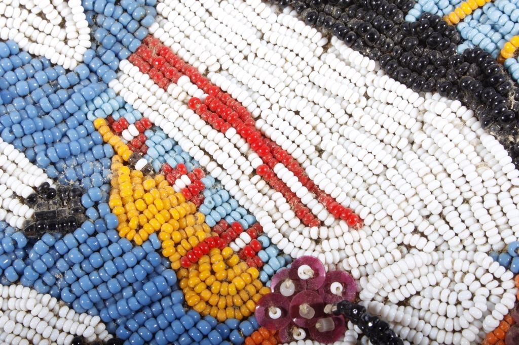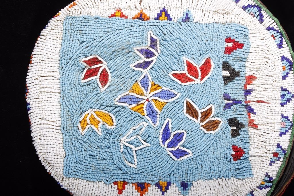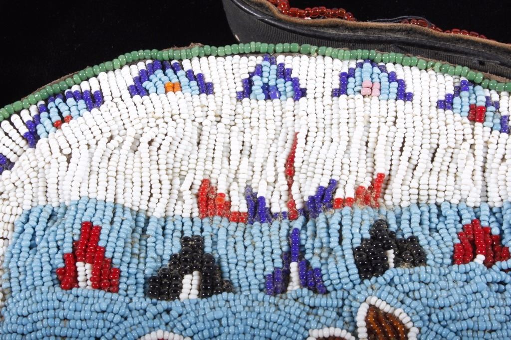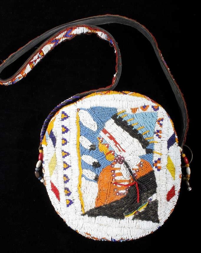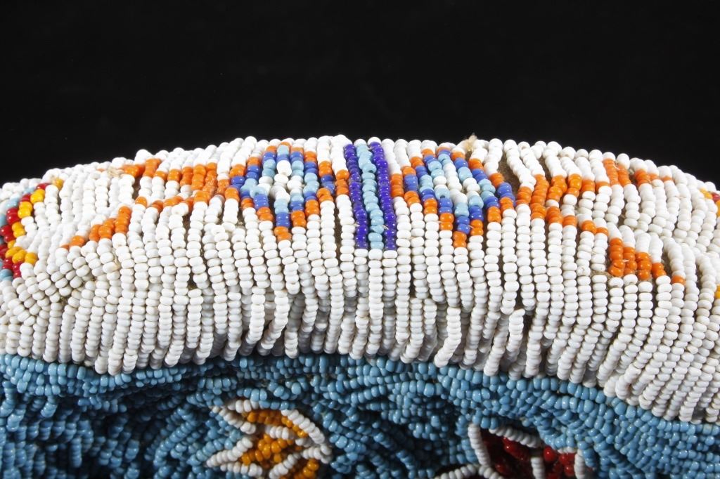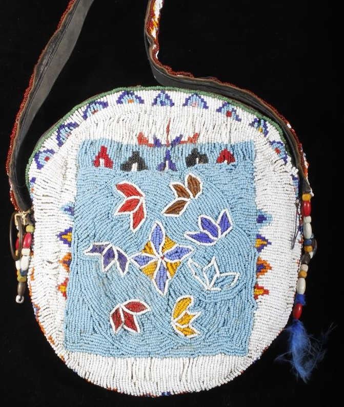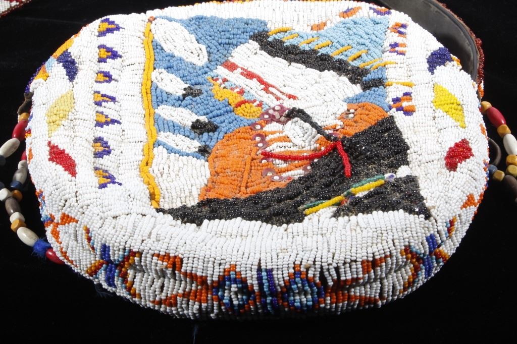 The lot features a Plains Native American Indian fully beaded purse or bag from circa early to mid 20th century. The bag shows excellent 19th century glass trade seed beads in chalk white, pumkin yellow, black, greasy yellow, orange, semi-transparent red, sky blue, red, and more. The bag shows an early manufactured bag with wonderful beadwork covering the entire piece. Event the strap shows exquisite beadwork. The trade piece shows a Chief Portrait on one side and a floral design on the other. Overall very good condition for its age with some wear. The bag is 8.5"W x 24"L.