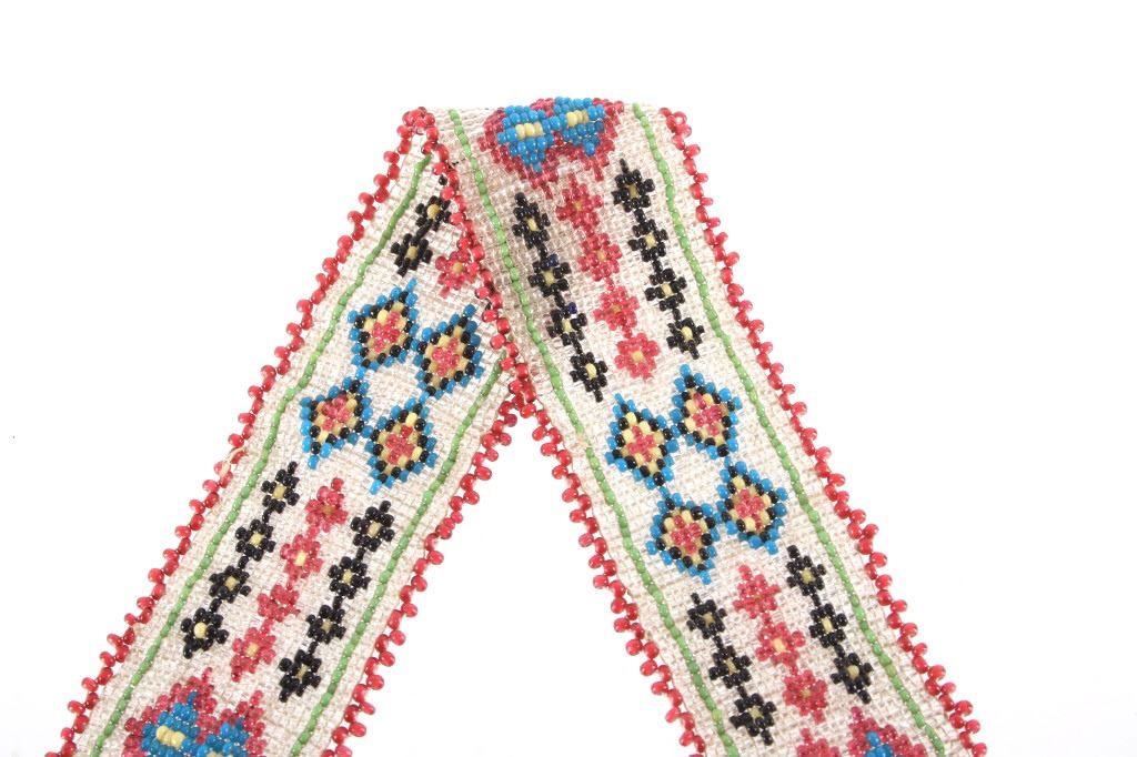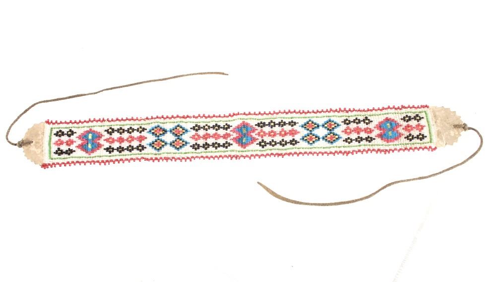 The lot features a fully loom beaded hat band from the Plains Native American Indians dating to the mid-1900's. The piece has Indian tanned buckskin hide outside tabs with scallop cut edge, Indian tanned hide ties, and a cotton thread-sewn loom-beaded section done in glass trade seed beads with a geometric pattern. The beads show a greasy yellow, semi-transparent, semi-transparent rose, black, red white heart, greasy blue, and greasy green. Measures overall 30" L from end of hide ties and 1.5" W.