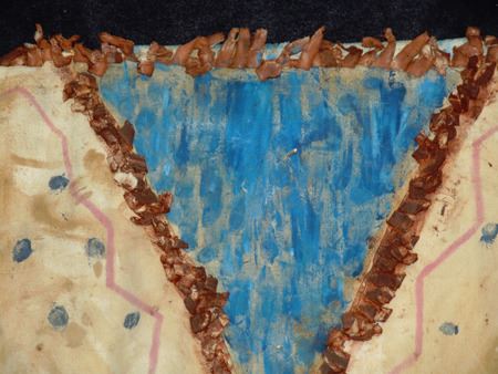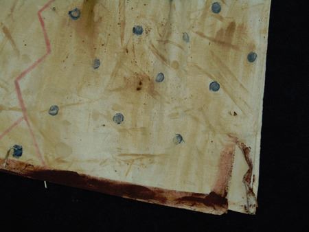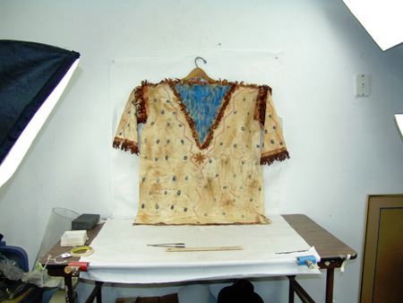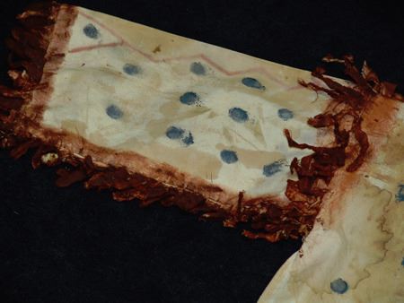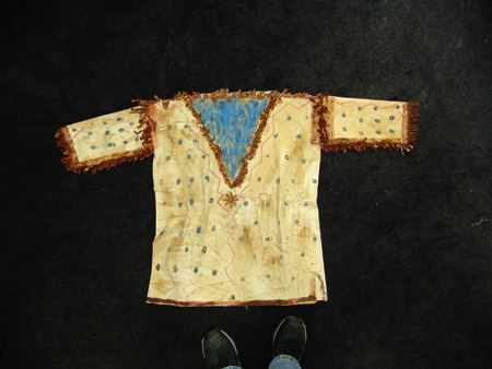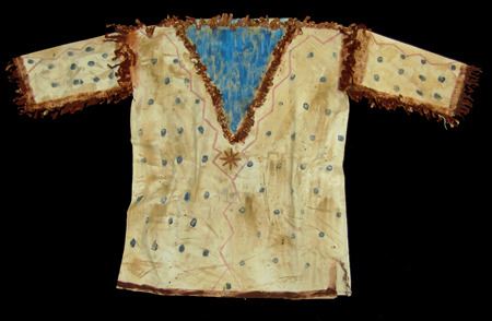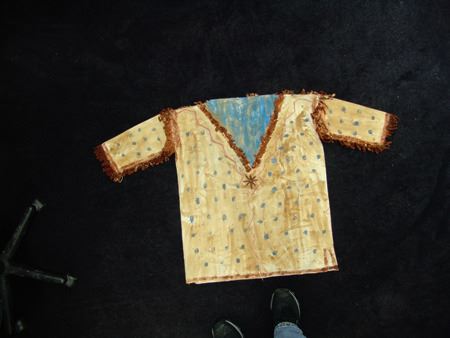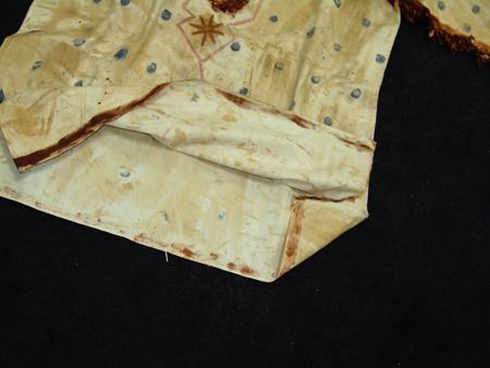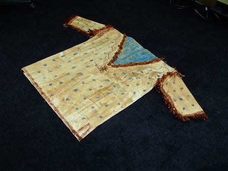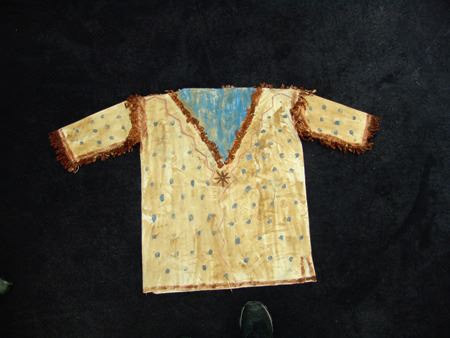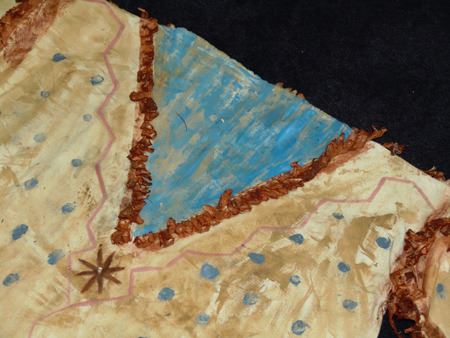 Mid/Late 1900s, Traditional design painted muslin shirt with dot and lightning designs and light blue "V" on front and back. Very good condition. 32" long, Men's L