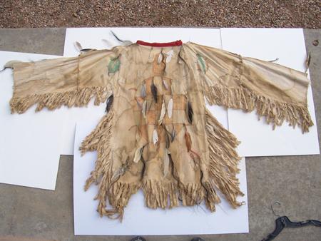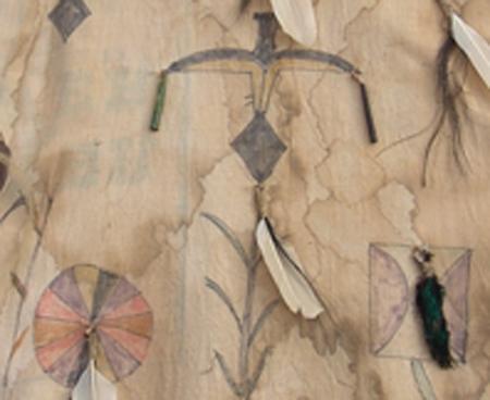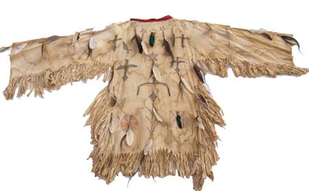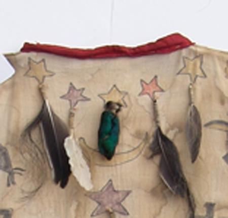 Traditional-style muslin shirt with many ghost dance figures on front and back including stars, diamonds, birds, etc. and feather and horsehair suspensions. Purchased from Turney in 1977 for 240; appraisal value $2,400. Condition: very good, shows no use.