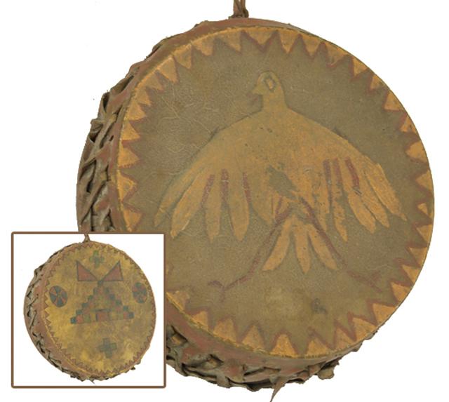 Early 1900s, Great old gaming drum with stretched rawhide heads, each with different symbols. 3" x 10" dia.