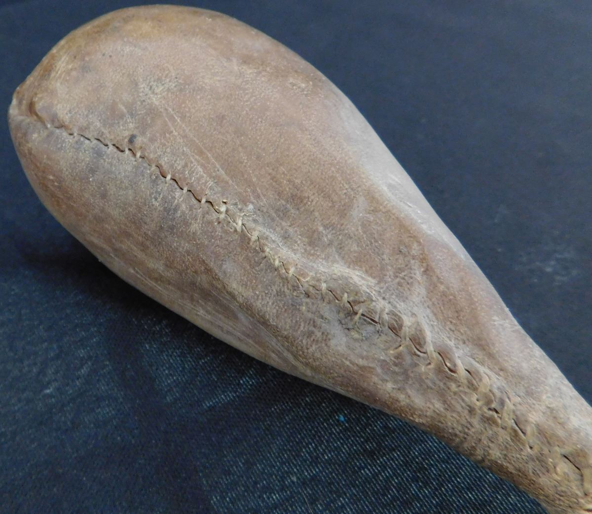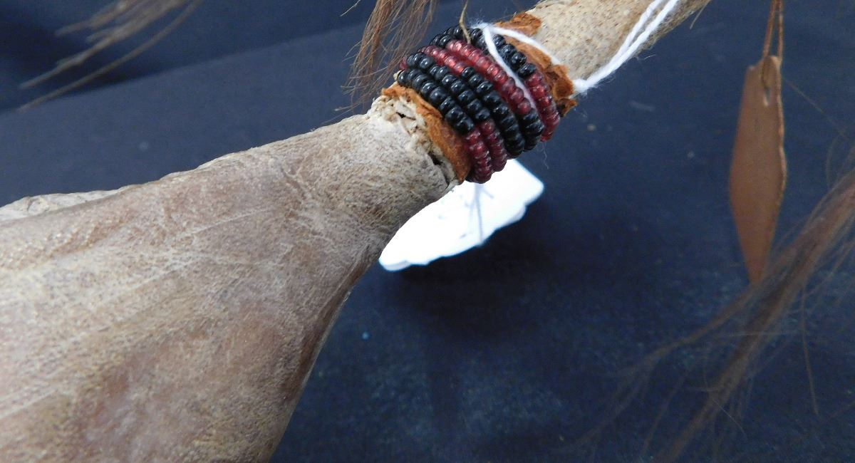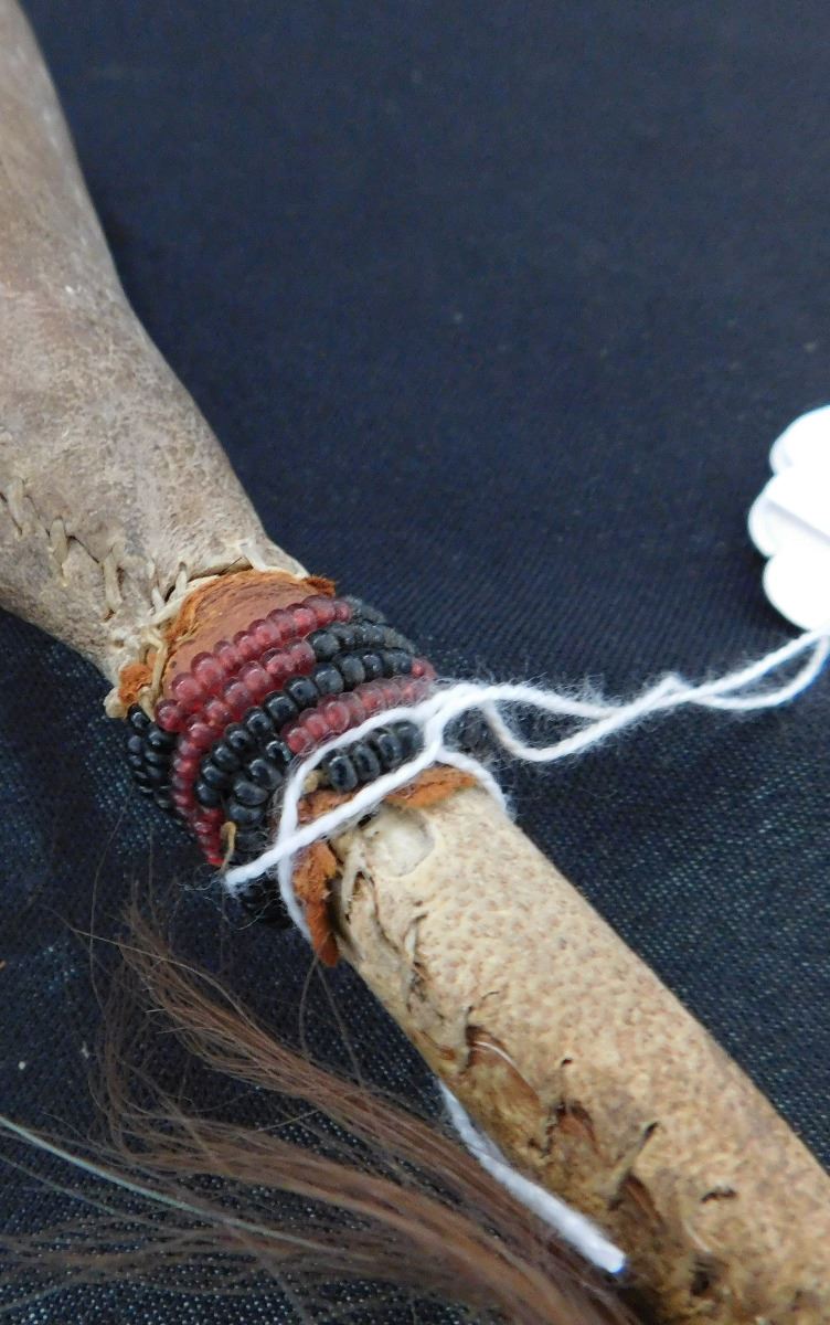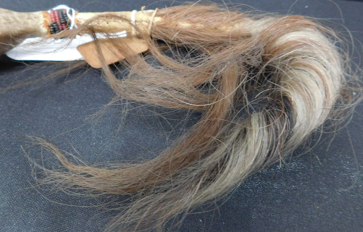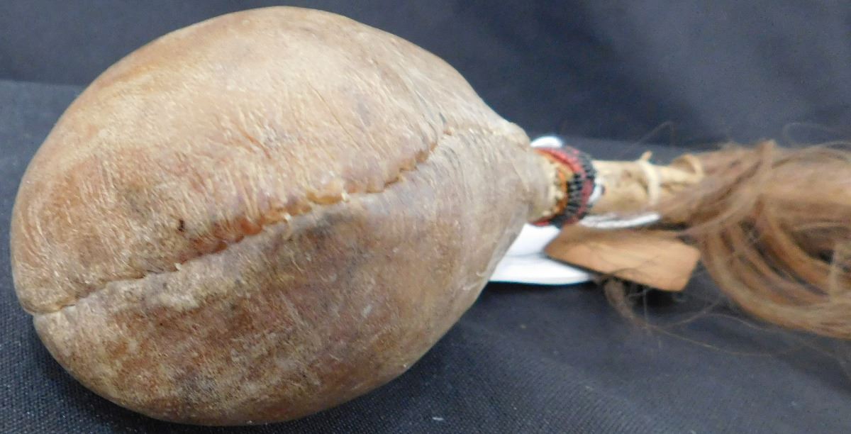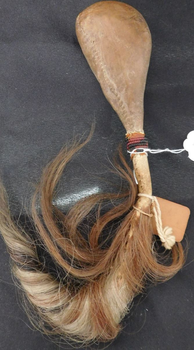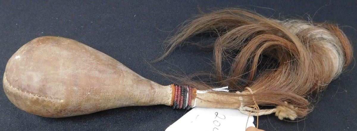 Plains Hide Rattle, circa 1890s, made of rawhide, horse hair and glass beads. Item measures 17 x 2.5 x 2 inches. It is Sioux, from the Dakotas. This rattle has nice sound and very old beads. Condition: It is worn and there is an old tag, see images. Shipping: $18.50