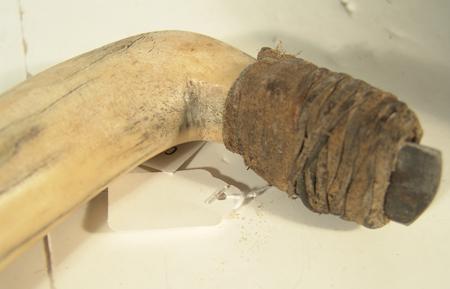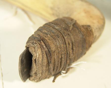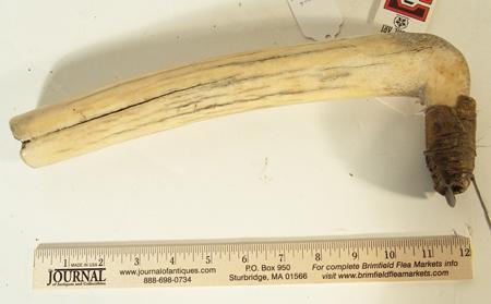 Classic old carved elk horn handle with forged iron blade lashed with buckskin. Condition: very good. 13-1/2"