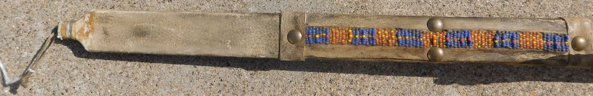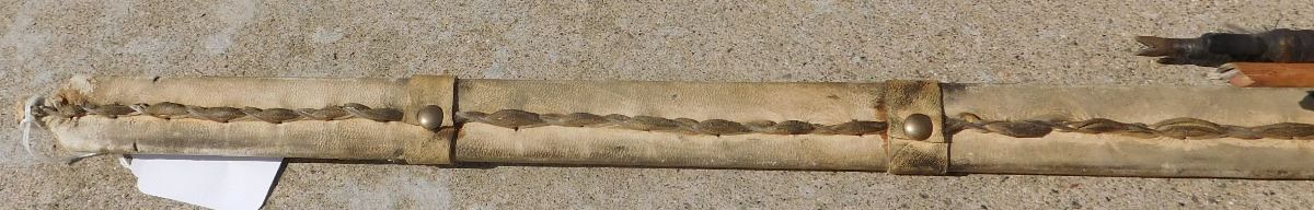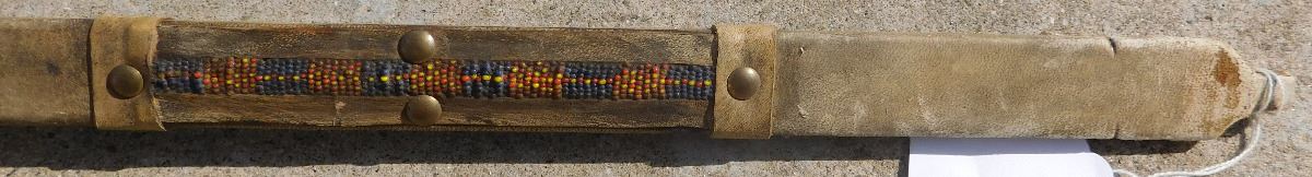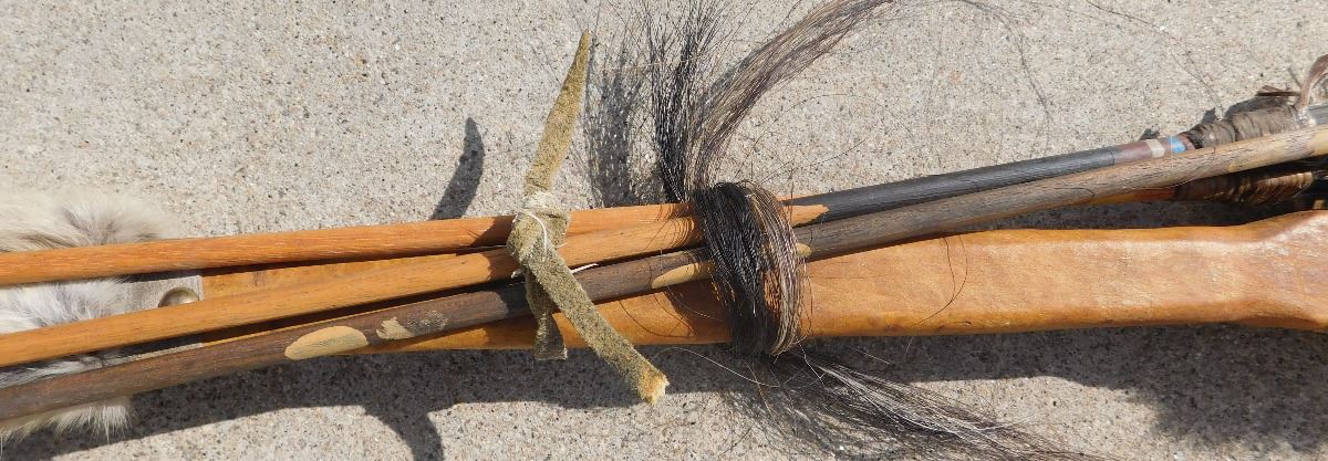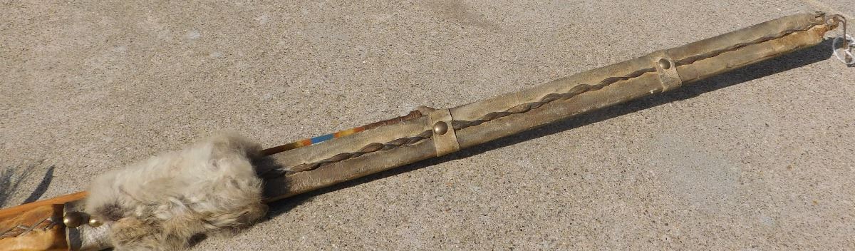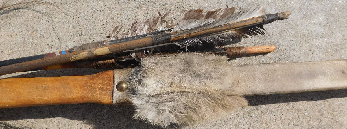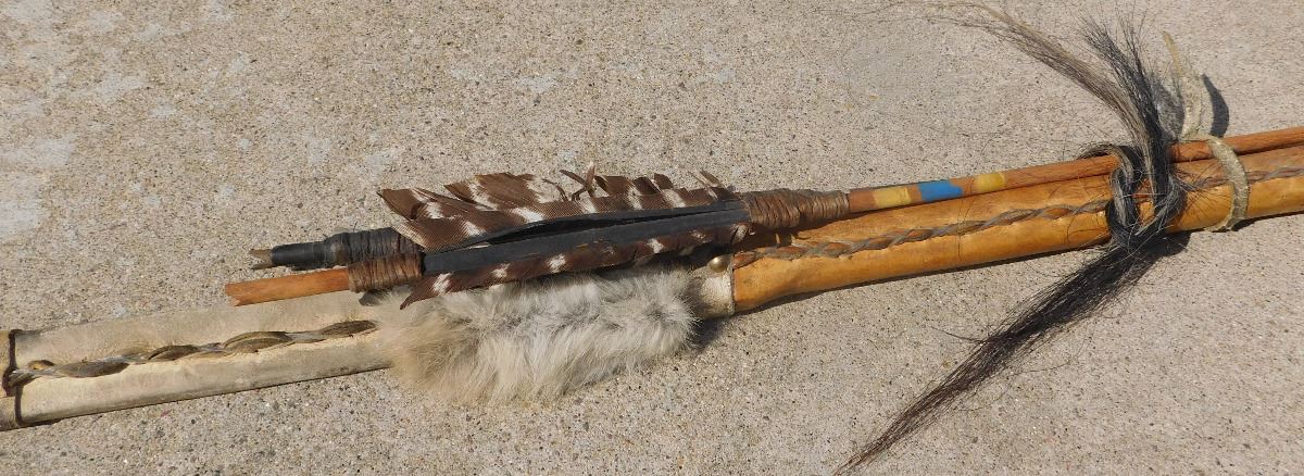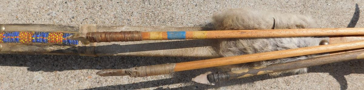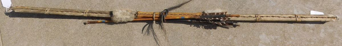 Plains Hunting Bow, mid-20th Century item. Made of wood, leather, glass beads, brass tacks and horsehair, this item measures 60" x 2" x 1.5", arrows measure 29" long. Sioux, South Dakota. Flint arrowtips on heads, heavy bow, completely covered in buffalo hide. Condition: Some wear, no bow string, see images. Shipping: $45, due to length.