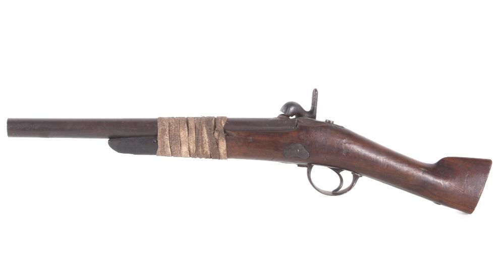 Superb example of a Plains Indian “Blanket Gun” or “Buffalo Runner’s” cut-down percussion musket. Originally, these shortened, large caliber lightly rifled muskets were utilized by mounted horseman who galloped into herds of bison shooting guns and arrows at point blank range. Short barrreled muzzle loaders were about the only pre-cartridge firearms that could be quickly loaded while on horseback. Powder was poured, a naked ball was dropped, a percussion cap placed on the nipple below the cocked hammer and the firearm held muzzle high to keep the load settled. When ready to fire, the rider simply lowered the arm and fired before the ball had a chance to move off the powder