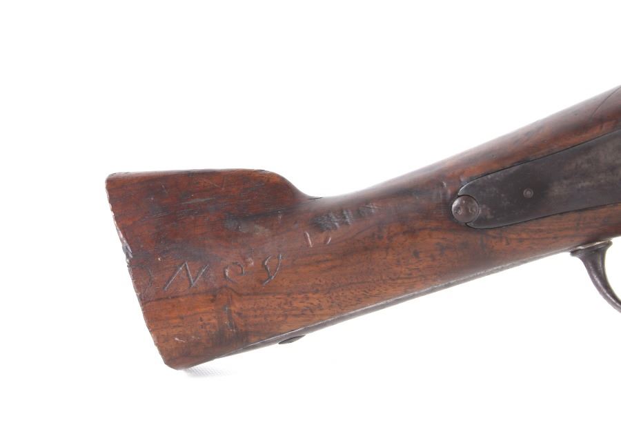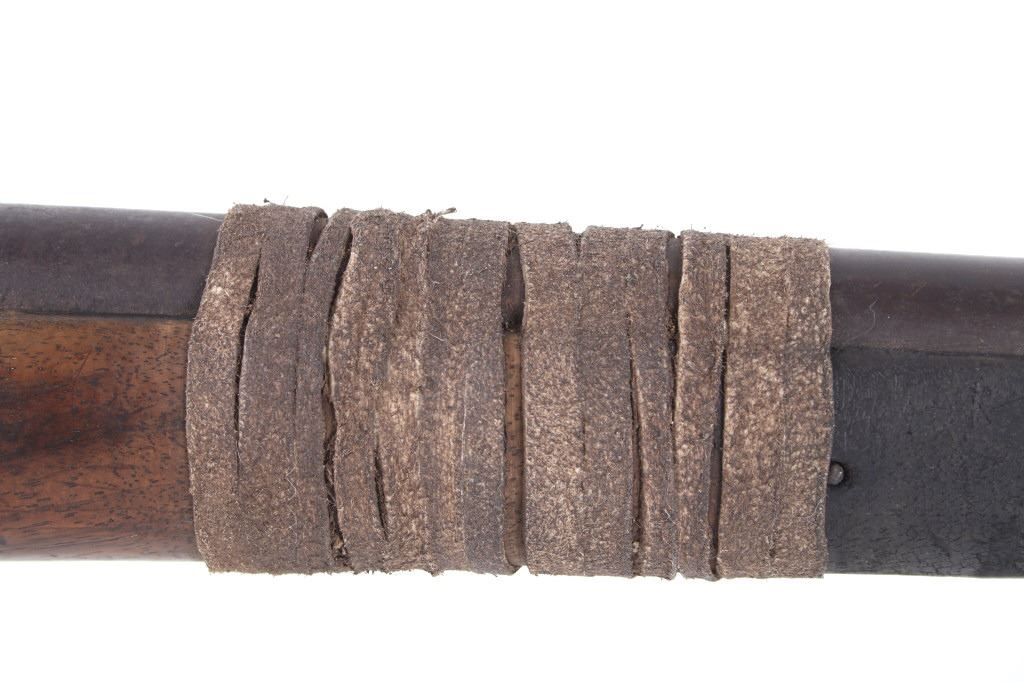 cut from a typical .72 caliber musket that is typical of the type sold or traded to the Plains Indians of the Pre-Civil War and Post-Civil War era. The lock functions and the lock plate has some vestige of markings that may be French or Belgian in origin, which would be typical of trade muskets. There is also considerable aged black powder pitting around the hammer/nipple area from decades of use. As expected, Overall metal has aged to a deep brown, uncleaned patina. The rear portion of the stock has been cut just behind the comb and shows some undeciphered light carved marks or symbols on the right rear portion. Forward of the lock is wound rawhide strips used to secure the barrel to the forend.