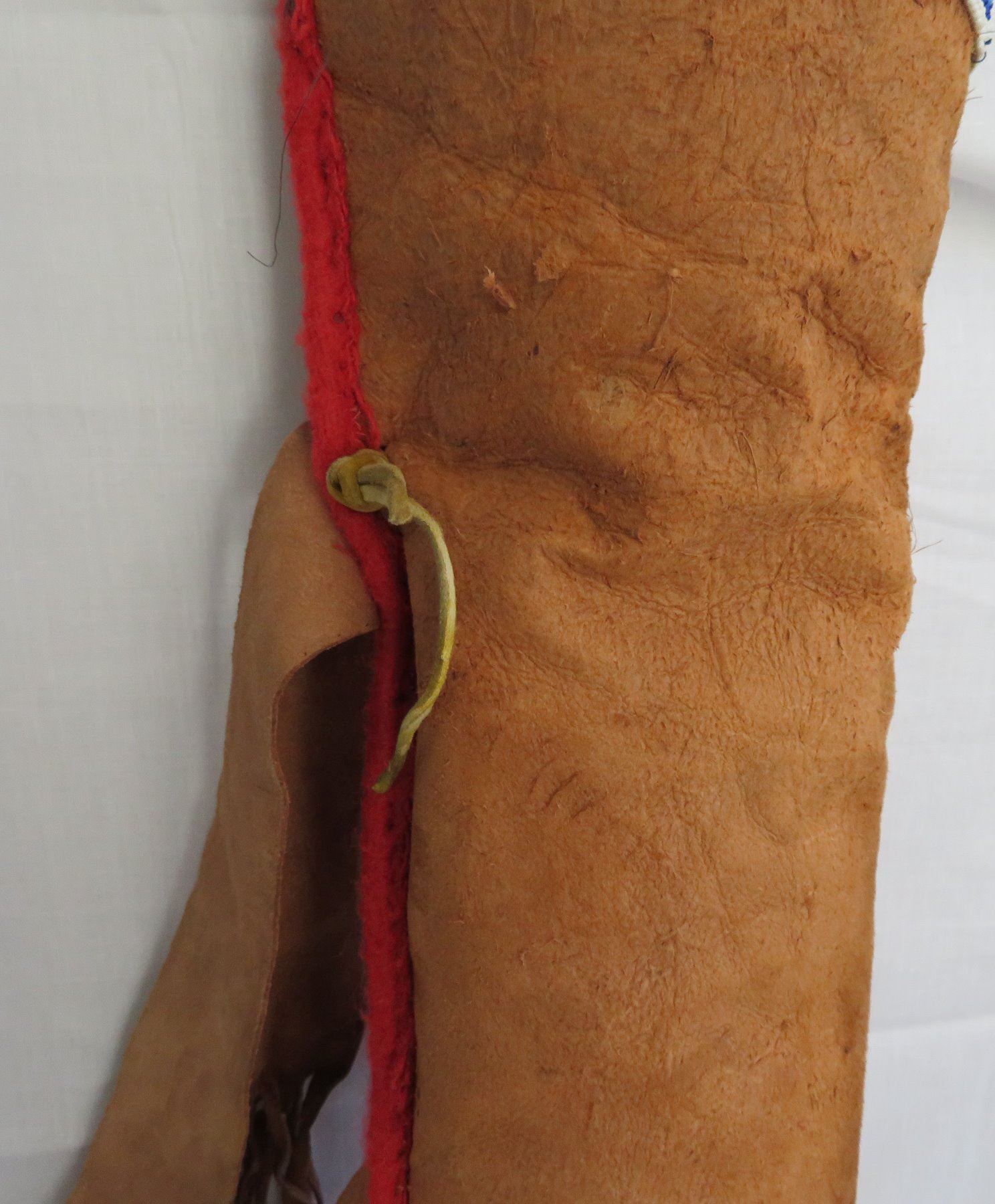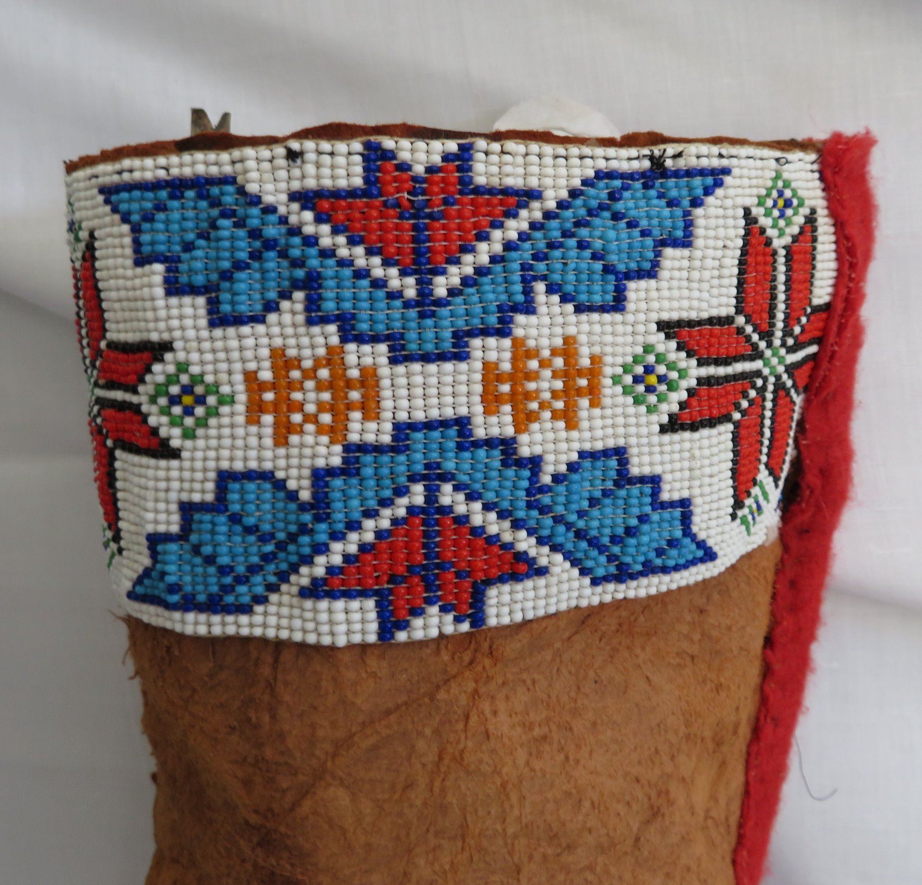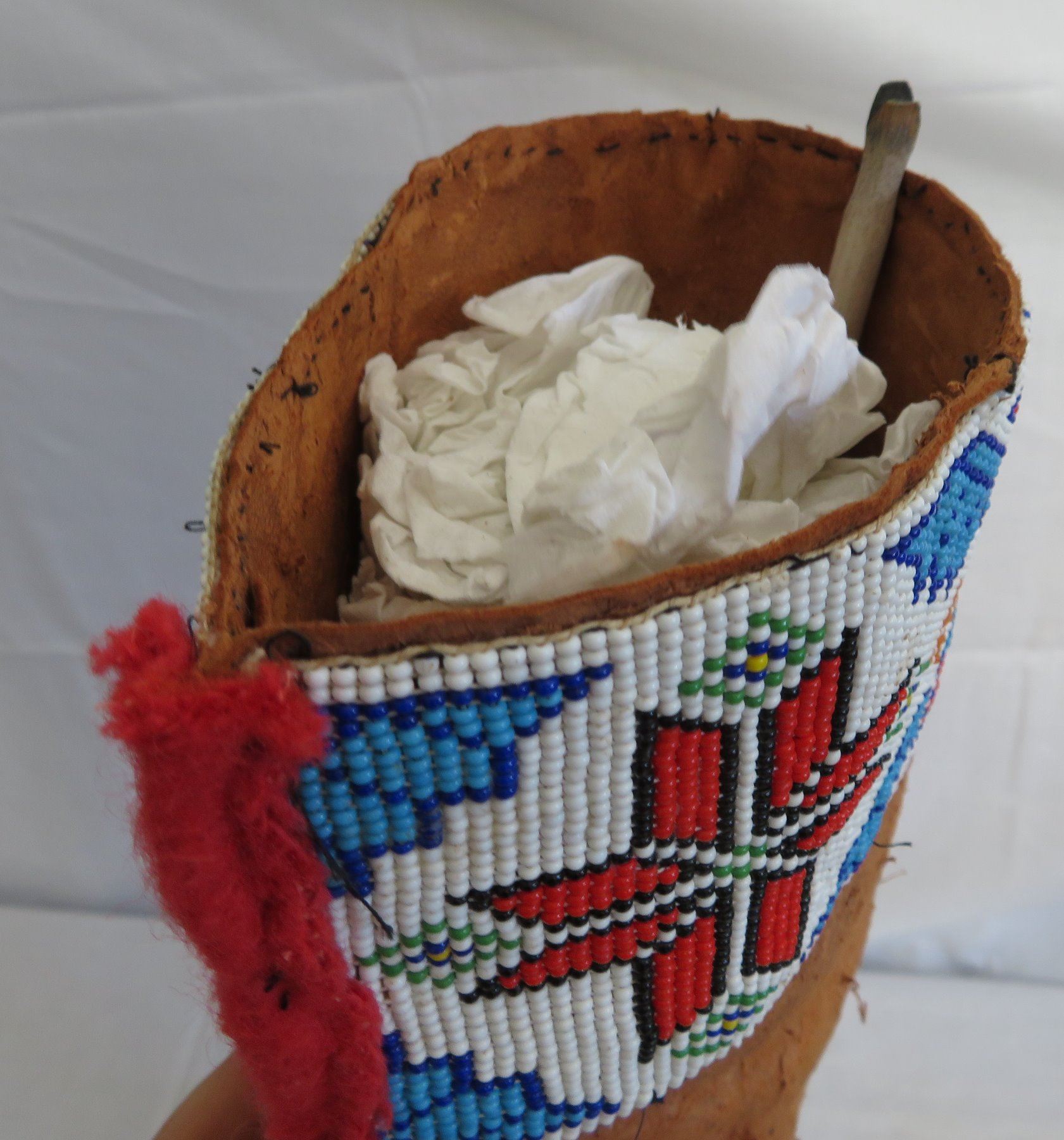 Plains Indian Beaded Arrow Quiver, c. 1950s. Made of bucksin, seed beads, fringed strap, red selvedge cloth, arrow, the quiver measures 28" x 6" and carrying strap 40" x 2". Central Plains, Arapaho, Sioux. Gently used Native American, Plains Indian beaded bucksin arrowcase/quiver. Condition: Good, some wear and bead loss, see images. Shipping: $26.50 w/insurance and signature.