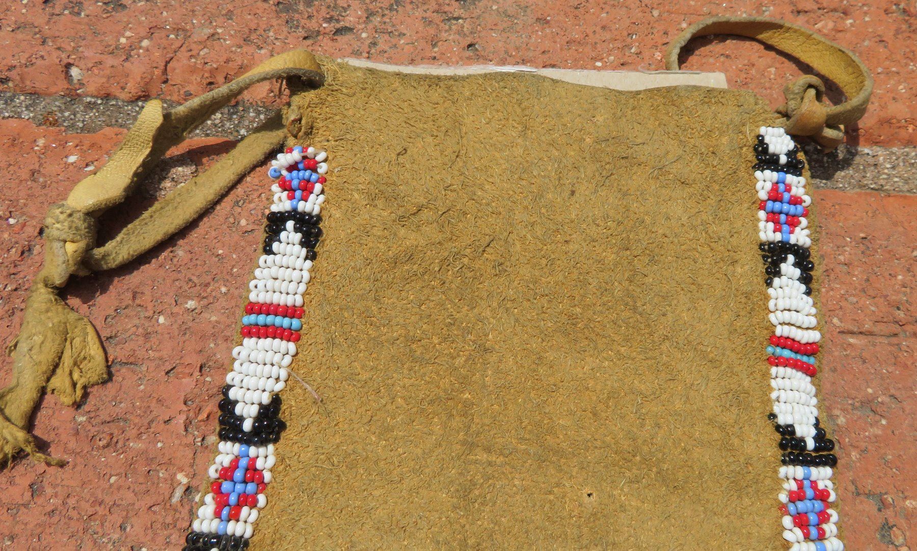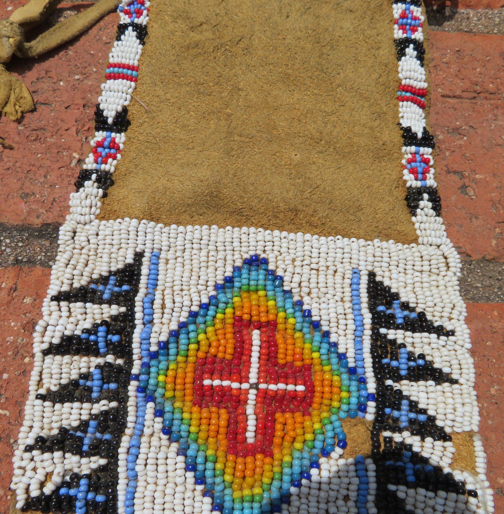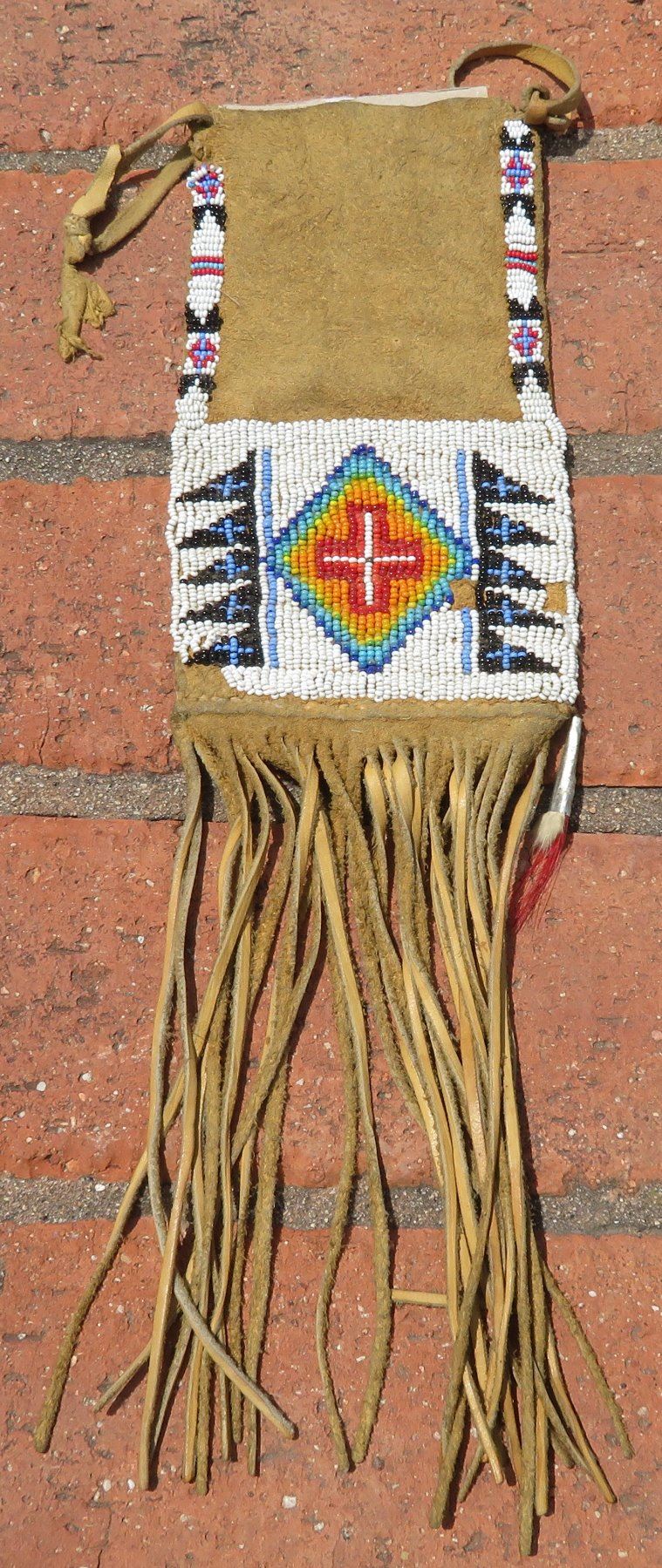 Plains Indian Beaded Bag, c. 1940s. Made of leather, glass beads and tin, the item measures 5" x 10" with a 9" long fringe. Plains Indian, Sioux. Nice multicolored cross beaded on bag. Condition: Good, some wear, see images. Shipping: $16.50 w/insurance and signature.