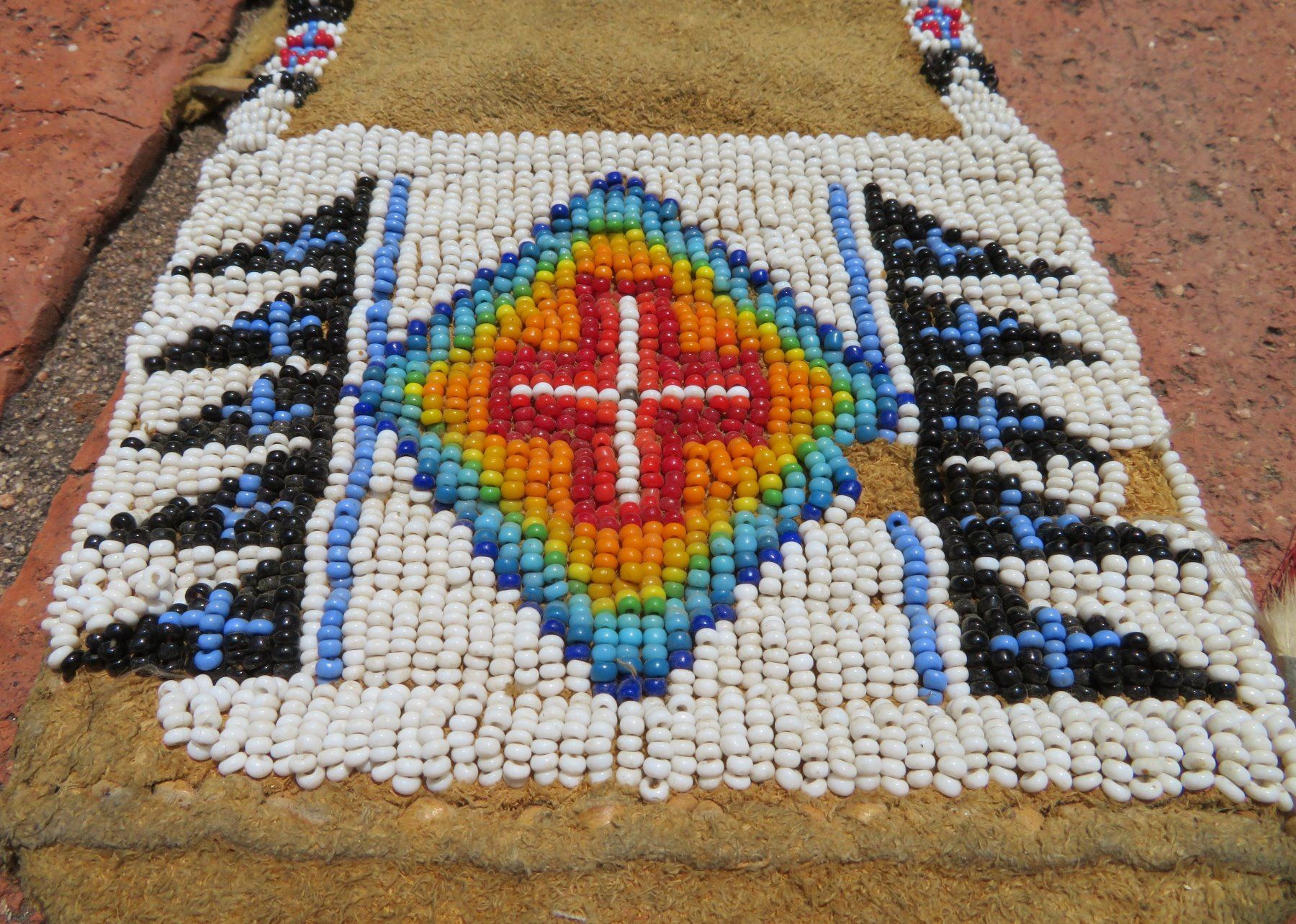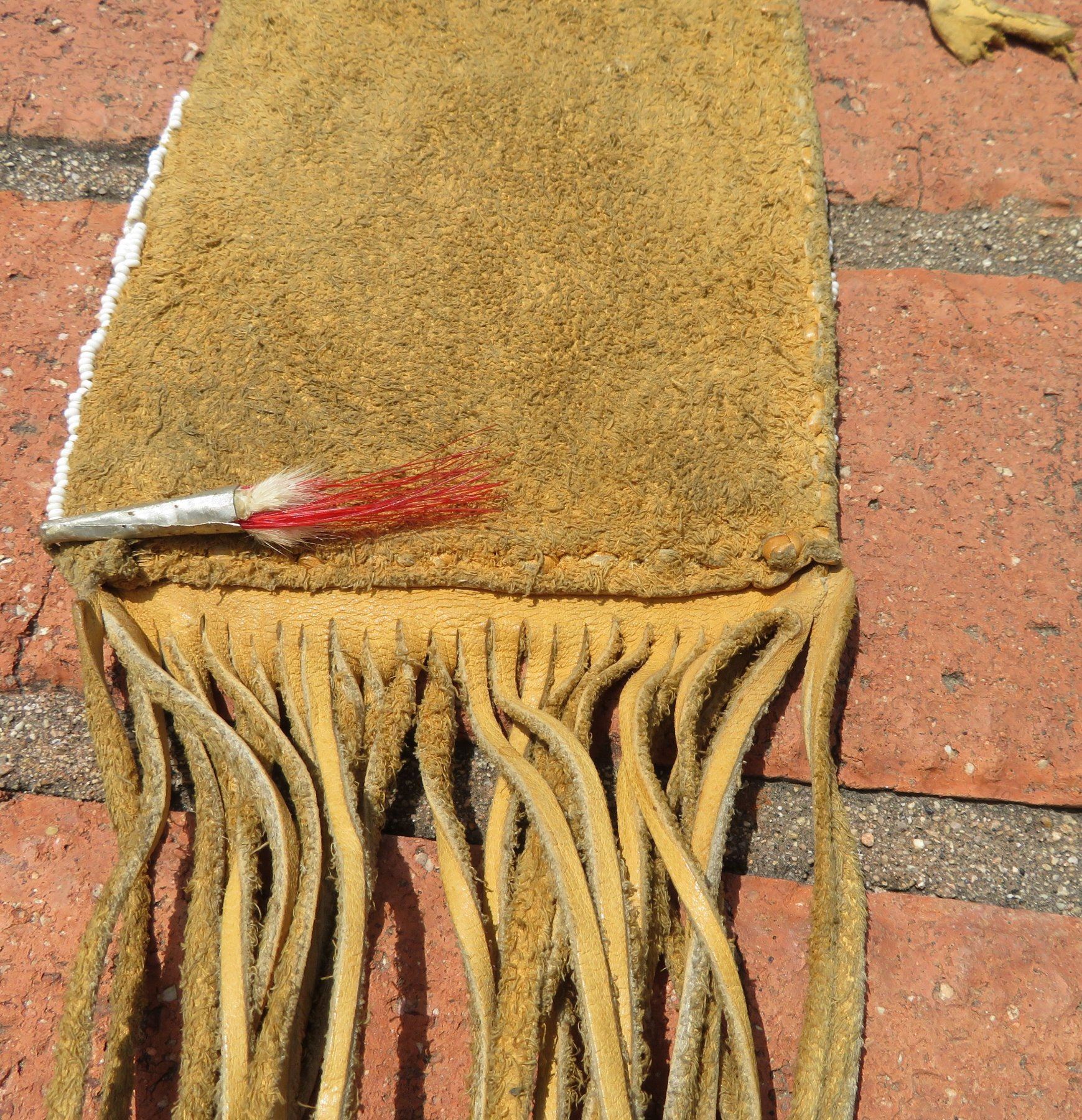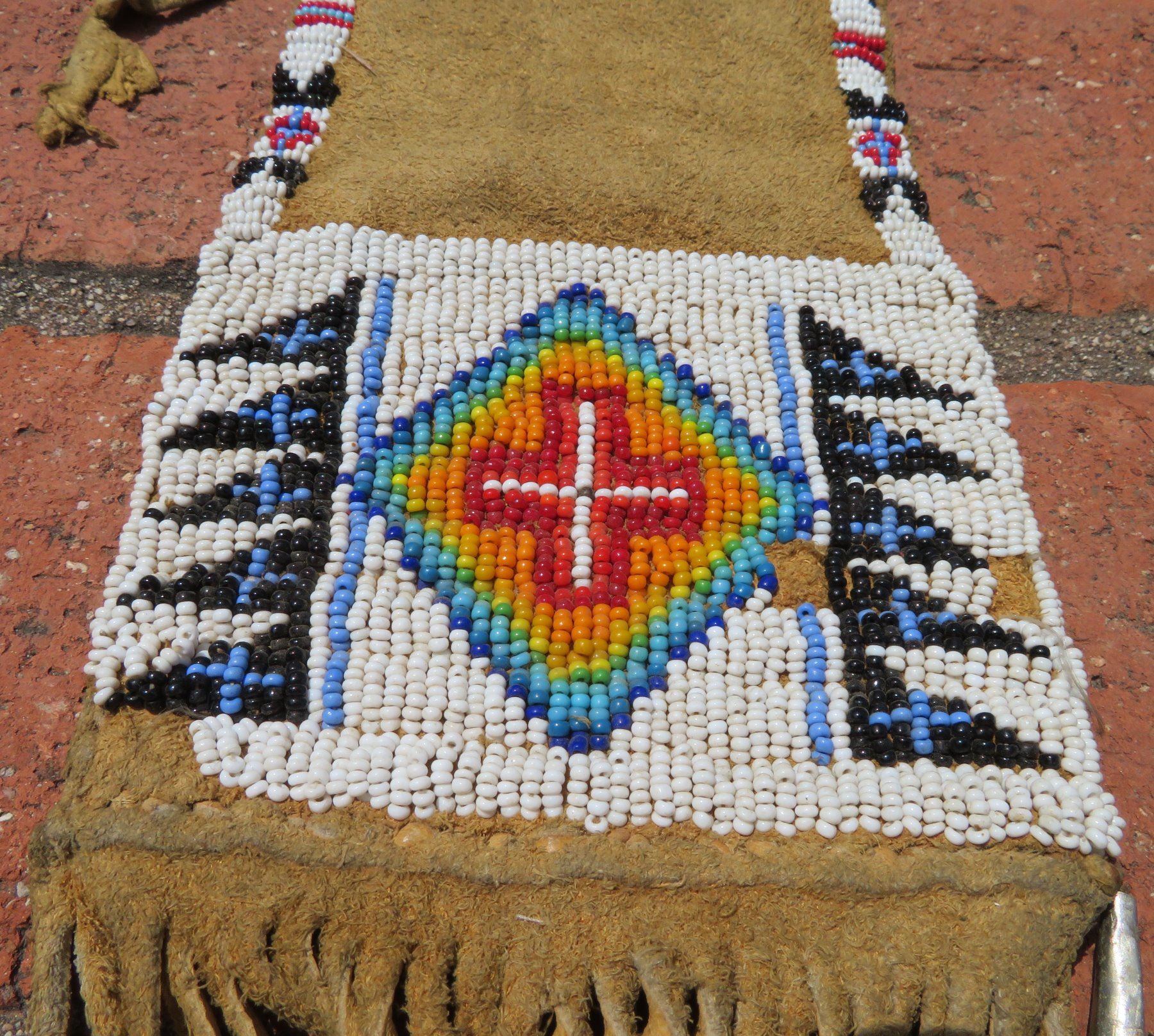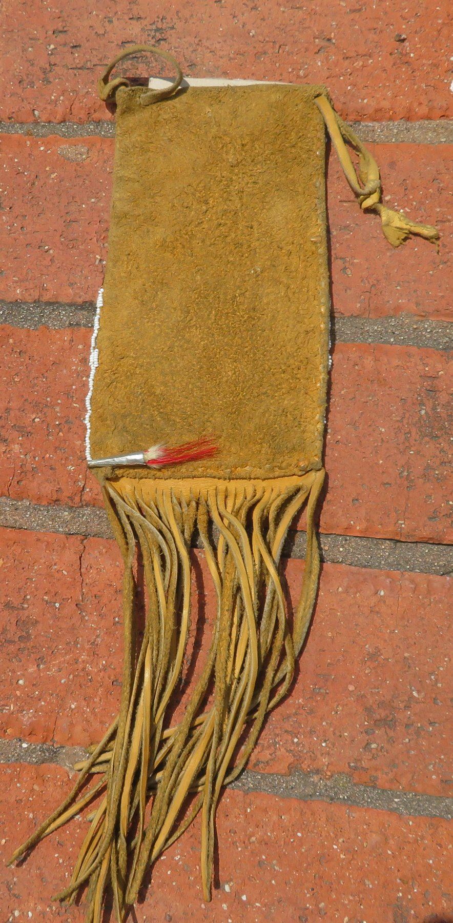 Plains Indian Beaded Bag, c. 1940s. Made of leather, glass beads and tin, the item measures 5" x 10" with a 9" long fringe. Plains Indian, Sioux. Nice multicolored cross beaded on bag. Condition: Good, some wear, see images. Shipping: $16.50 w/insurance and signature.