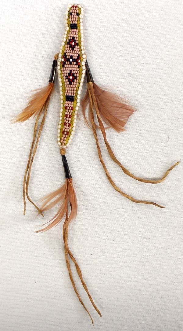Vintage Native American Plains Indian Beaded Umbilical Cord Lizard Fetish, embellished with feathers and tin cones, measures .75'' x 4.5''