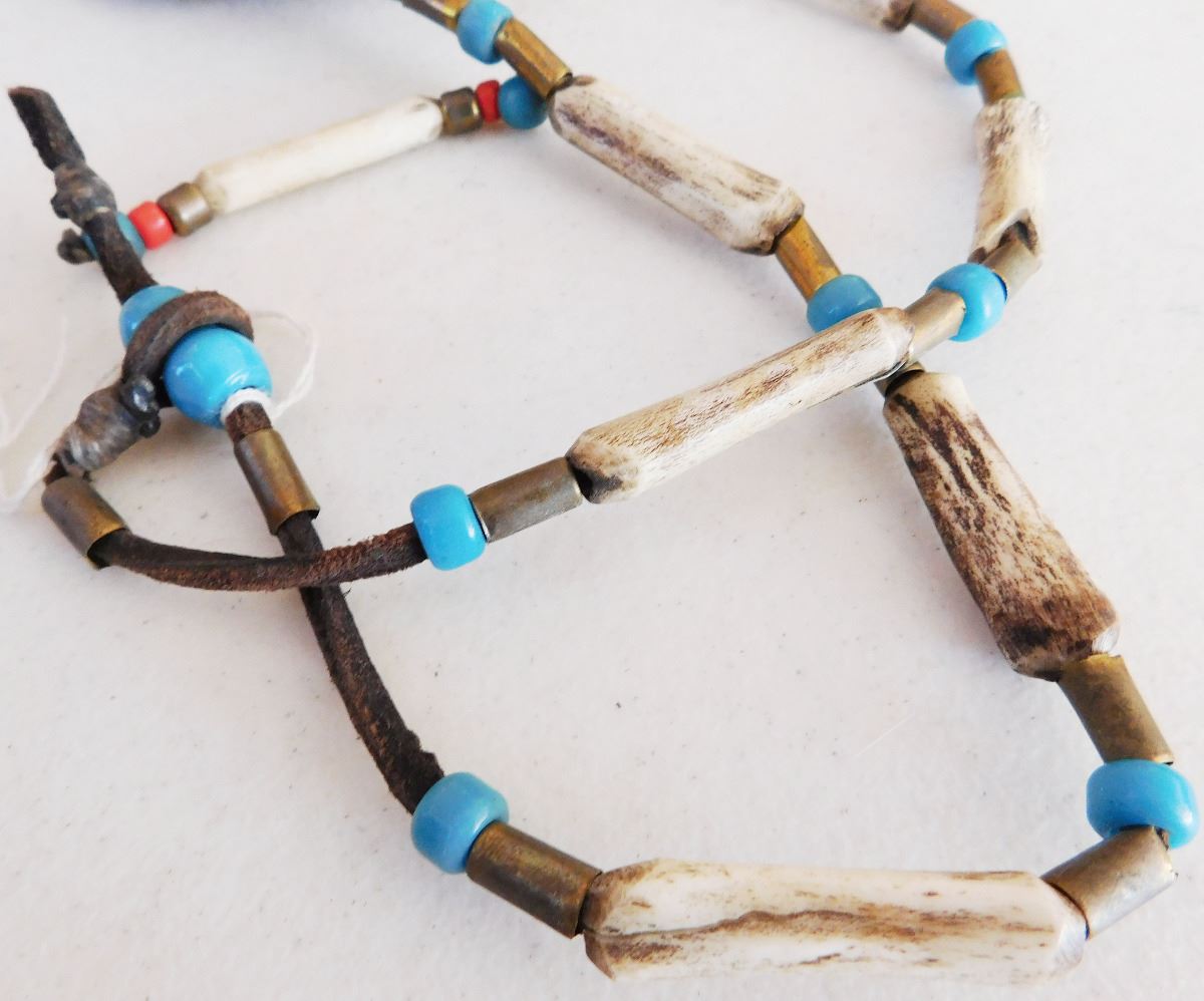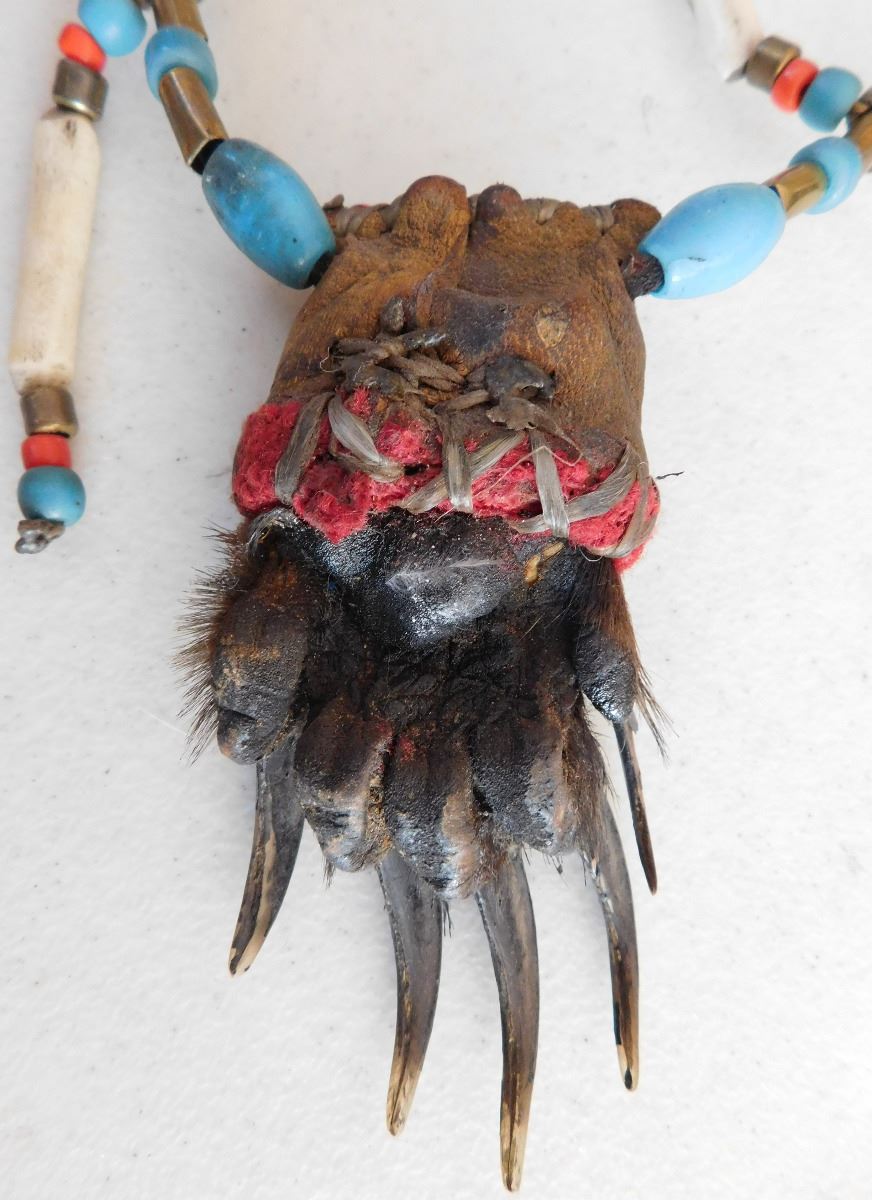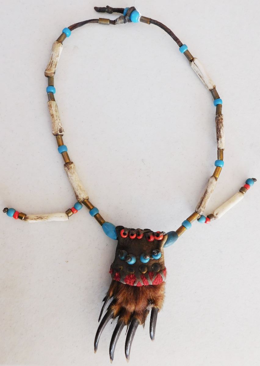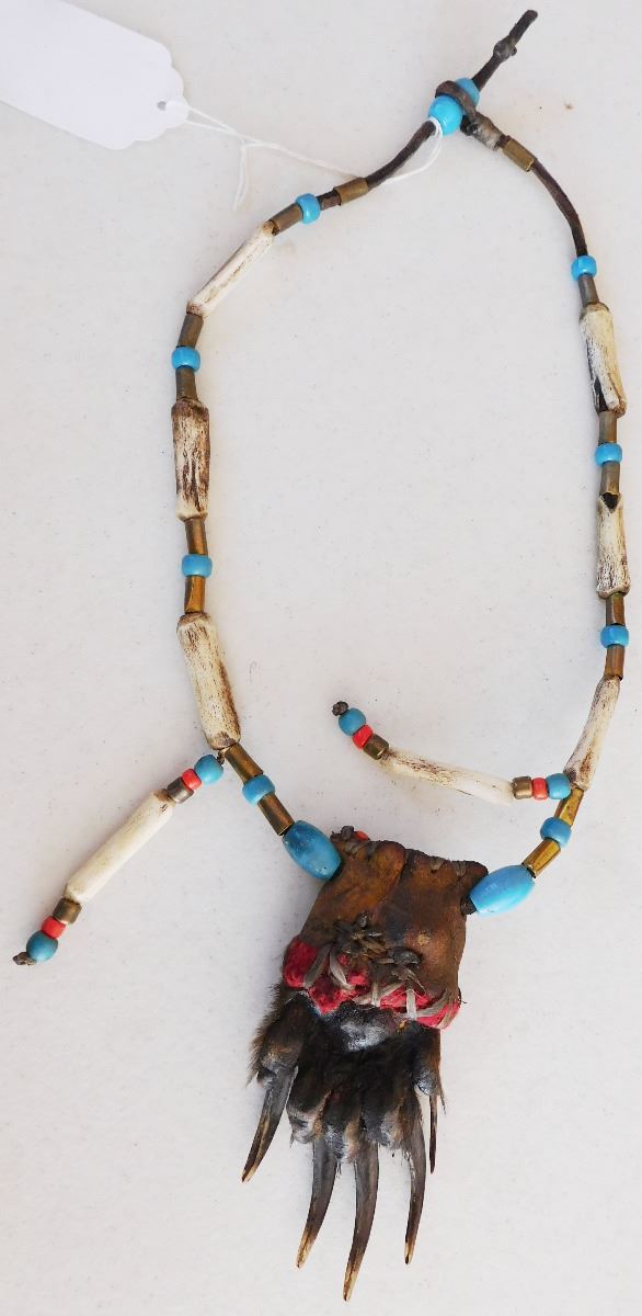 Great unusual necklace with brass beads, leather, beaver foot, gone and glass beads. Item is believed to be 1900's from Sioux or Dakota. The brass beads were made from old bullet casings. It measures 22 inches and is in good condition. Shipping: $14.50