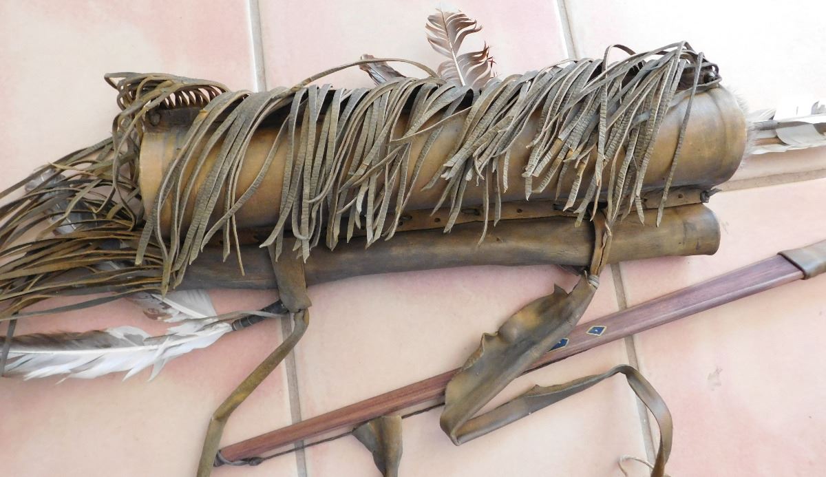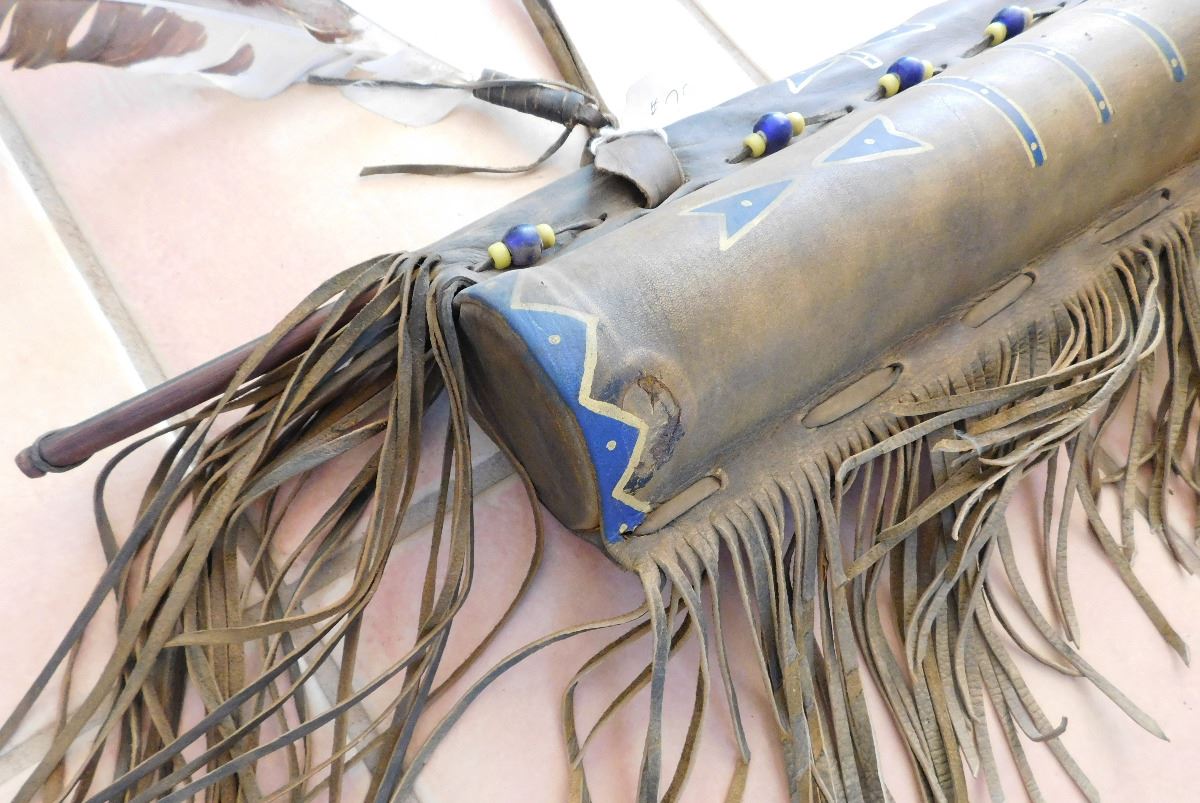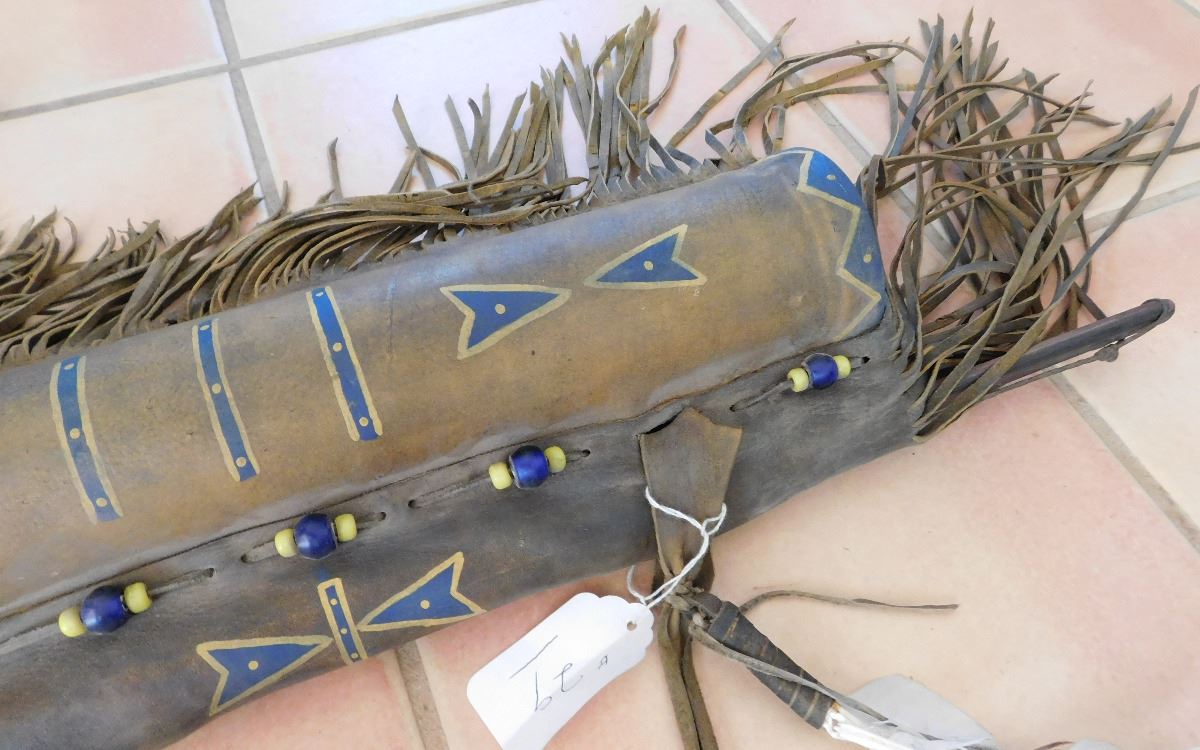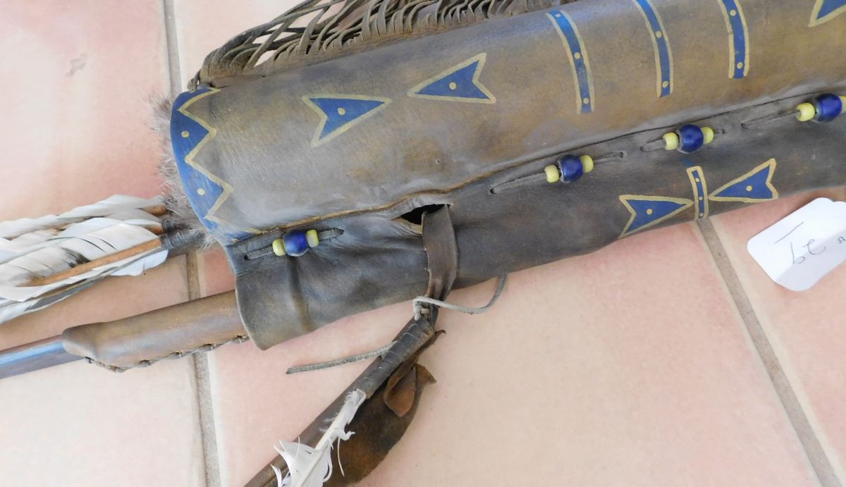 Plains Indian Bow & 3 Arrows w/Quiver and Bow case, circa 1900s. Made of leather, paint, feathers, wood, hide, wire and beads; the bow is 50" long and the quiver is 19". Sioux, from the Dakotas. Very rare cobalt blue beads on bow case and quiver. Condition: Some dust, wear and scuffs, see images. Shipping: $85.00