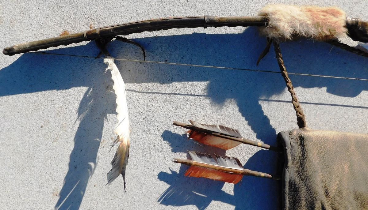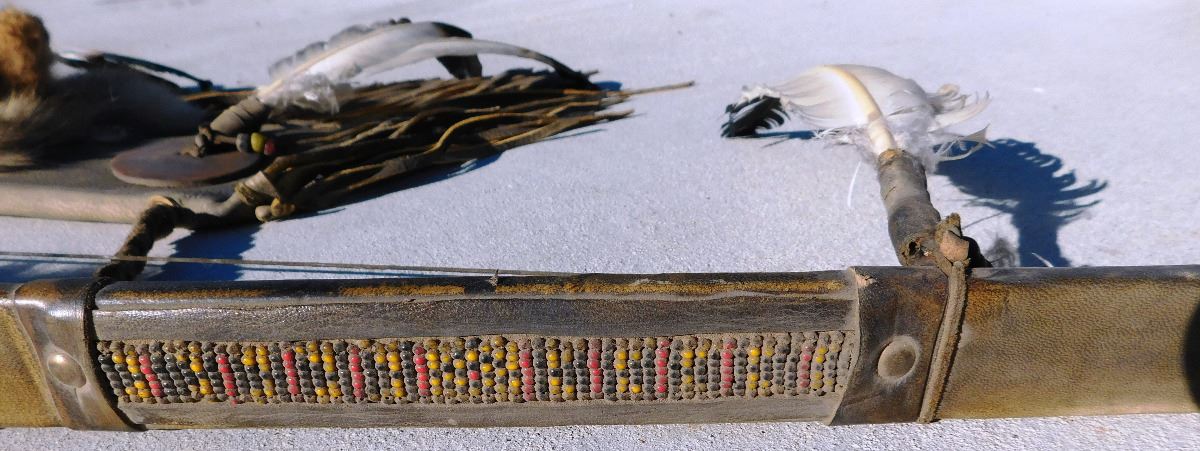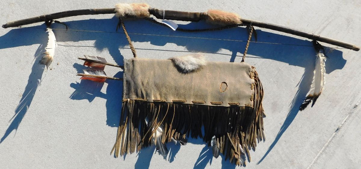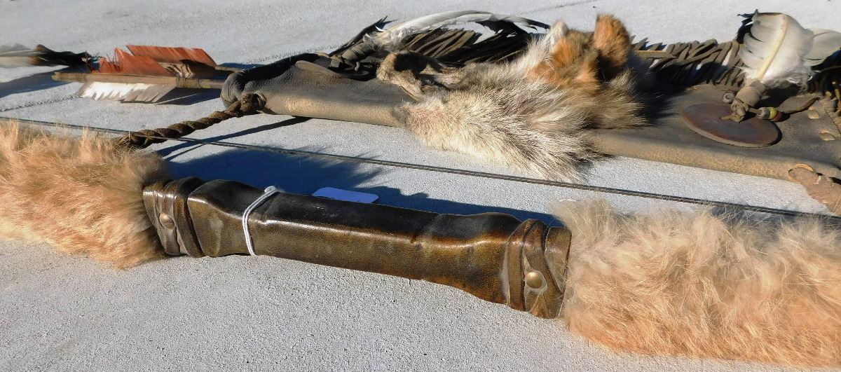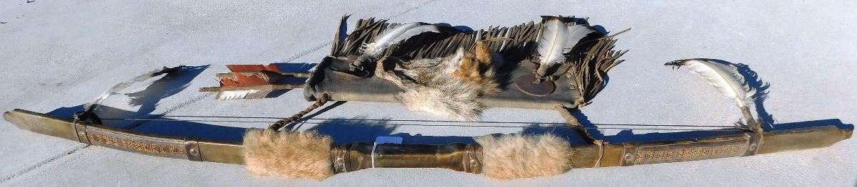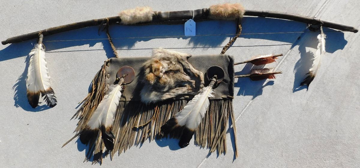 Plains Indian Bow, Arrows and Quiver, circa 1900s. The bow measures 54" x 2" x 2" and the quiver is 18" x 7" x 2". This item features rawhide, wood, feathers, fur, brass tacks and glass beads. Please note the actual coyote face on quiver. Bow is completely covered in rawhide to give it extra strength. Condition: There is some dust, wear and scuffs. Shipping: $48.00.