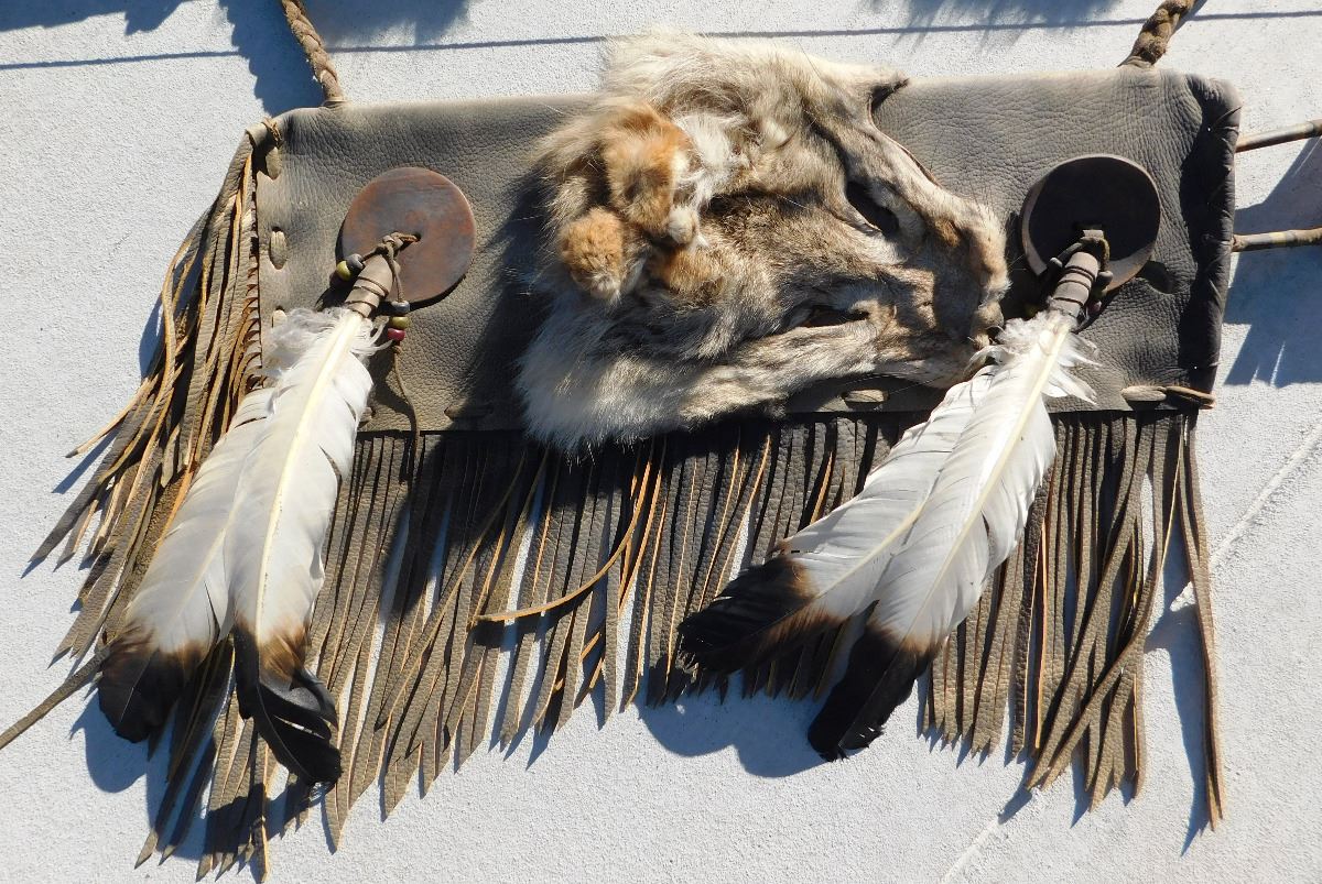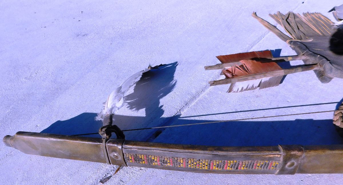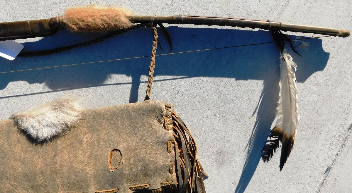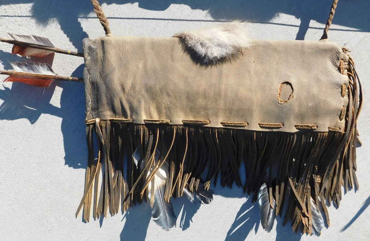 Plains Indian Bow, Arrows and Quiver, circa 1900s. The bow measures 54" x 2" x 2" and the quiver is 18" x 7" x 2". This item features rawhide, wood, feathers, fur, brass tacks and glass beads. Please note the actual coyote face on quiver. Bow is completely covered in rawhide to give it extra strength. Condition: There is some dust, wear and scuffs. Shipping: $48.00.