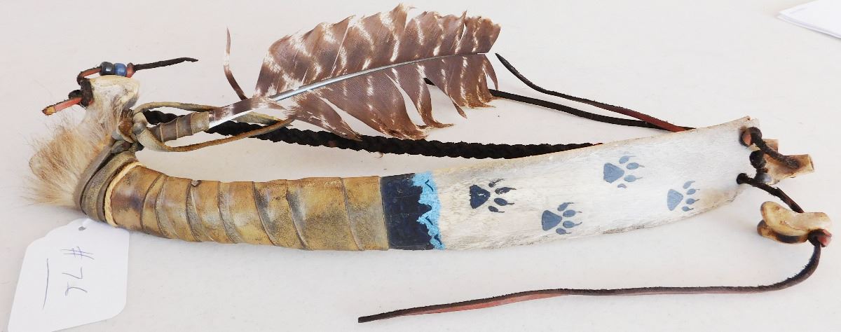 Plains Indian Buffalo Rib Dance Bow, circa 1900. Made of bone, fur, feathers, and glass beads. Item measures 16" x 2" x 1". Sioux, Dakota. Condition: Nice paint, good condition, possibly some tip breakage, see images. Shipping: $16.50