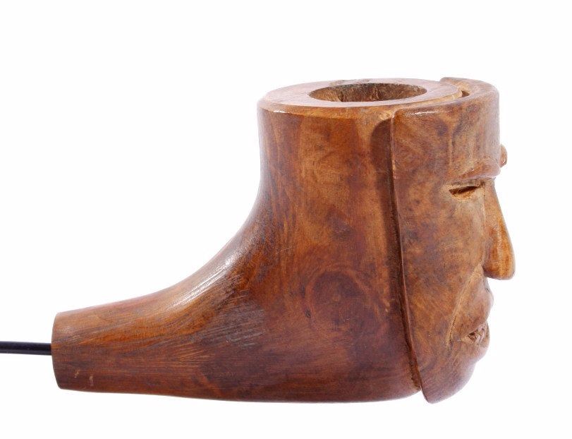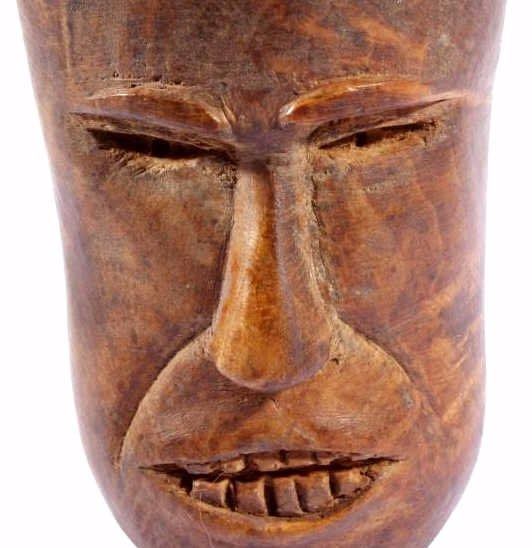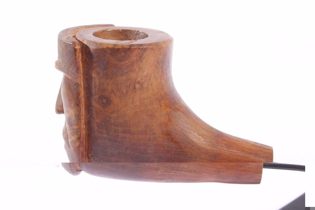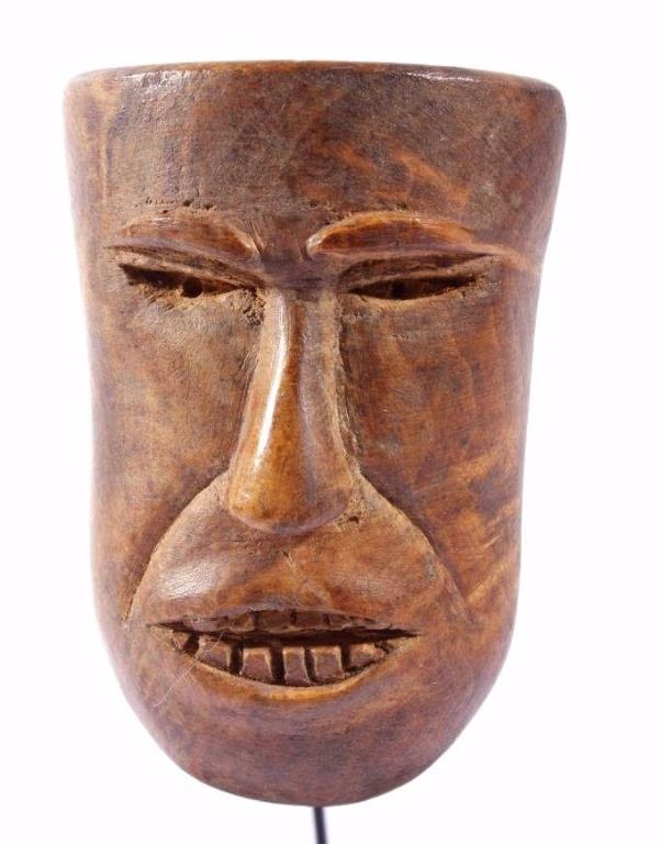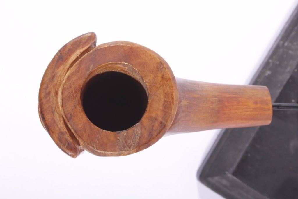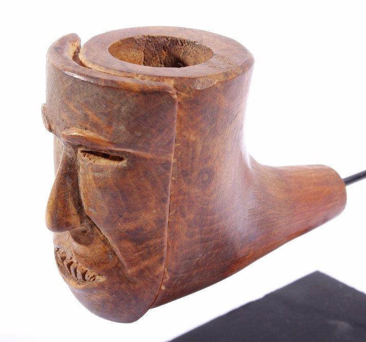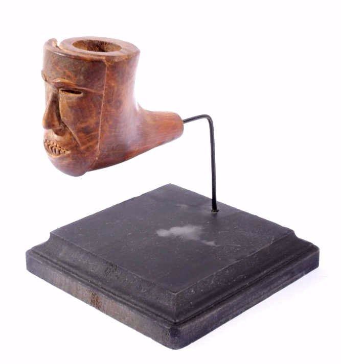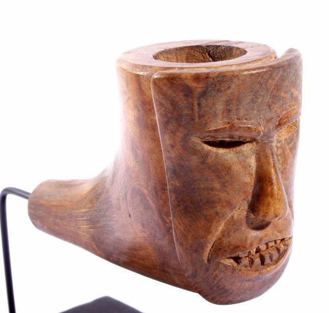 This is a wonderfully hand carved burl wood tobacco pipe bowl from the Plain Native American Indians. The 19th century piece shows a unique carved face effigy design with mask like front and detailed teeth. The piece shows good condition for its age and displays very well on the custom display. The pipe is 3 1/8"L x 2 1/8"H x 1.5"W.