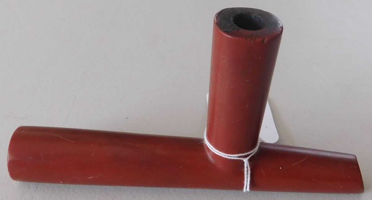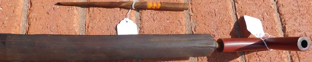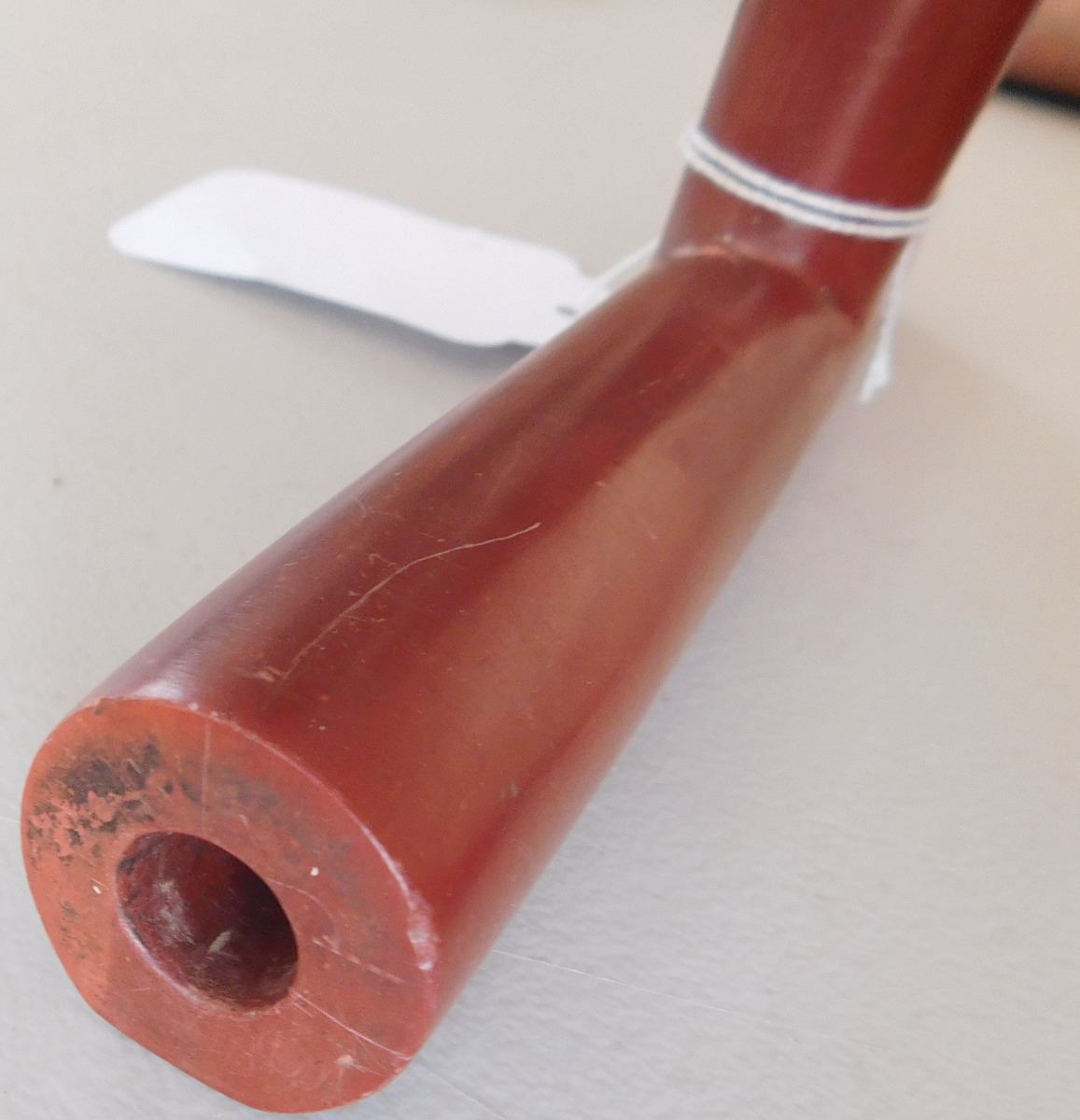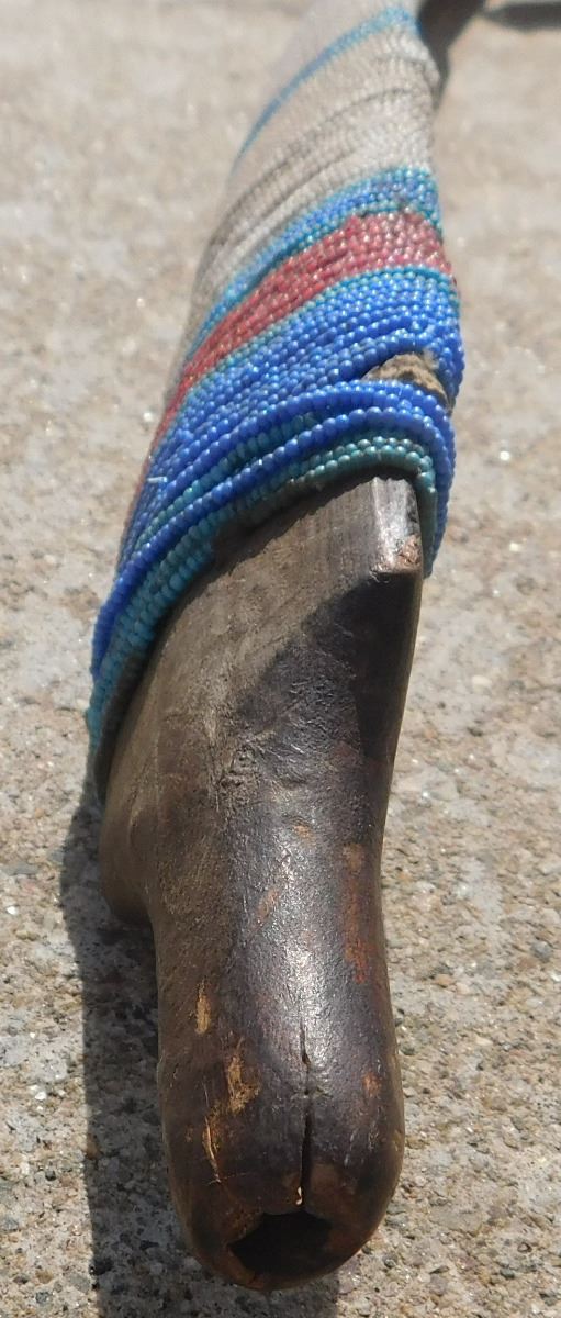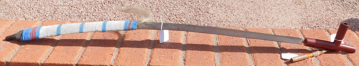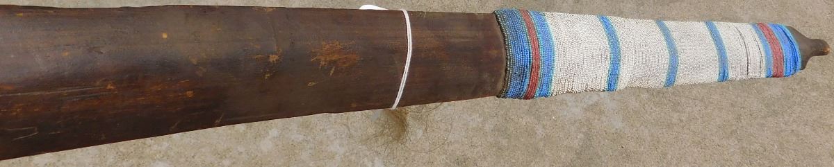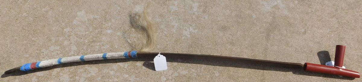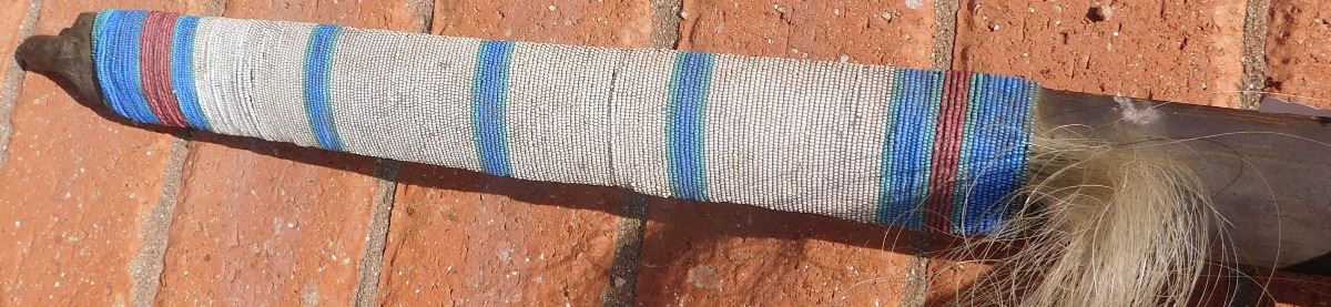 Plains Indian Council Pipe, Stem & Tamper, late 19th, early 20th century item. Made of wood, glass beads, horsehair, catlinite bowl, quilled tamper, pipe and stem measure 50" x 2" x 1" and tamper measures 11.5" long. Sioux, North Dakota. Very rare pipe, seldom seen! Condition: Stem has curved over the years, see images. Shipping: $50, due to length/size.