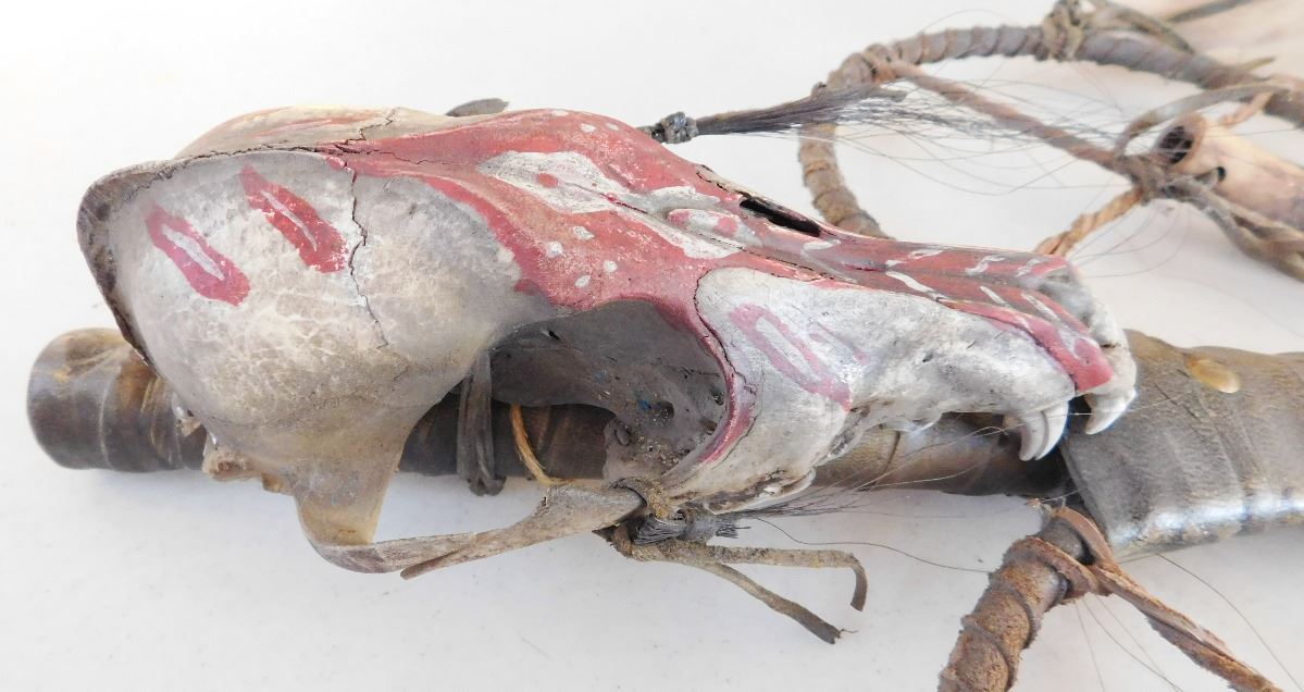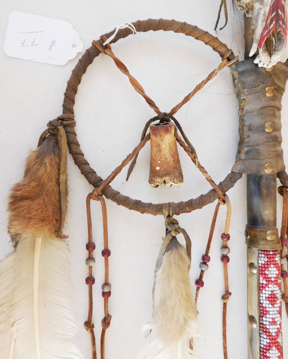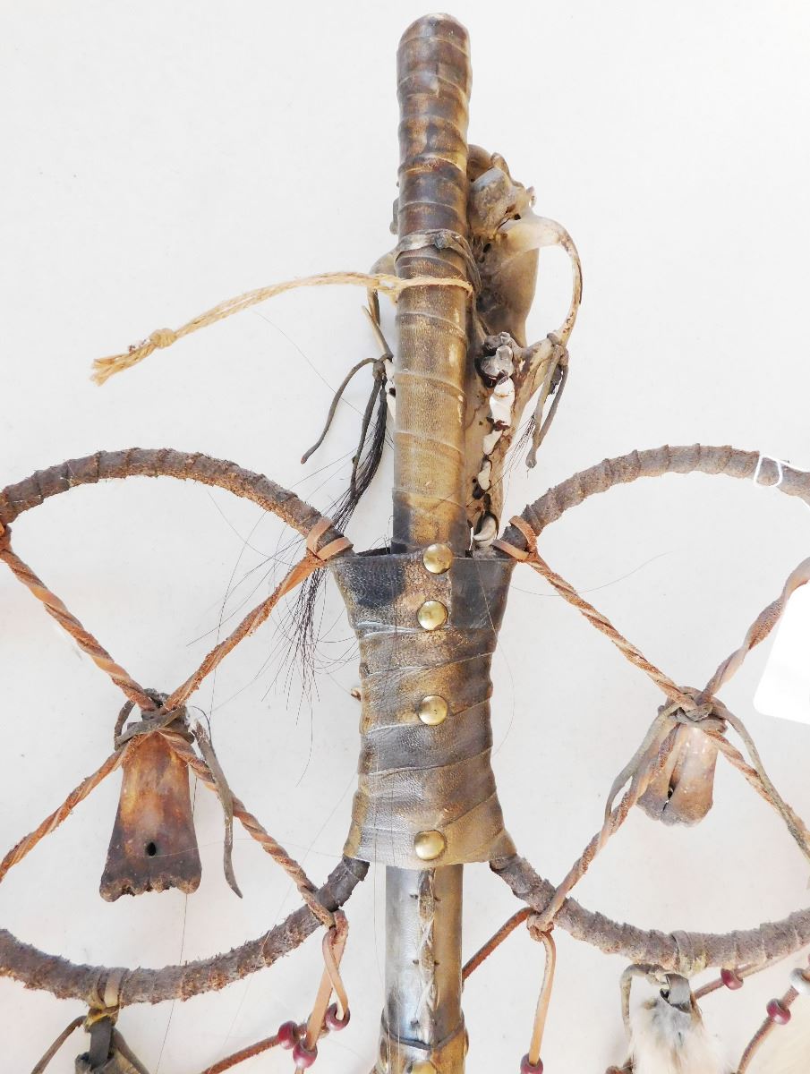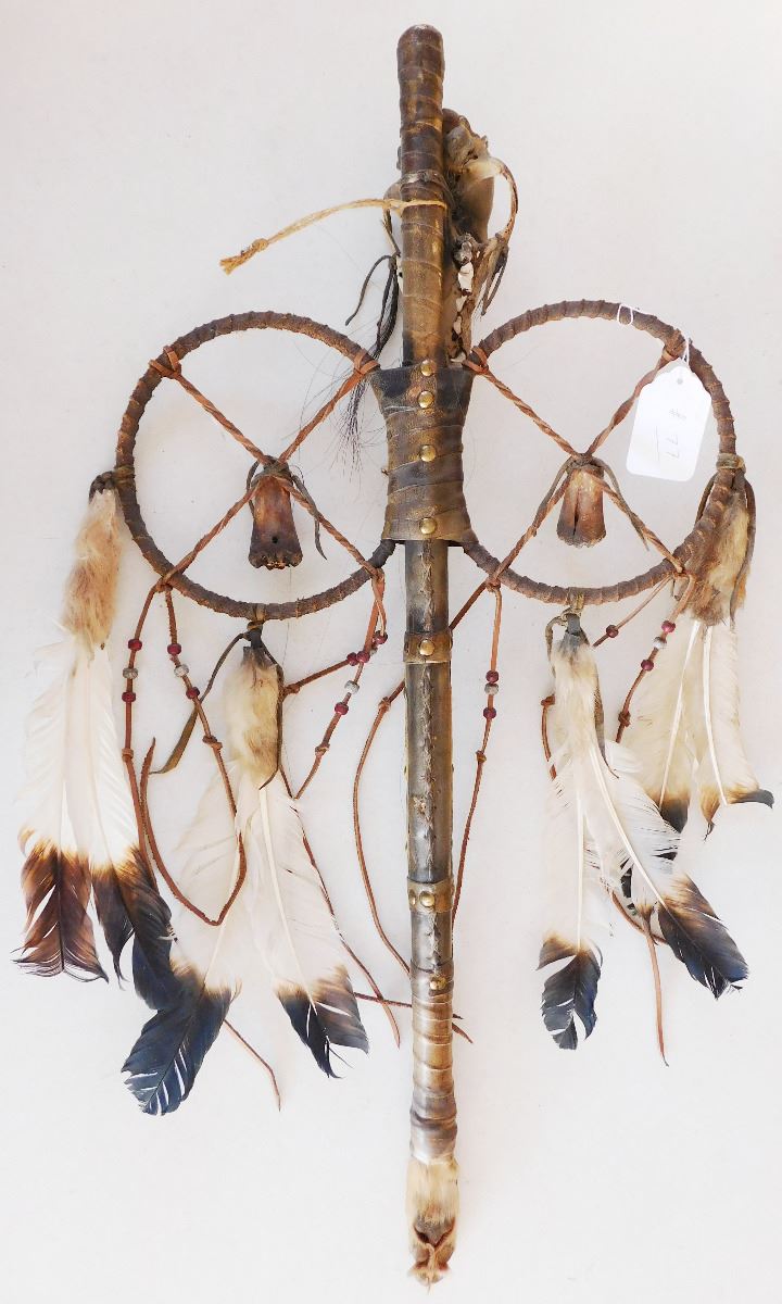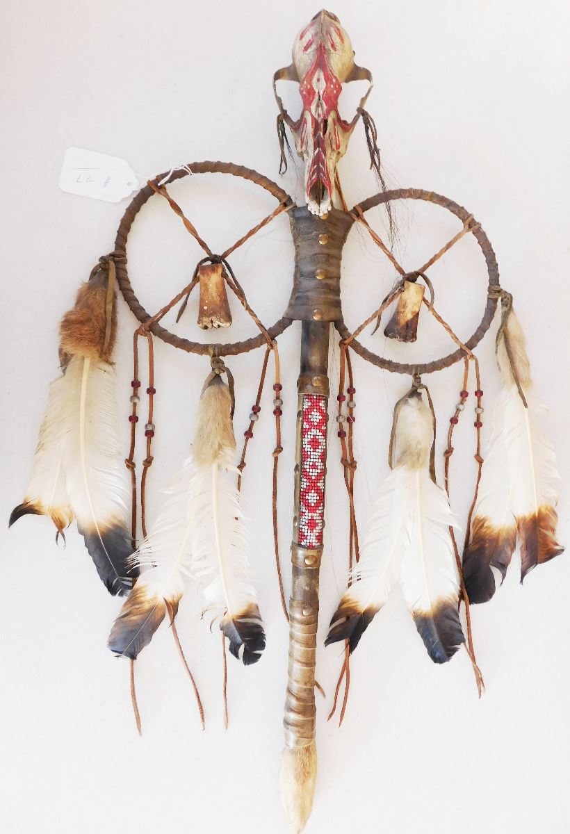 Plains Indian Coyote Medicine Wand, circa 1900. Item is made of feathers, skull bone, fur, rawhide, wood, glass beads and brass tacks. Item measures 31" x 15" x 5". Sioux, Dakota. Much polish on handle from use. Condition: Some wear, good condition, see images. Shipping: $50.
